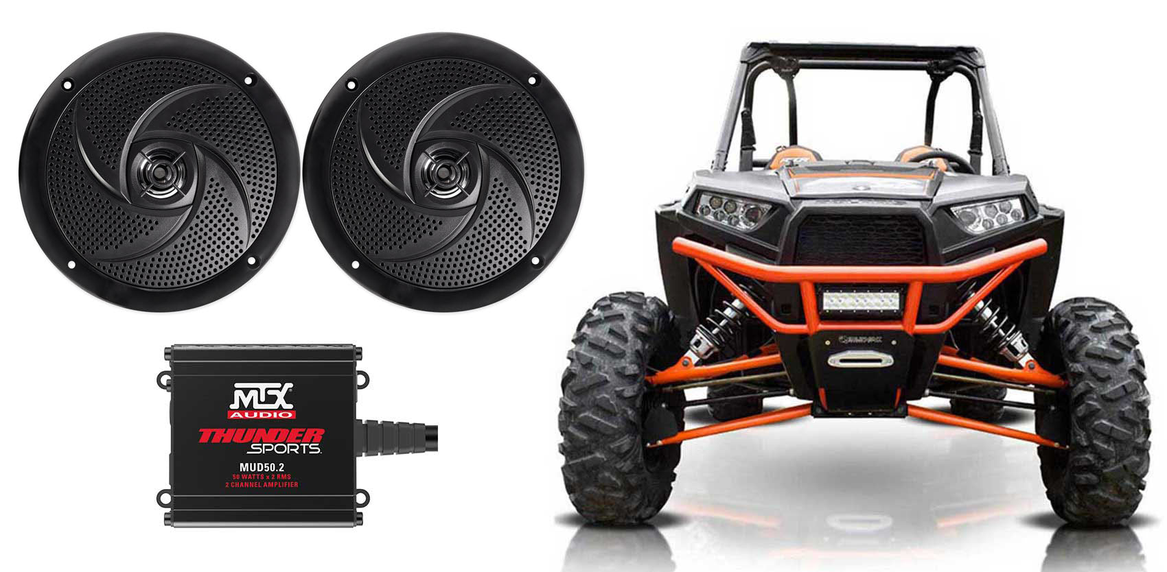 • Impedance: 4 Ohms. Frequency Response: 60Hz – 18KHz. Sensitivity: 90 dB. Total Diameter: 7.32 inches. Cutout Diameter: 5.31 inches. Total Height: 1.57 inches. Mounting Depth: 0.925 inches. Features: MTX MUD50.2 100 Watt 2-Channel Amp For Polaris RZR/ATV/UTV/Cart. Compact Design Enables Installation Anywhere. Conformal Coated Printed Circuit Board that Resists Moisture. Fixed Crossover