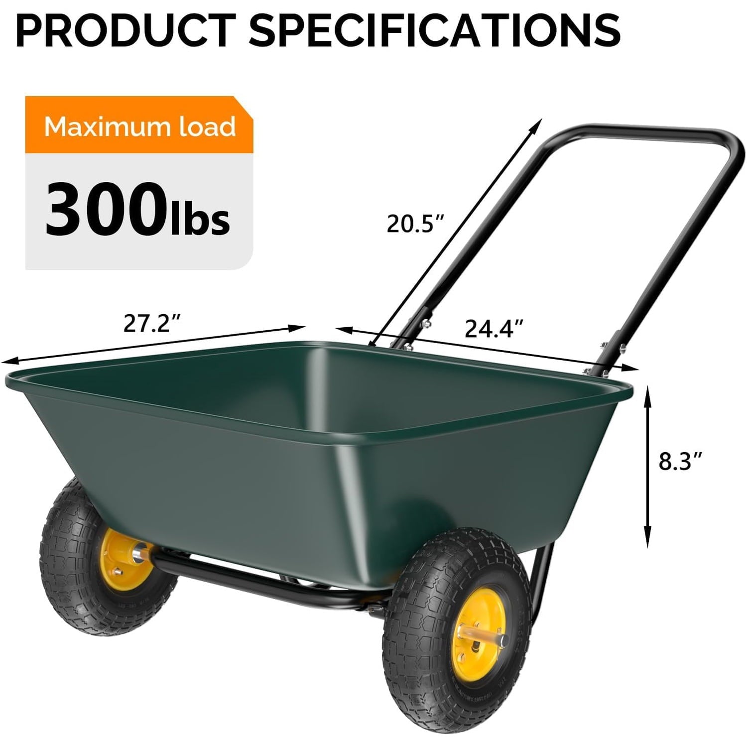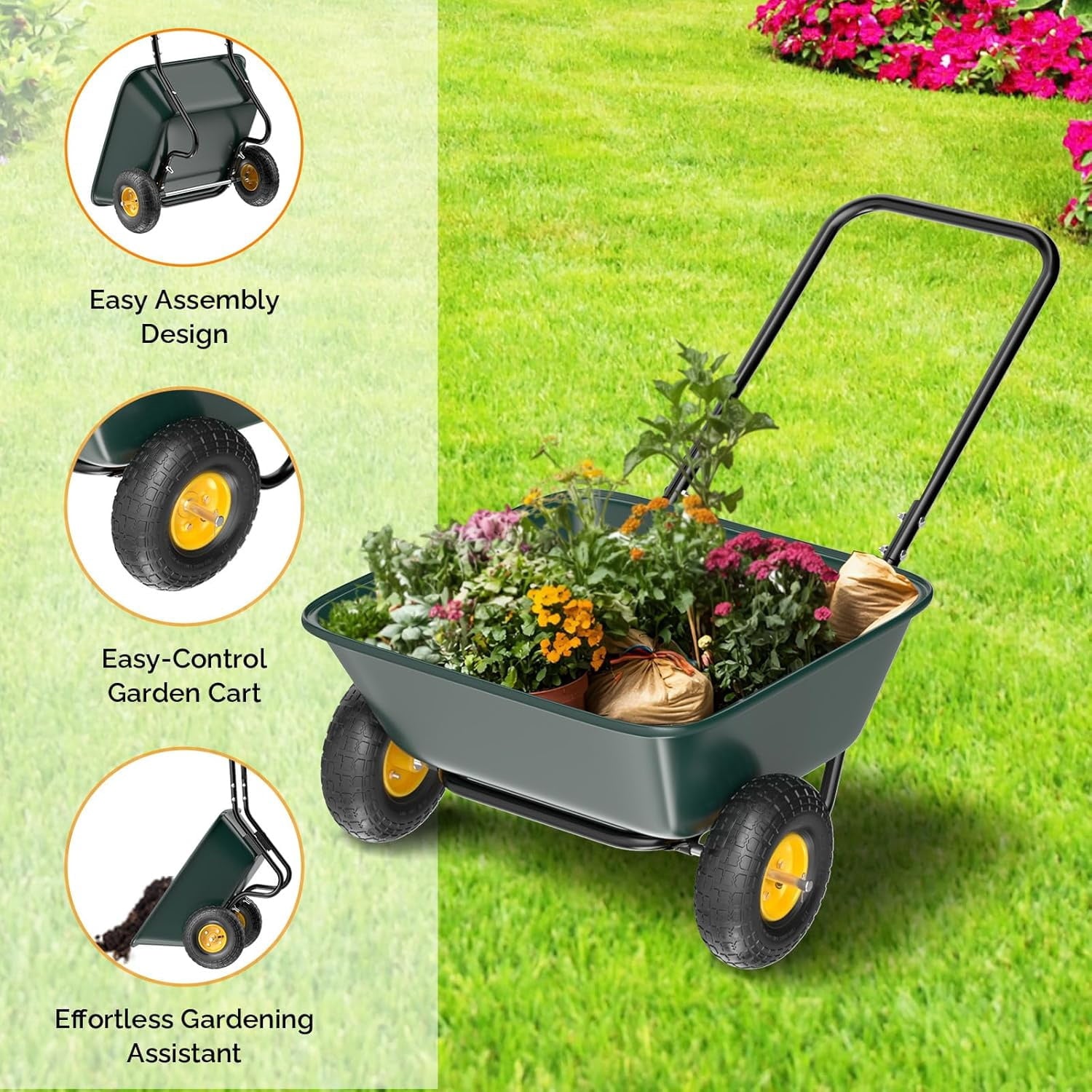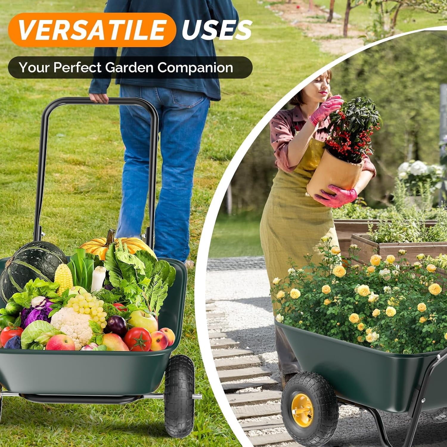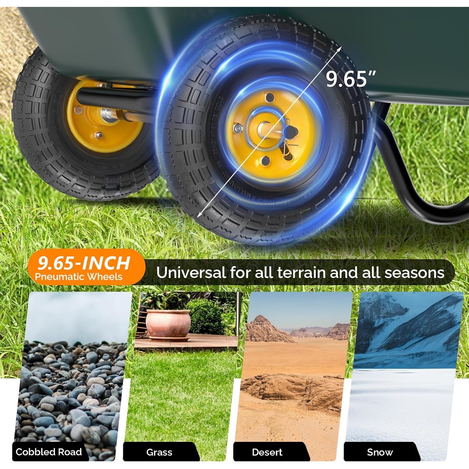 - Stable Dual-Wheel Design: Unlike wheel barrels with two wheel, this model is equipped with two 9.65-inch pneumatic tires, ensuring smooth maneuverability across rough terrain, lawns, and gravel paths. The balanced two-wheel system provides superior stability