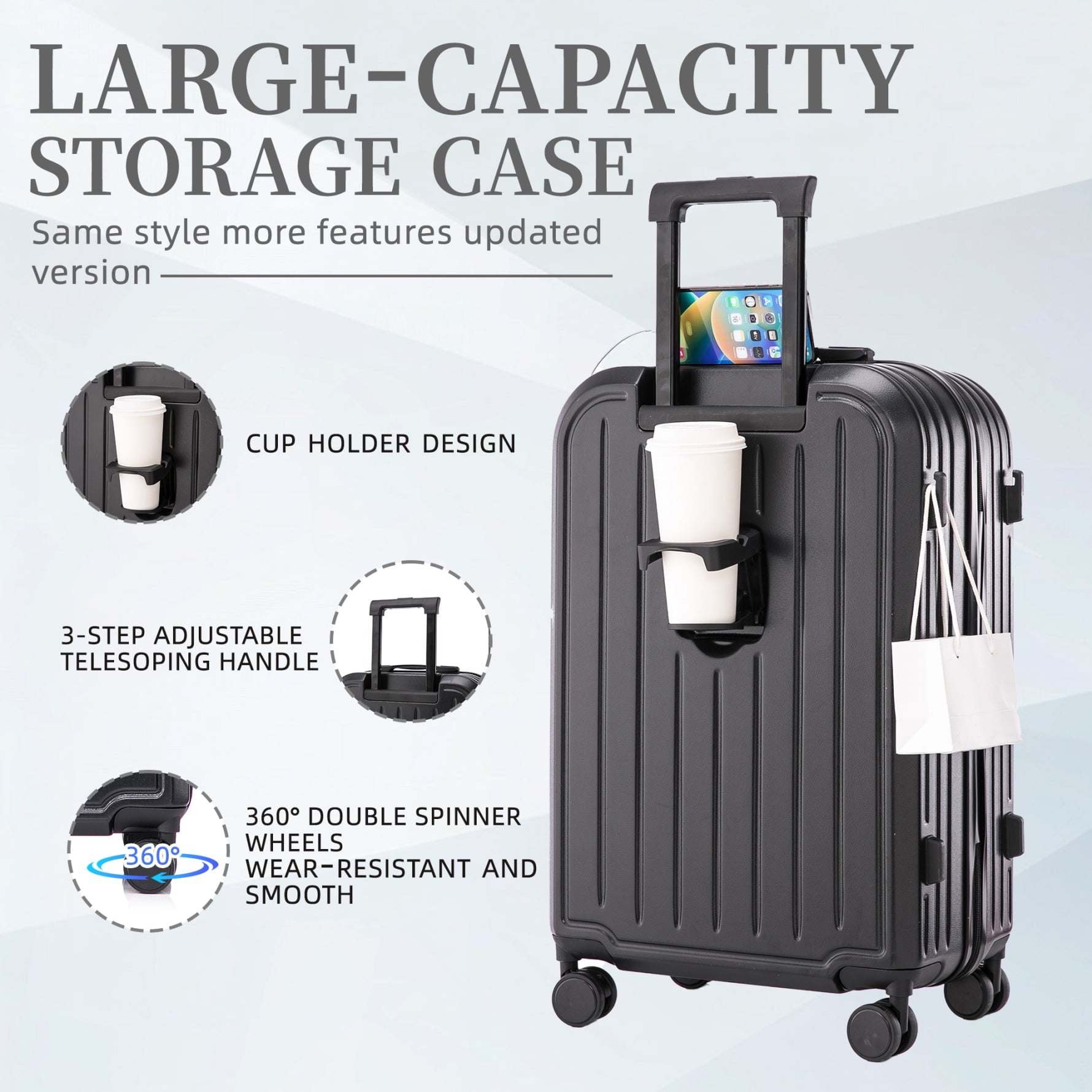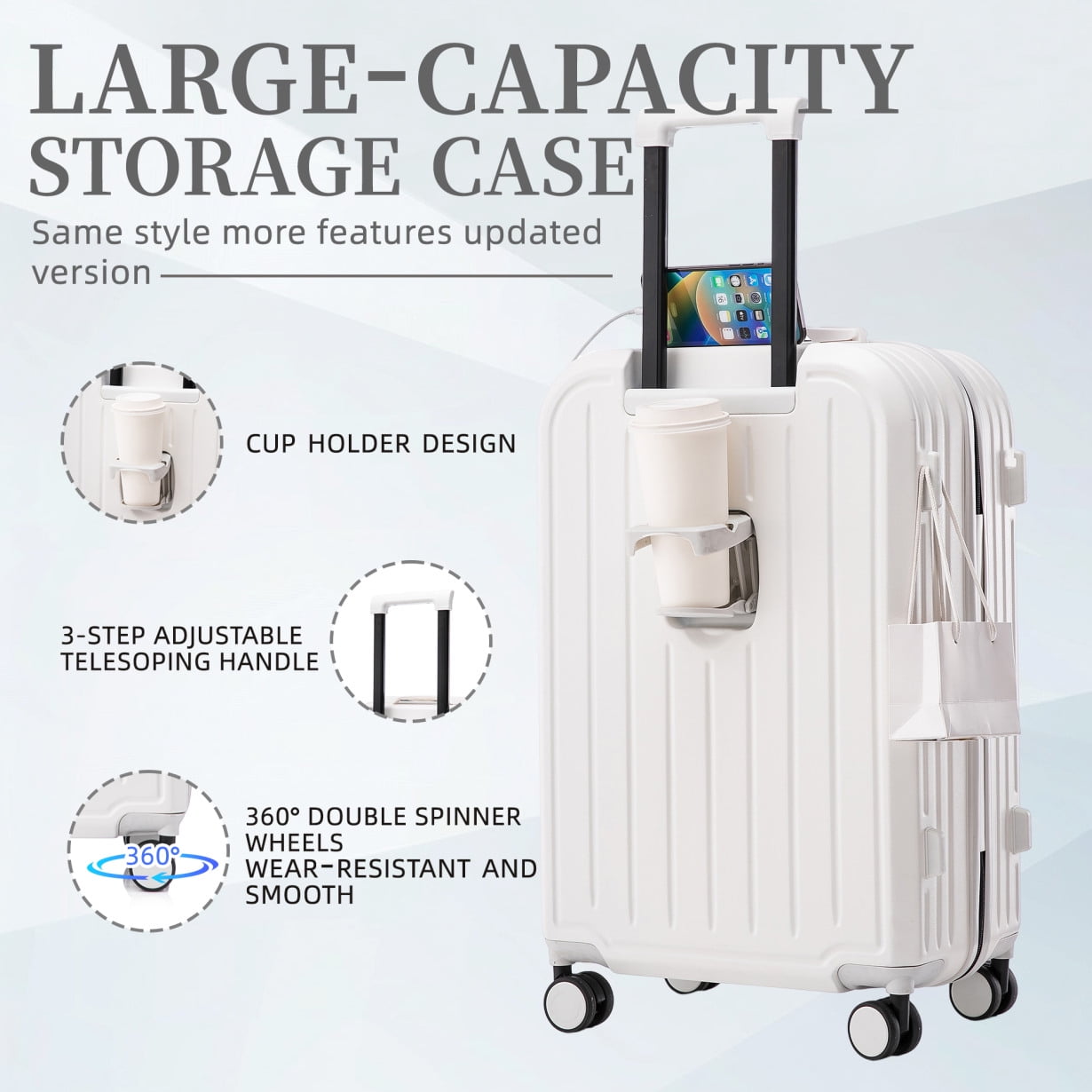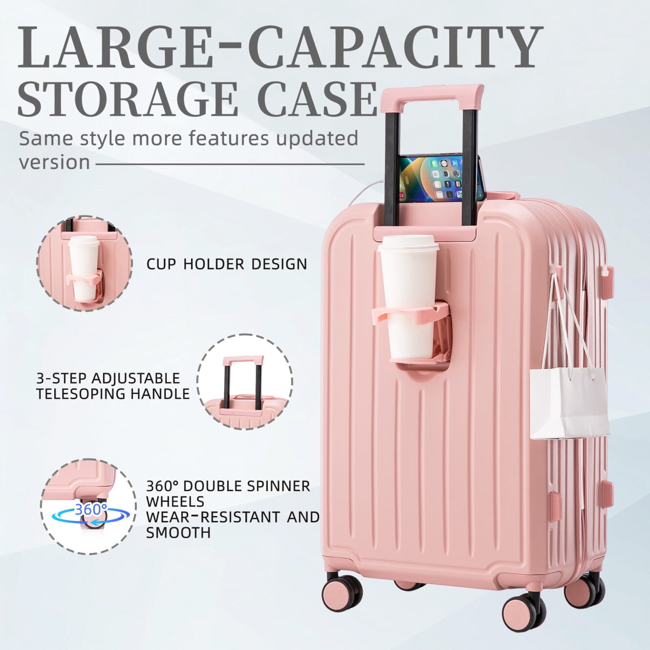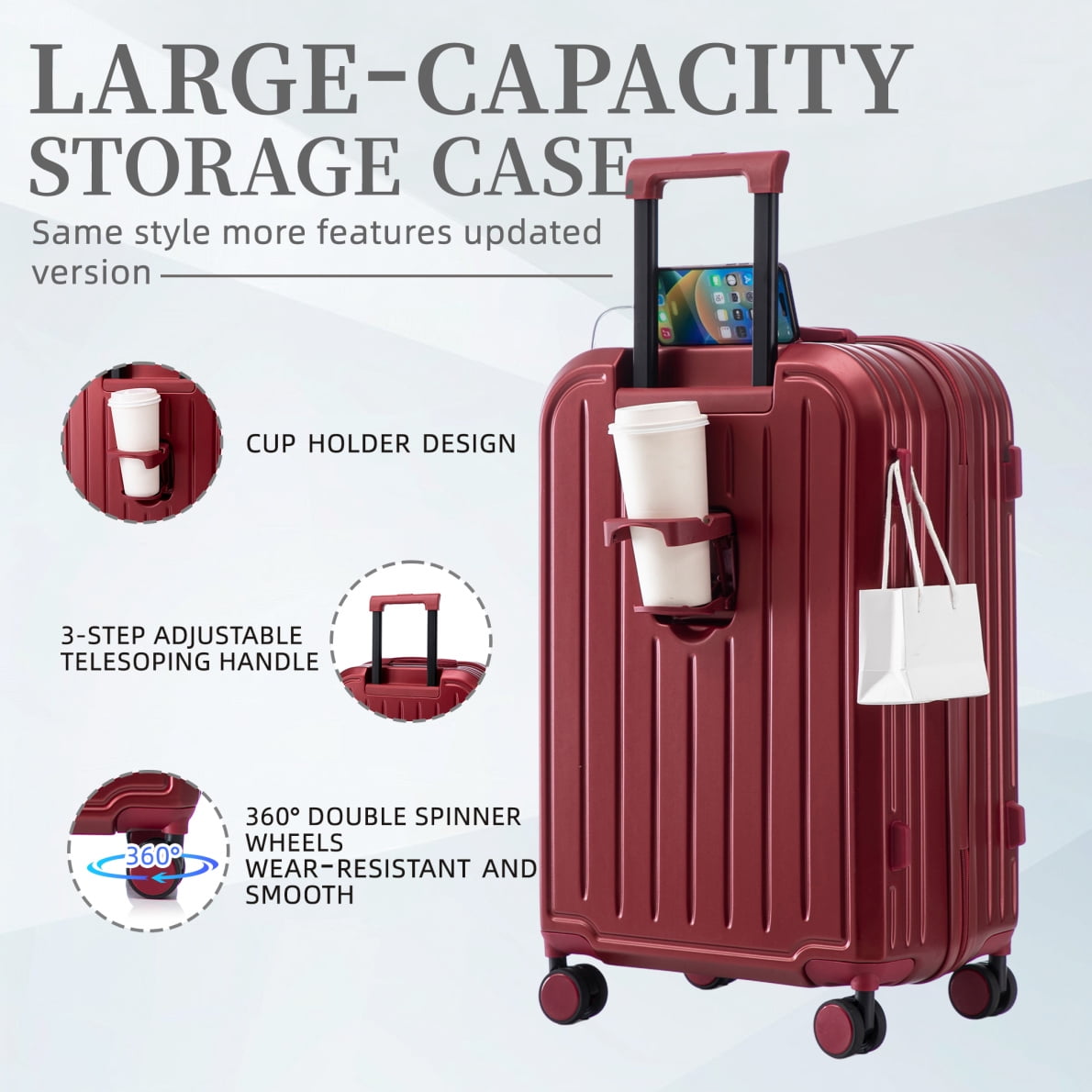 - 360-degree silent spinner wheels ensure effortless directional control across carpets and pavement, supported by reinforced side feet that prevent tipping – enjoy smooth transitions between transportation modes without wobbling.