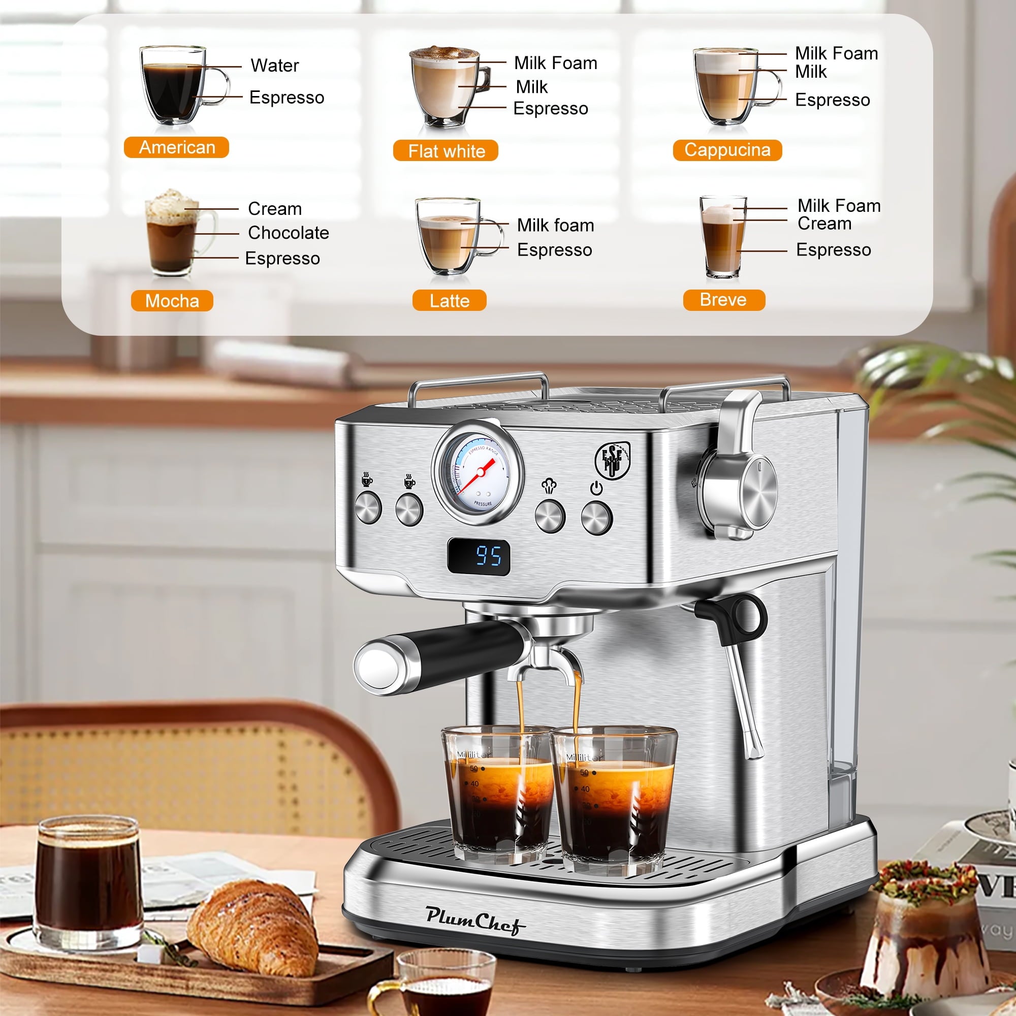 Discover the art of coffee with this 20-bar espresso machine, perfect for brewing a variety of professional-quality beverages. With a milk frother, customizable shot sizes, it’s easy to create barista-style drinks at home. The stainless steel design is both durable and stylish, while the removable water tank simplifies cleaning. Your purchase includes a comprehensive starter kit for all your coffee brewing adventures.