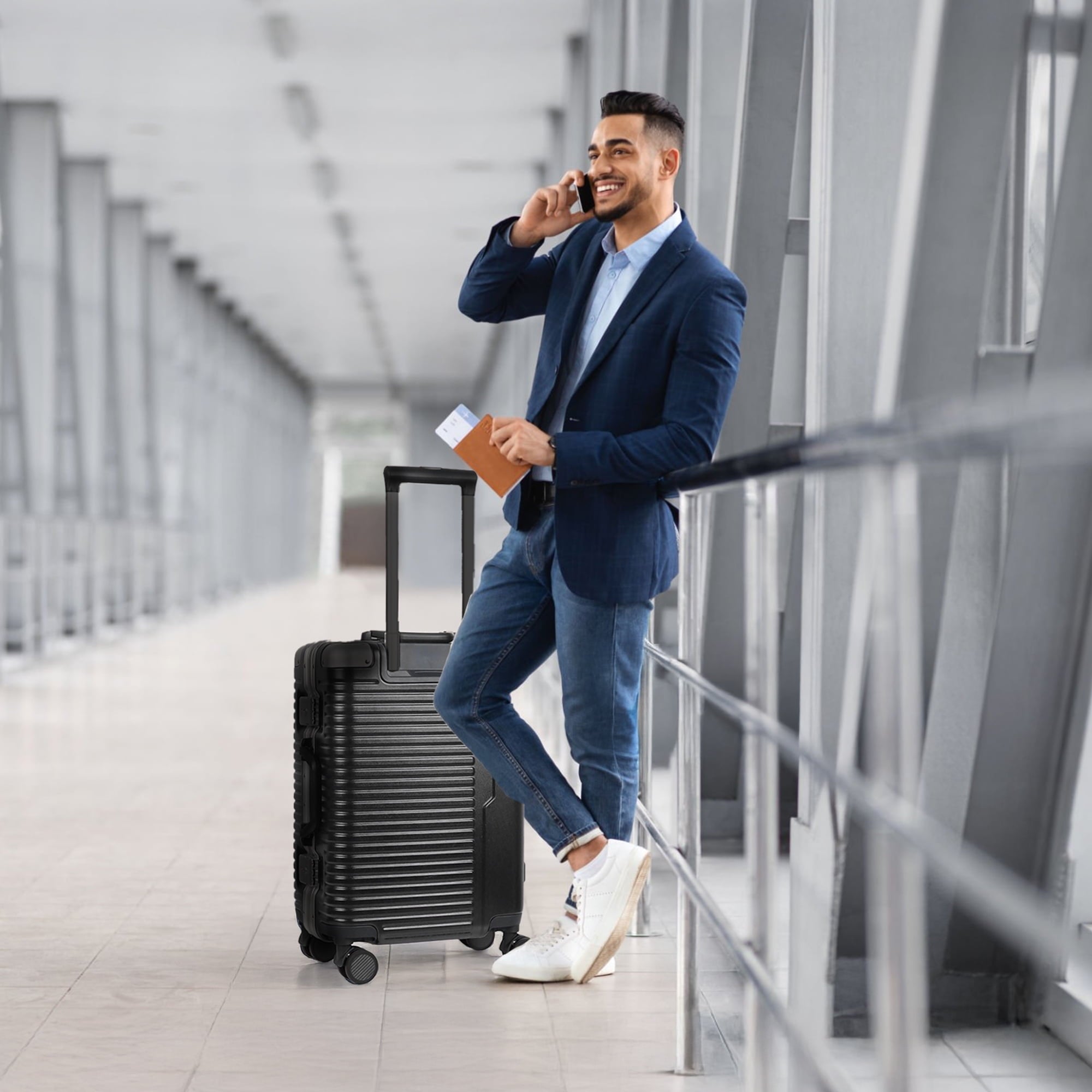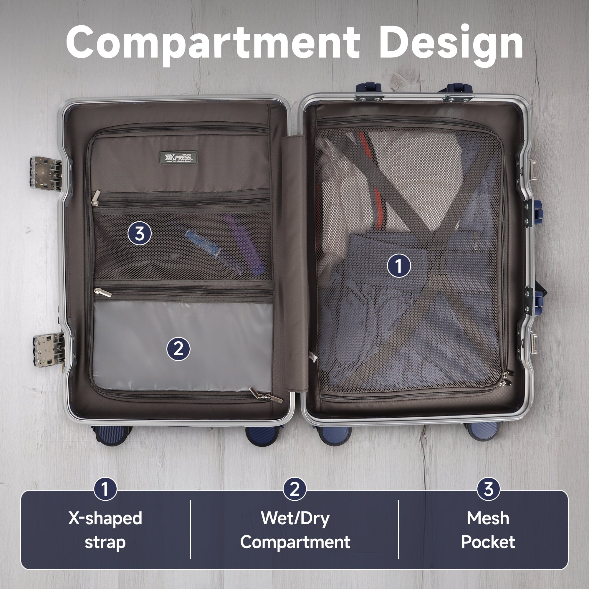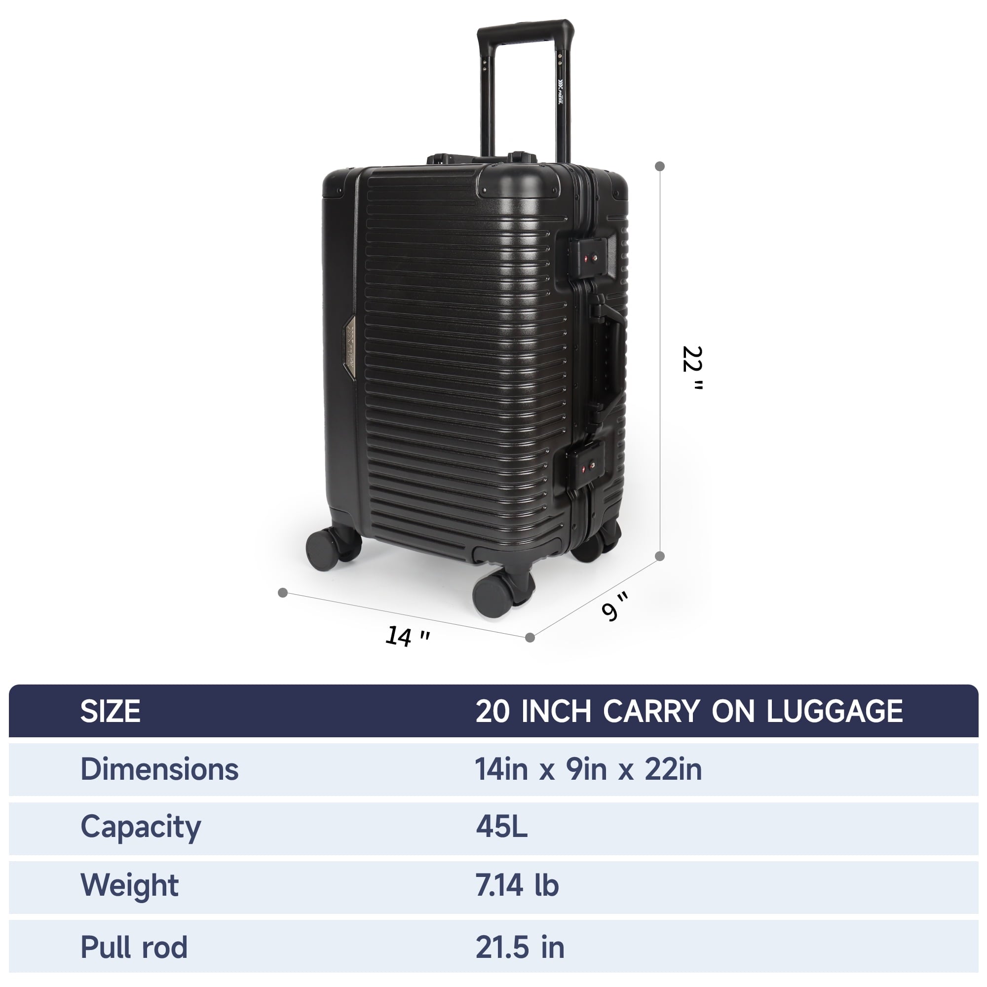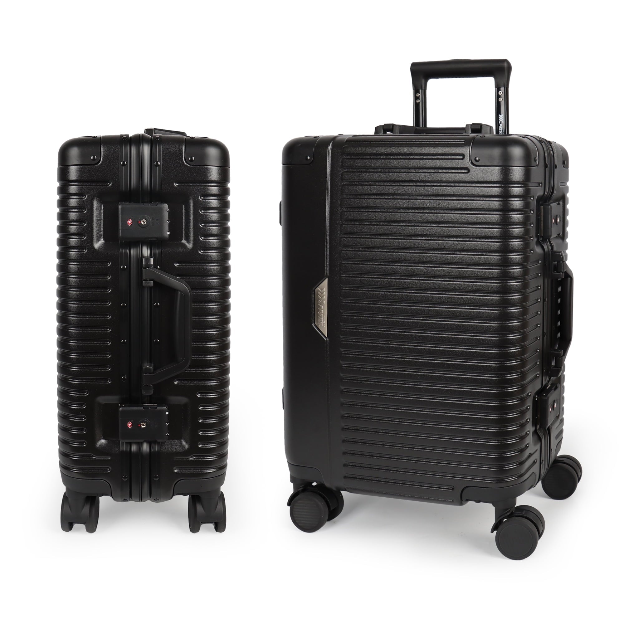 A reliable carry-on suitcase is essential for every trip. New York Xpress Aluminum Frame Carry-On Luggage combines exceptional style with outstanding durability, with dimensions that meet most airline cabin baggage requirements so it fits easily in the overhead compartment. Features an aluminum frame with a polycarbonate shell for strength and impact resistance, and a polyester-lined interior. The interior includes cross straps and a wet-dry compartment to keep your belongings neatly organized, while two TSA-approved locks ensure your items remain secure. A shock-absorbing rebound side handle provides a stable, comfortable grip, and smooth 360° spinner wheels together with an adjustable telescopic handle make it effortless to travel anywhere. Choose the NY Xpress zipperless luggage and begin your journey in style!