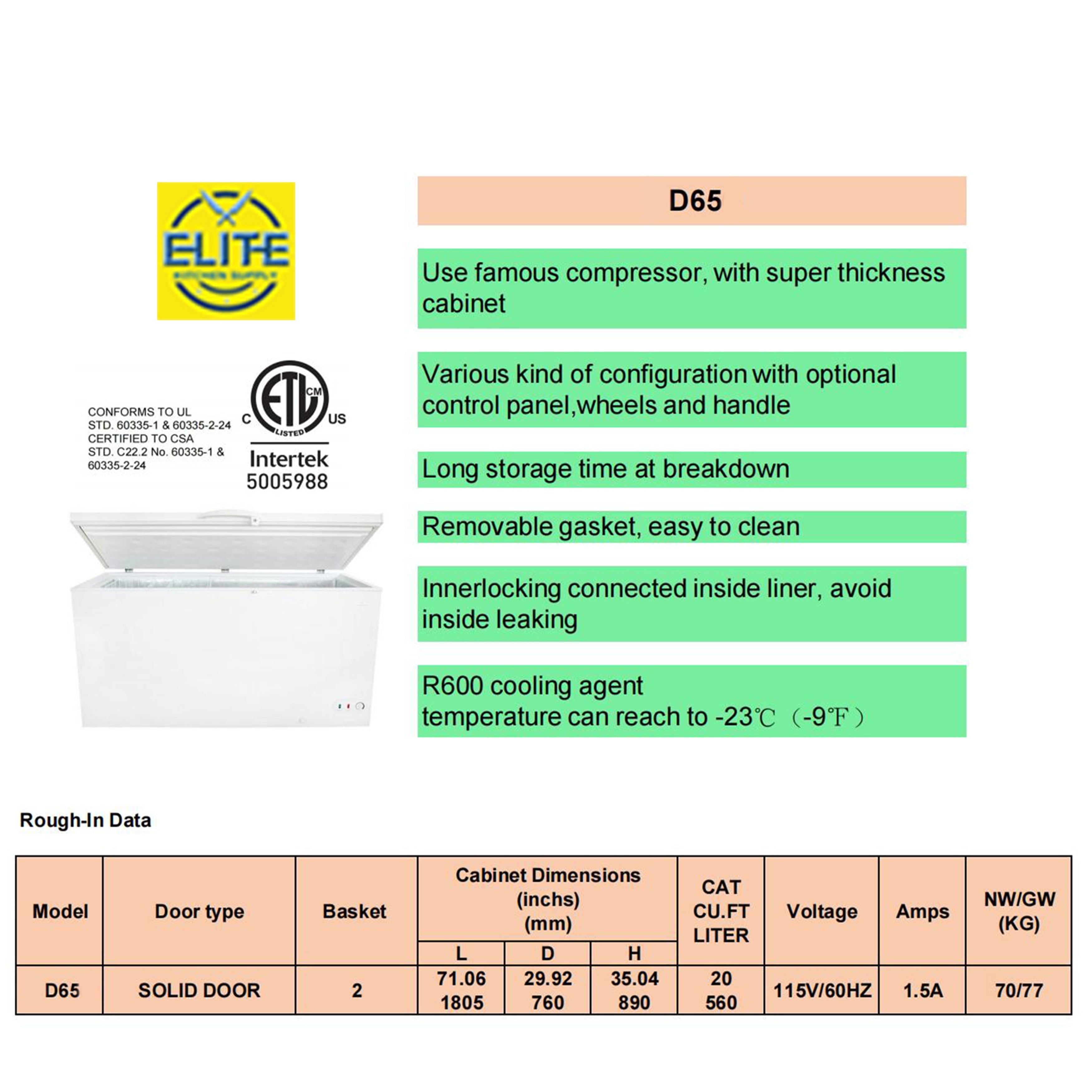 • Spacious 20 cu. ft. capacity commercial chest freezer with a depth of 71 inches to accommodate all your storage needs