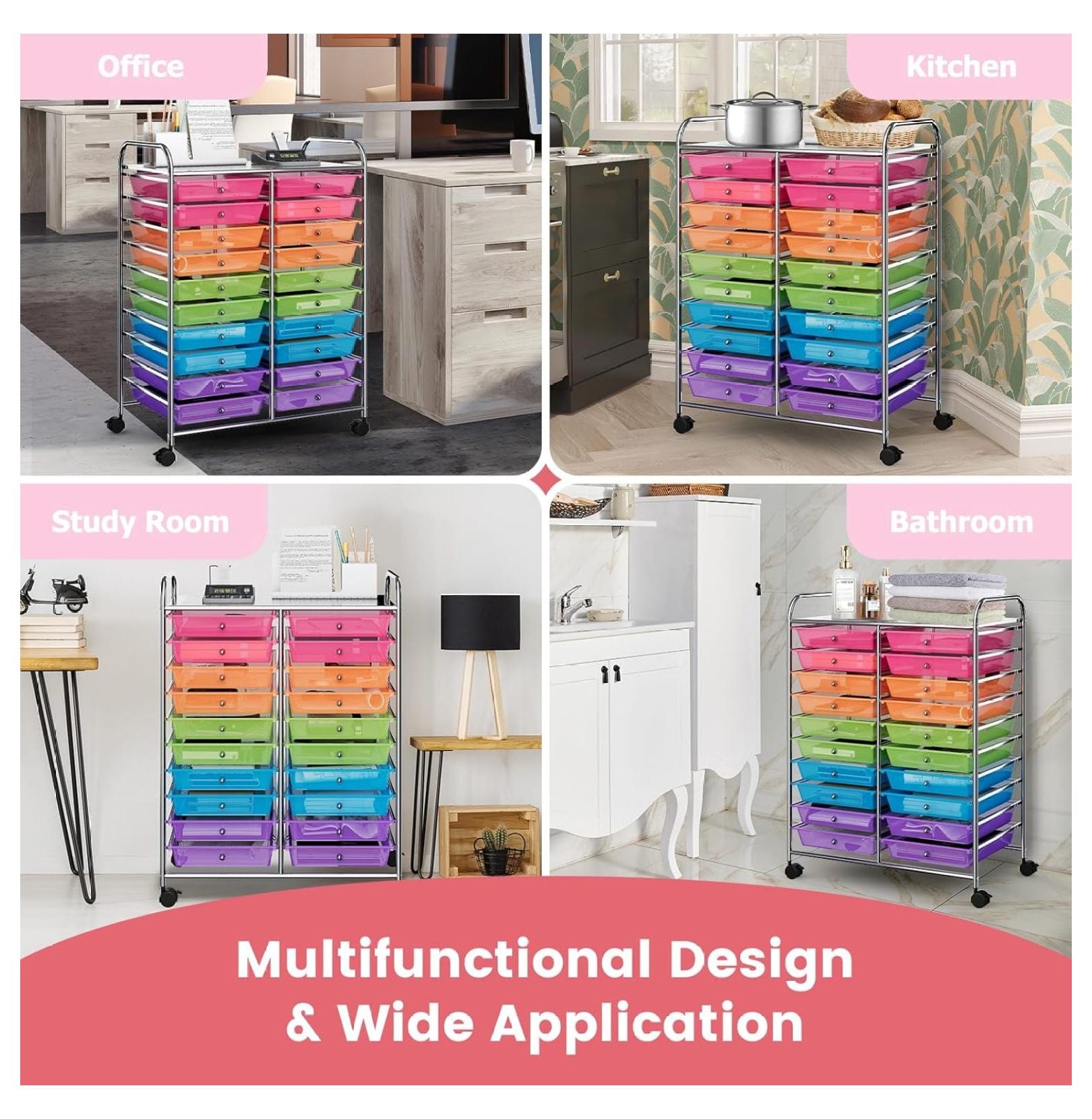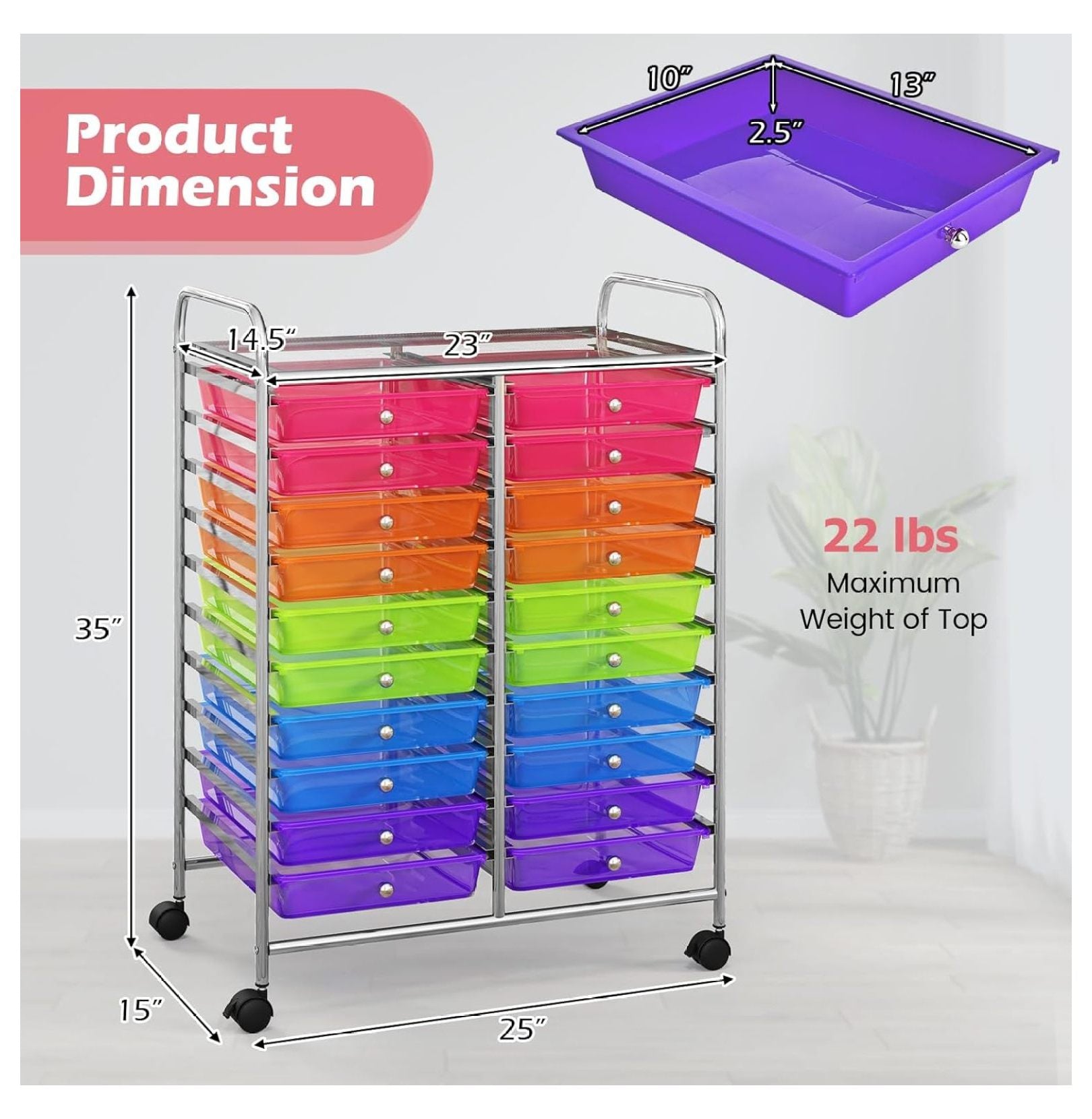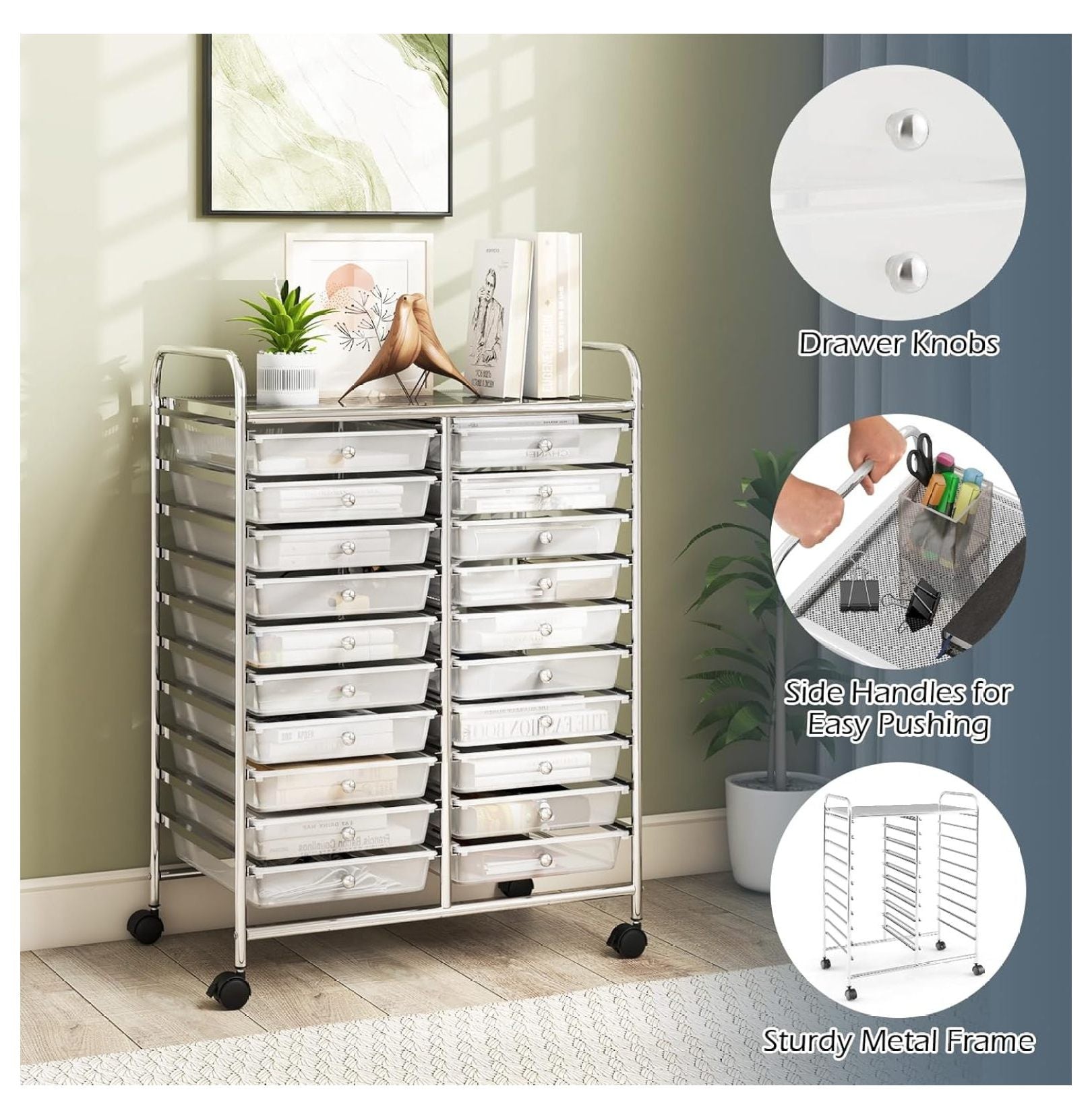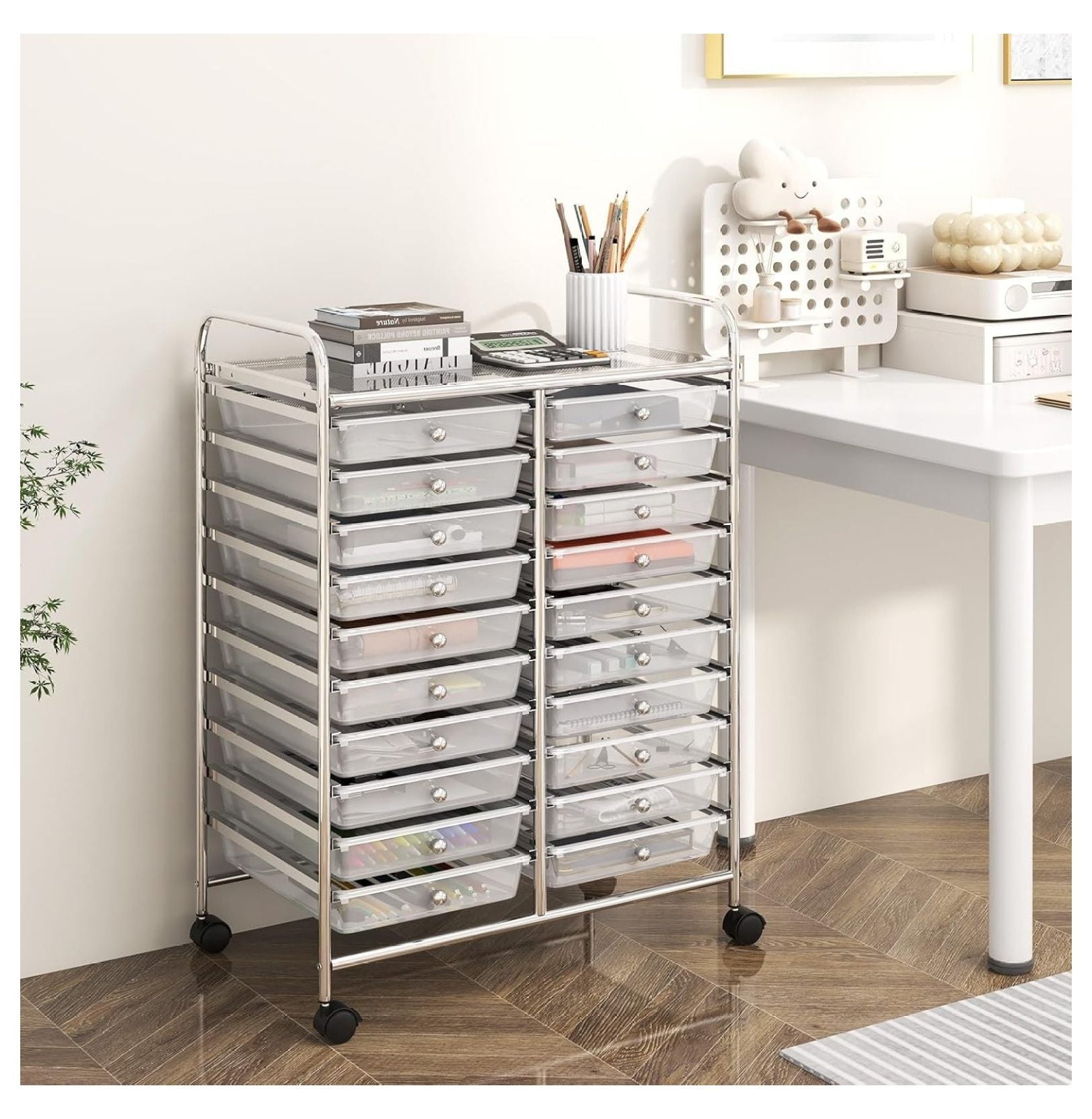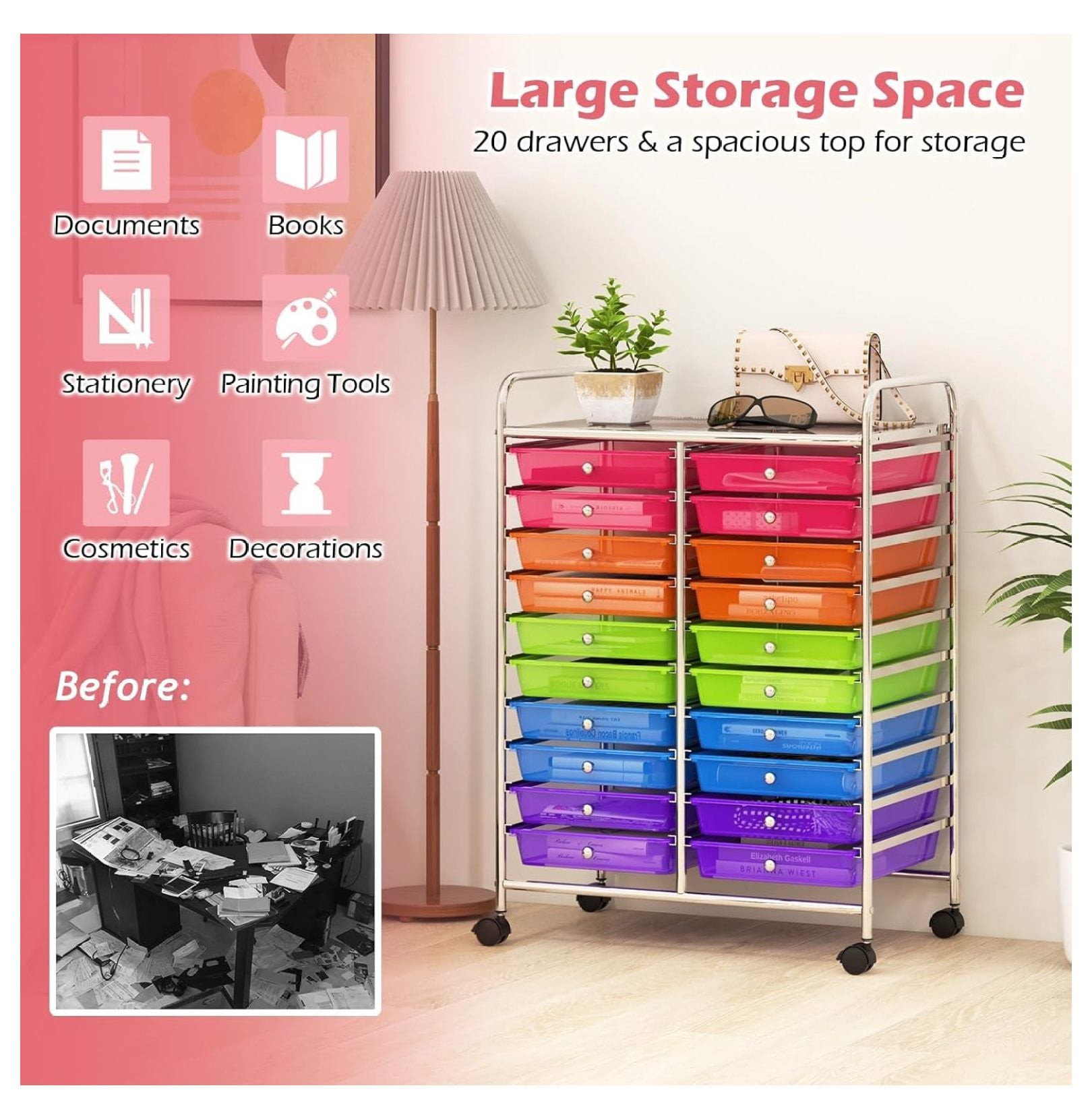 - Spacious Storage Space: With 20 drawers and 1 additional organizer top, this rolling storage cart allows you to put different belongings with ease, such as cosmetics, tools, papers, clothes, towels and kitchen supplies, etc. And the round knob on each drawers is convenient for you to open.