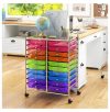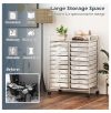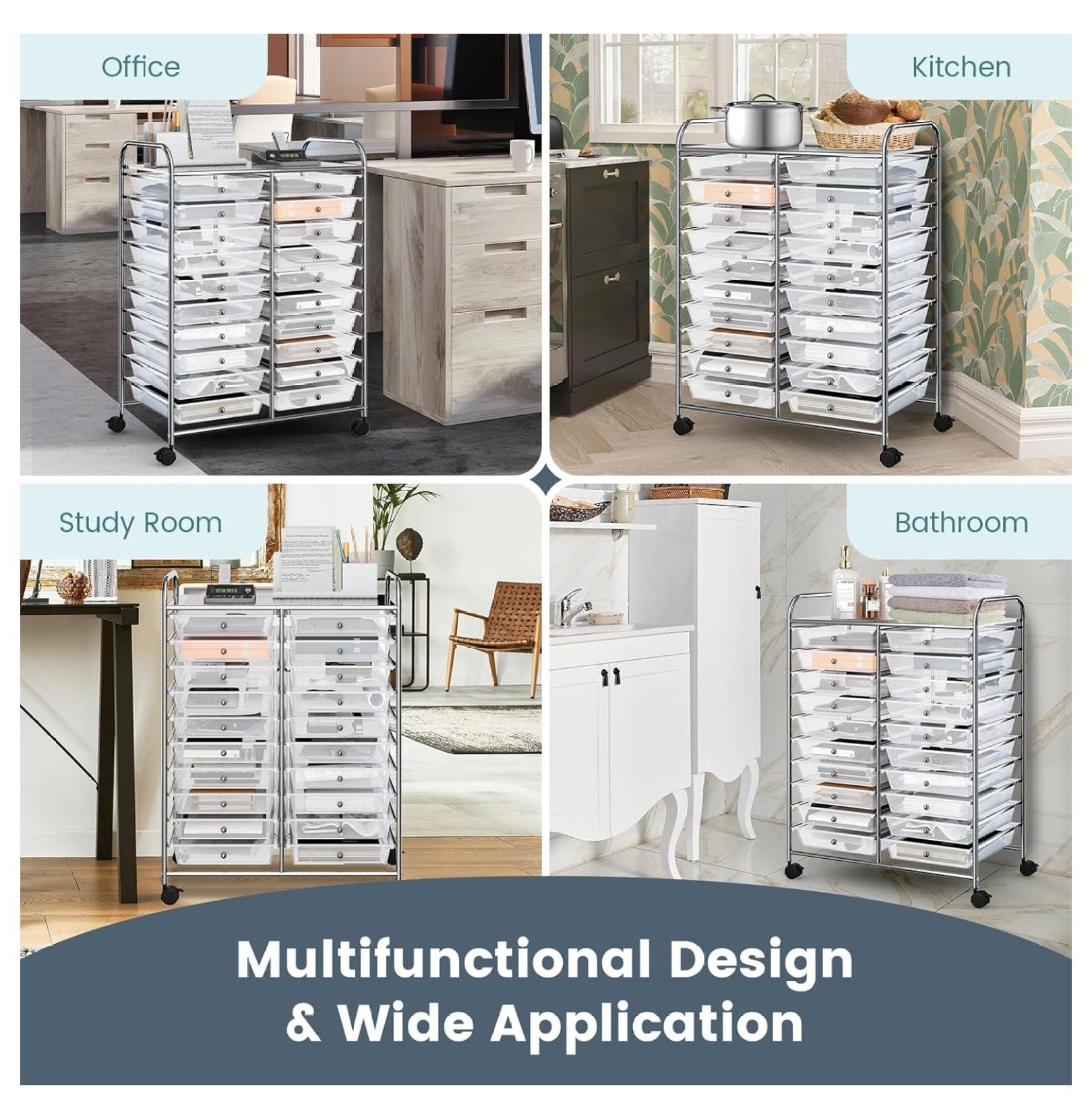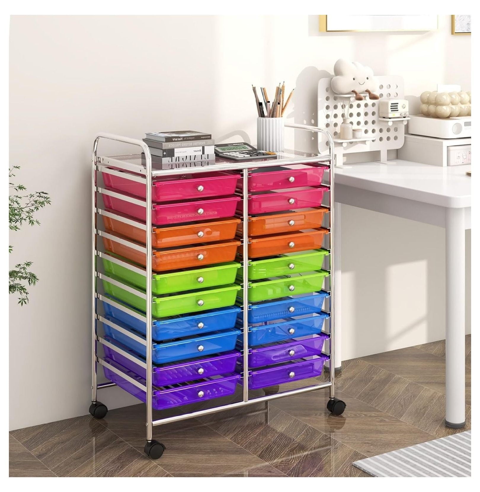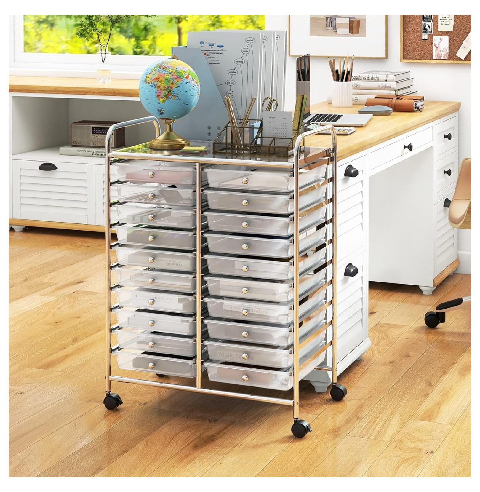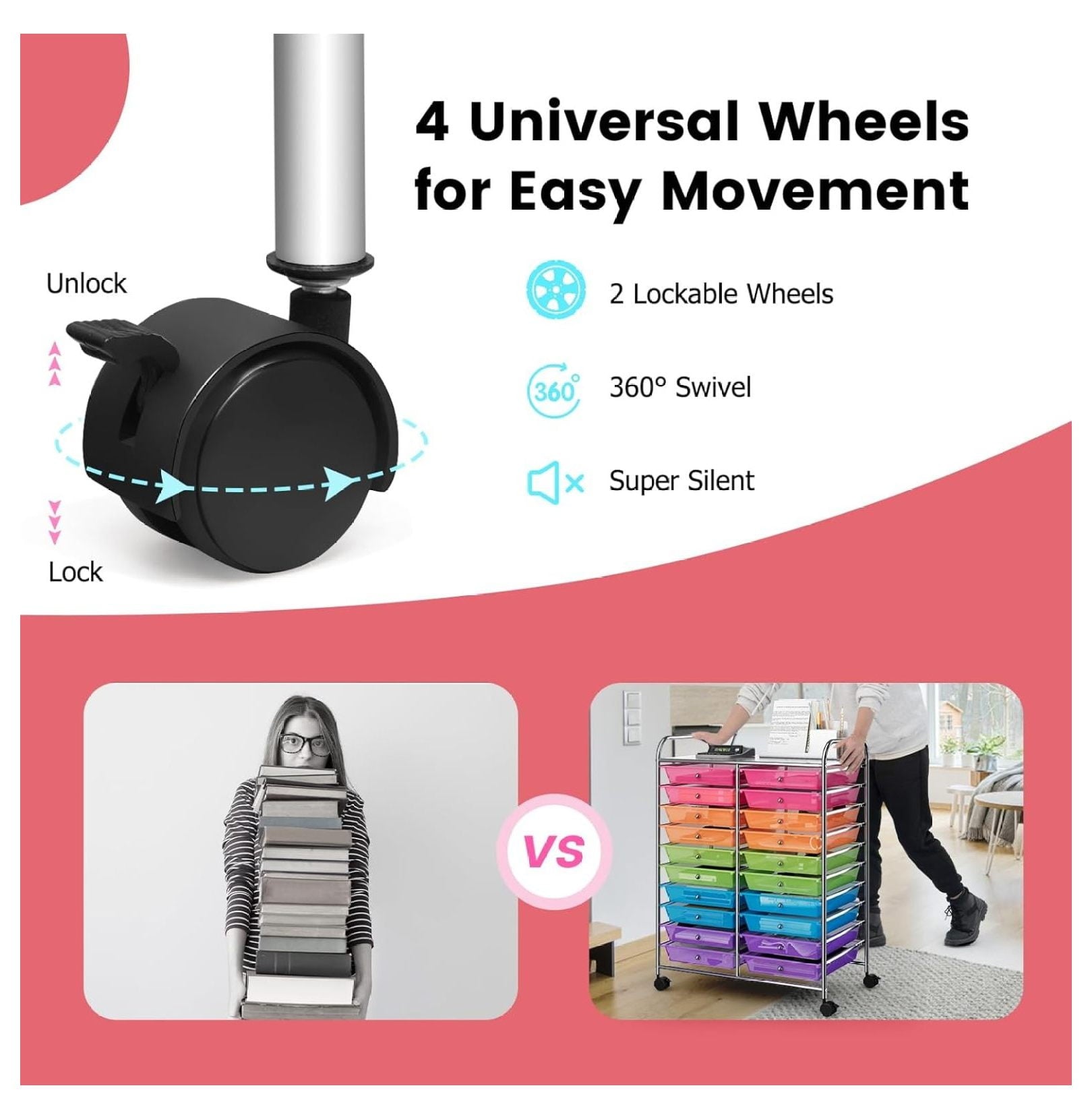 - Spacious Storage Space: With 20 drawers and 1 additional organizer top, this rolling storage cart allows you to put different belongings with ease, such as cosmetics, tools, papers, clothes, towels and kitchen supplies, etc. And the round knob on each drawers is convenient for you to open.