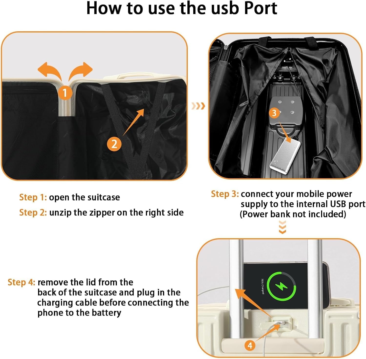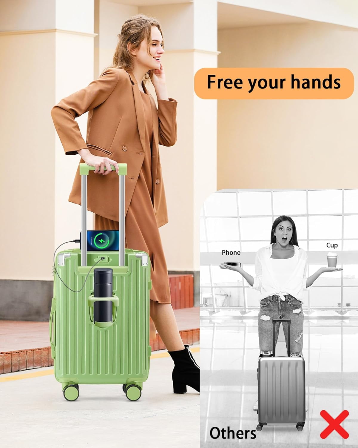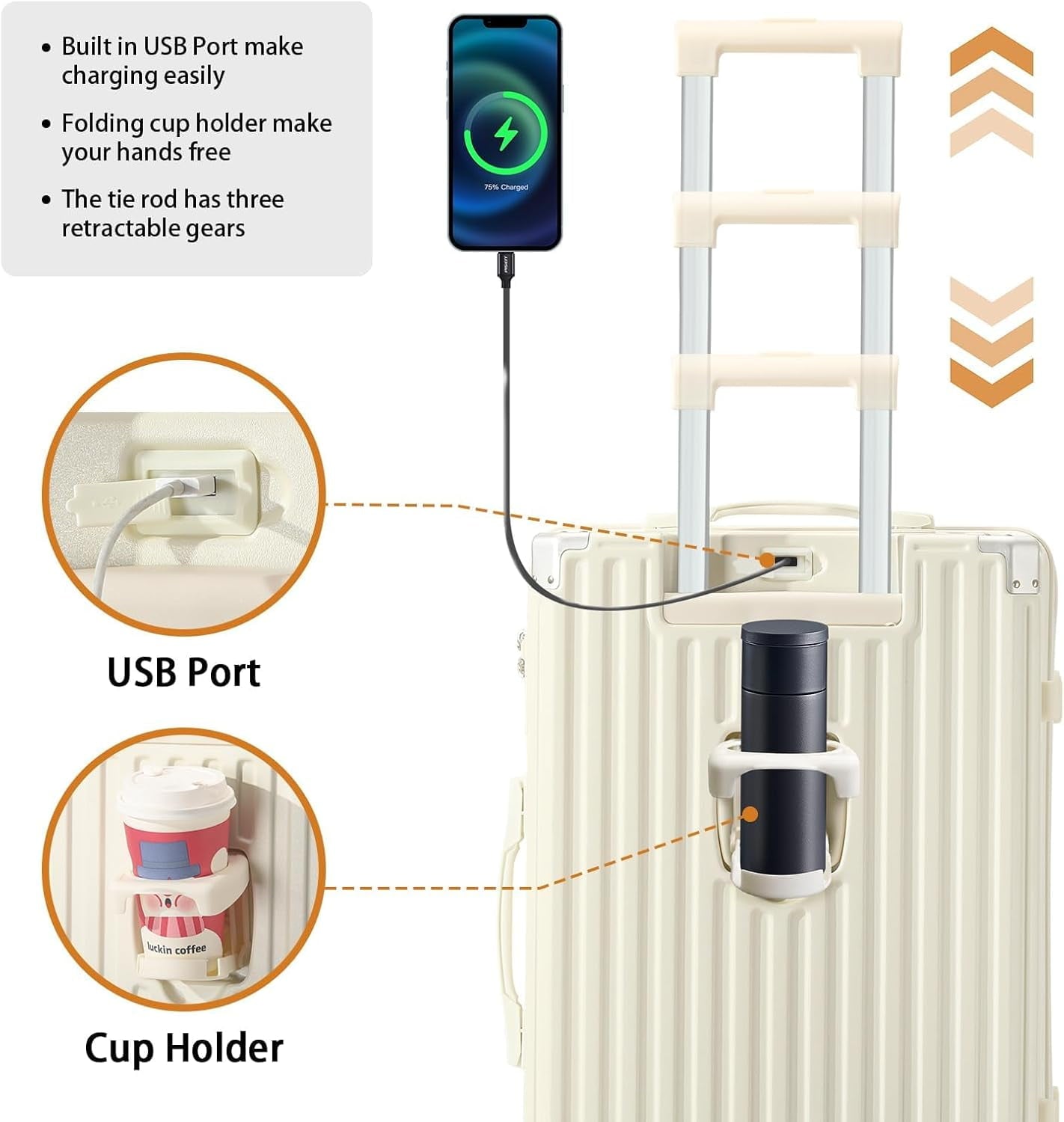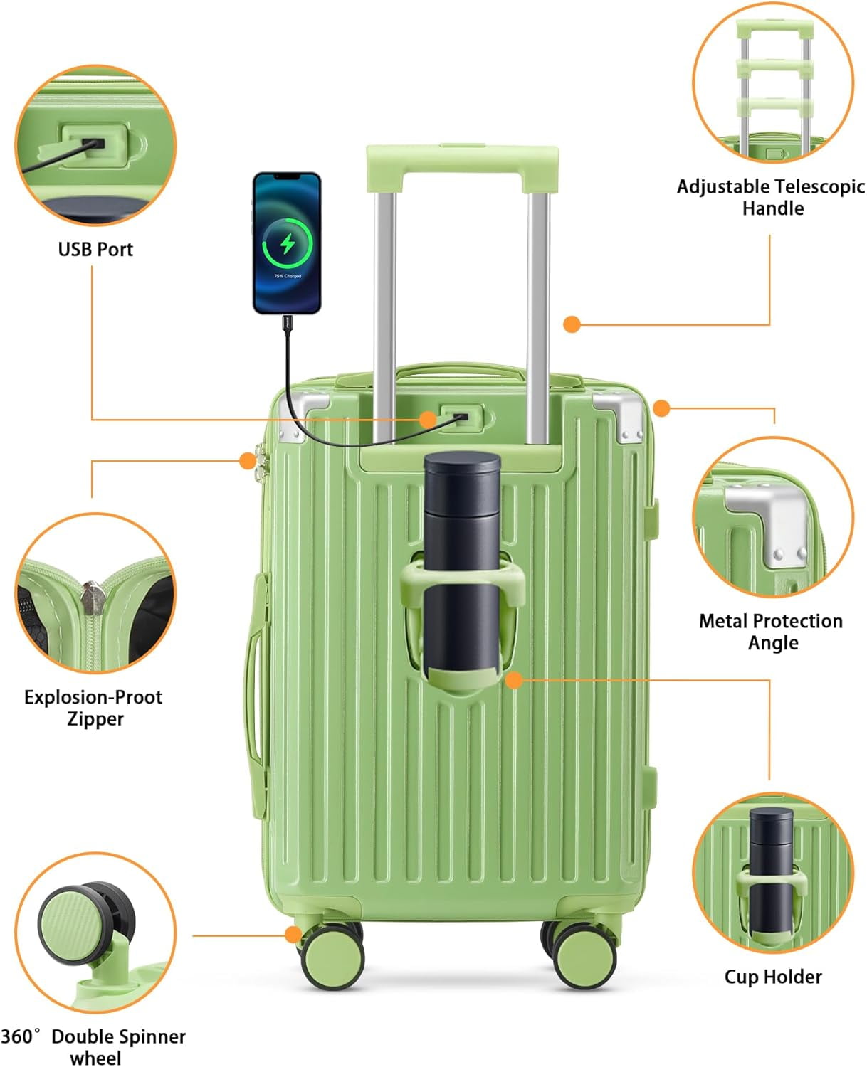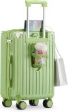 【Multifunctional Holder Design AND Built-in USB Port】This Luggage with cup holder especially designed water cup holder and hook on the luggage case, all is to provide a comfortable and convenient travel experience.The suitcase with a built-in USB port(Power bank not included), provide quick connection to your portable electronic device for a quick charge.Not worried about the phone is out of power any more.
