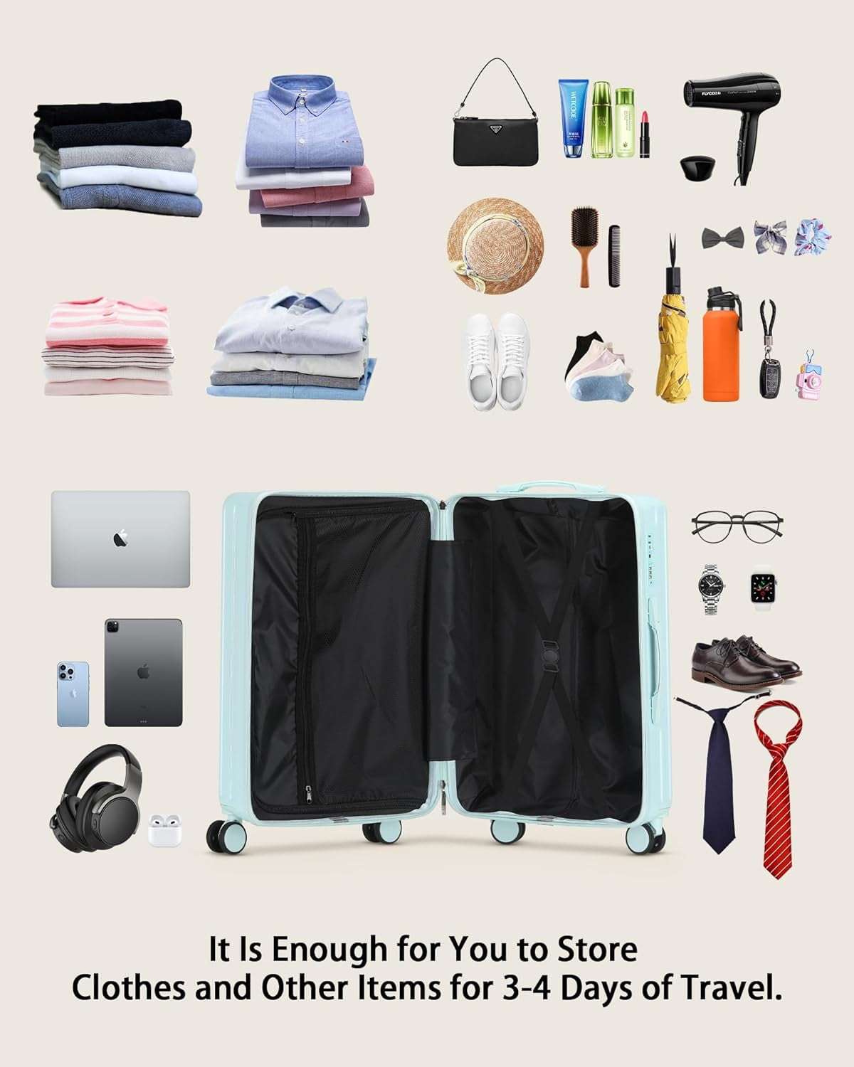 【Lightweight Durable Material AND Airline Approved Luggage】The luggage is crafted from PC (Polycarbonate) material, Enhance the suitcase to be even lighter yet sturdy, ensuring prolonged durability for extended use.Dimensions: 36.5x24x57cm (including wheel and handle height), weighing only 3.1kg. The 20in carry-on luggage is designed to meet the carry-on limitations of most major airlines worldwide. It fits conveniently in the overhead compartment, eliminating additional handling fees.
