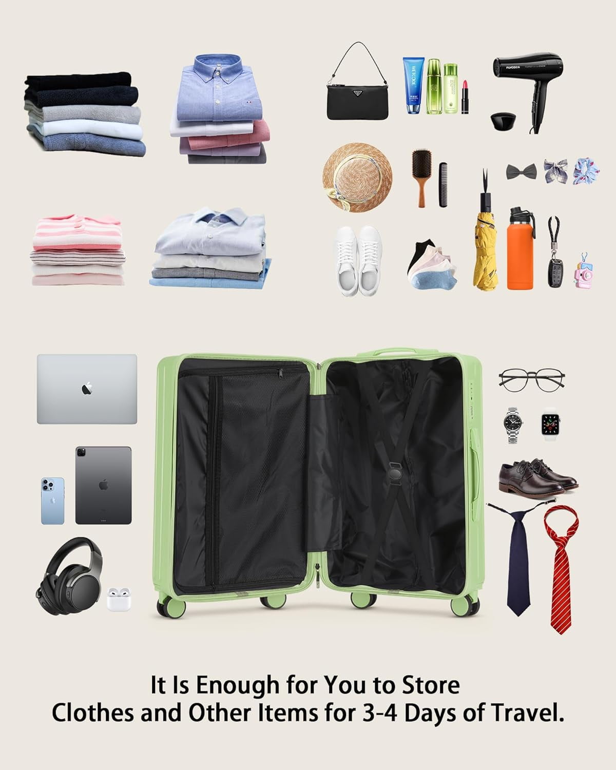 【Pack Smart, Pack More】Our travel suitcase optimizes your packing volume. Its twin main compartments, complete with compression straps, hold your clothes and belongings securely while reducing creases. A specially designed built-in pocket caters to smaller items. Every inch is thoughtfully designed to deliver maximum storage, so you can carry and travel more.