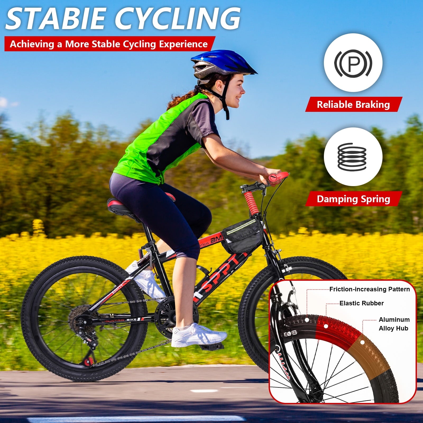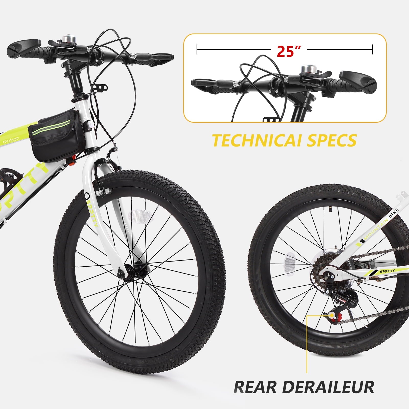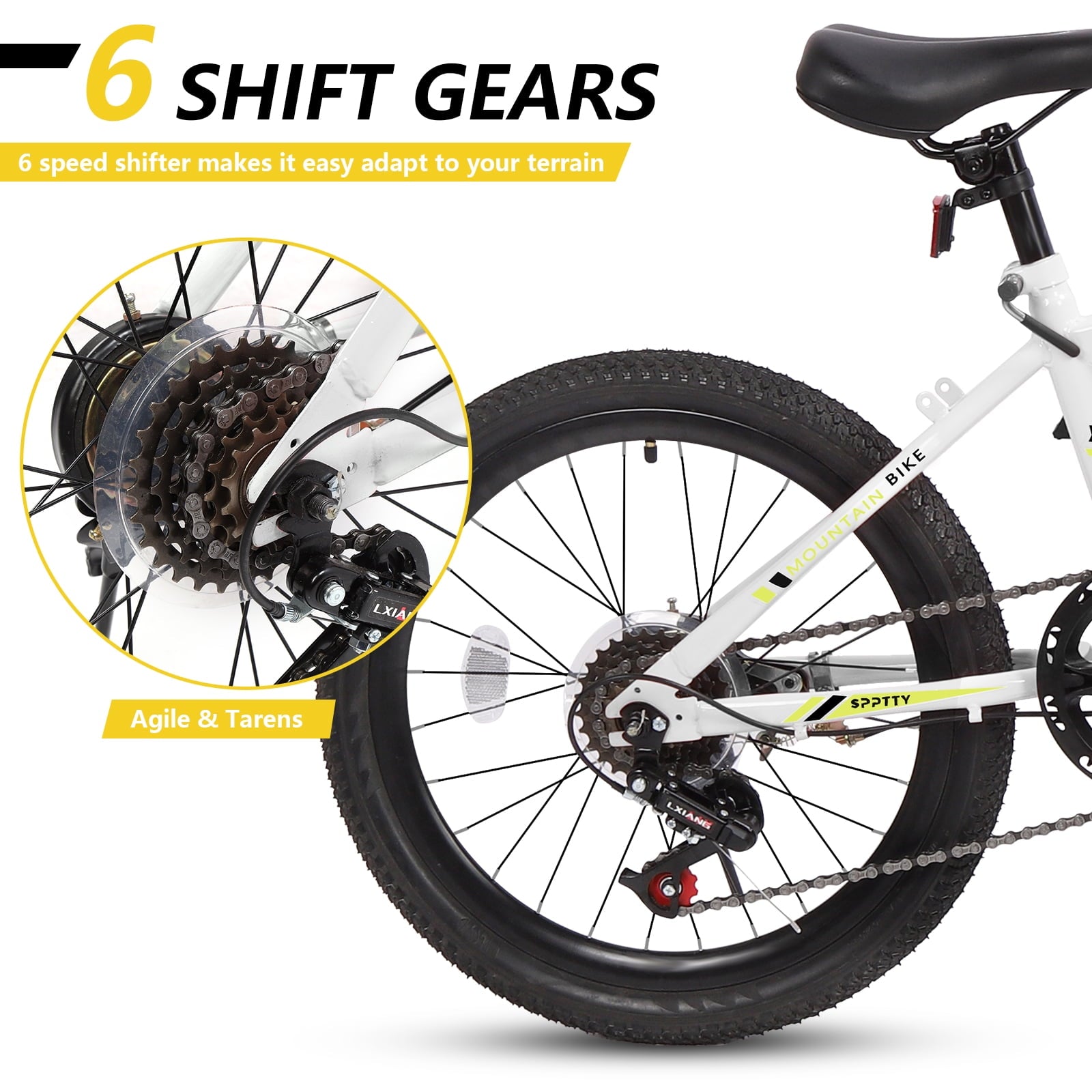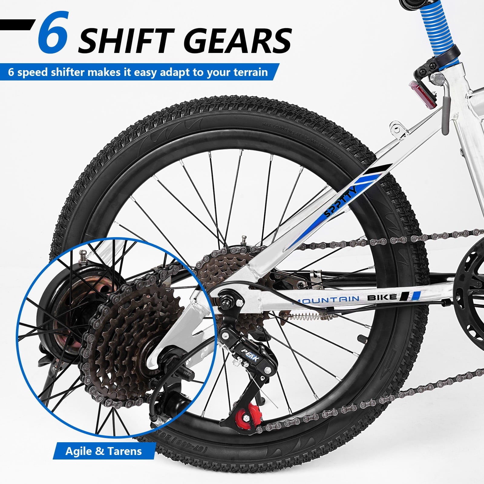 Discover the SPPTTY 20-24 inch Bike, a versatile mountain bike designed for men and women. Bicycles featuring a durable carbon steel frame, a suspension fork to absorb bumps, and 6-speed gears for easy terrain adaptation, this bike delivers a comfortable and reliable riding experience.The wide 2-inch tires provide excellent grip and stability, while the rear mechanical disc brakes ensure safe and reliable stopping power in any weather conditions.With an adjustable seat post and an aerodynamic triangular structure, this bike offers a customized fit and a sleek, sporty appearance, making it the perfect companion for your outdoor adventures.
