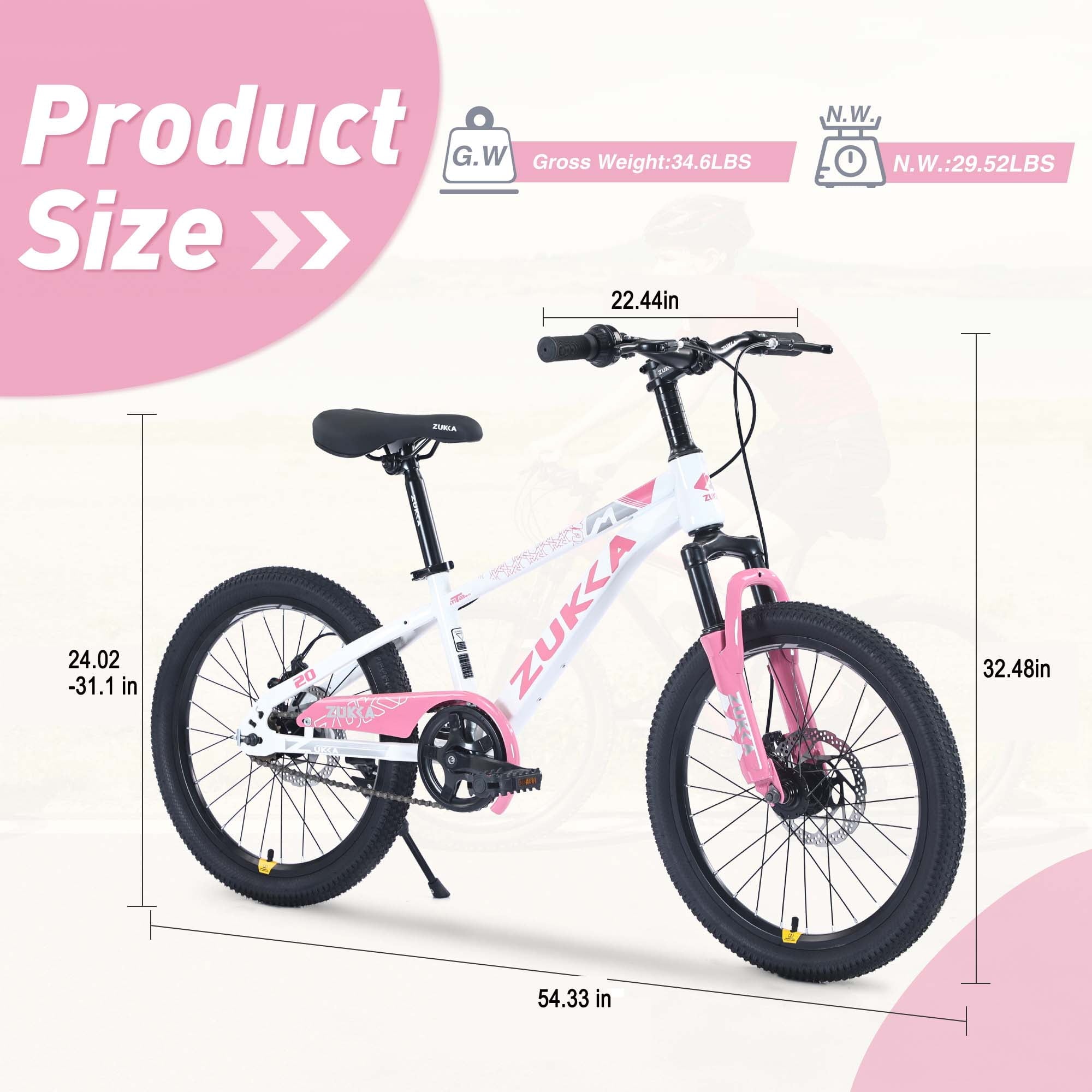 This 20-inch bike is ideal for riders 44–56 inches tall, offering a smooth and stable ride on various terrains. It features a sturdy triangular frame with a sleek enamel finish, removable training wheels for beginners, and a dual brake system with a fully enclosed chain guard for added safety. With 85% pre-assembly and included tools, setup is quick and easy—perfect for growing riders.