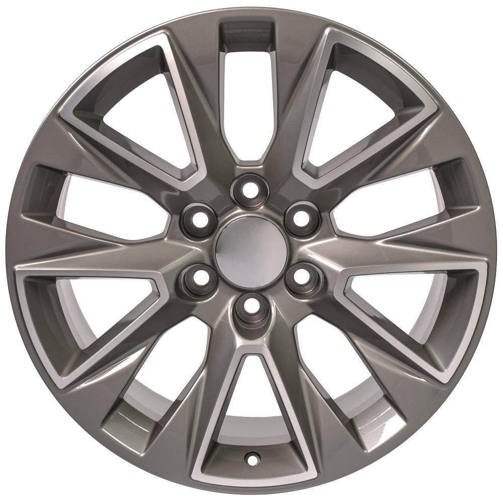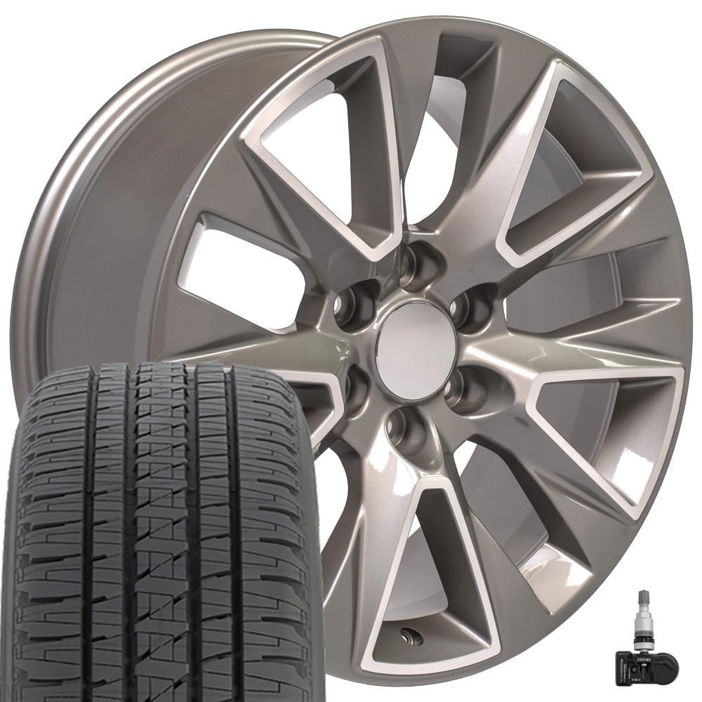This listing is for a set of four CV26 silver machined face 20×9 inch replica 5919 wheels, 275/55R20 Bridgestone Dueler Alenza HL tires and TPMS sensors. Designed to fit the GMC Sierra Chevrolet Silverado 1500 LTZ and other comparable vehicles. This set will ship mounted and balanced with TPMS installed using a Hunter Roadforce Elite balancer.