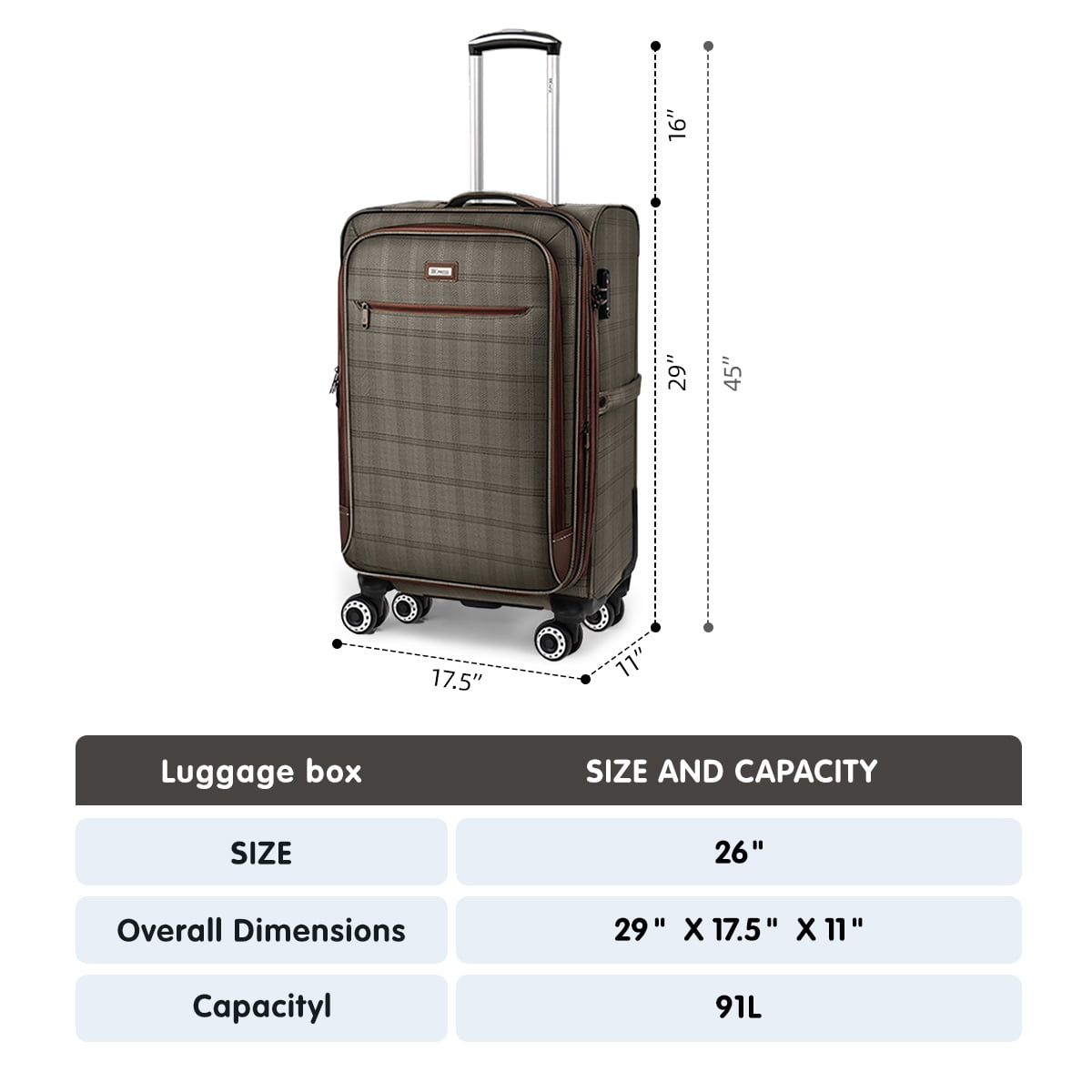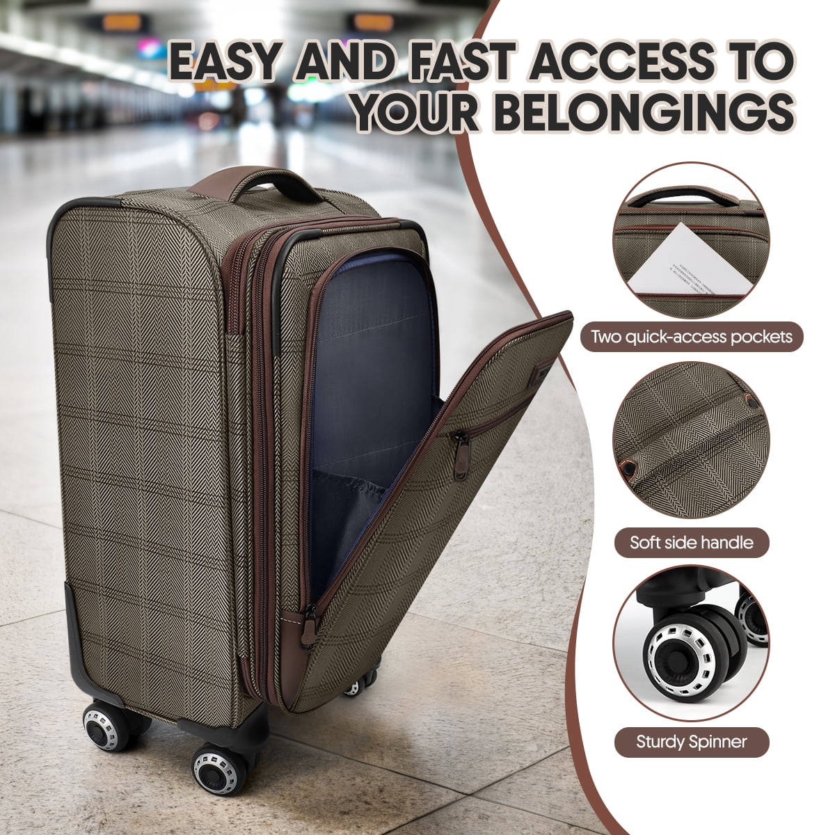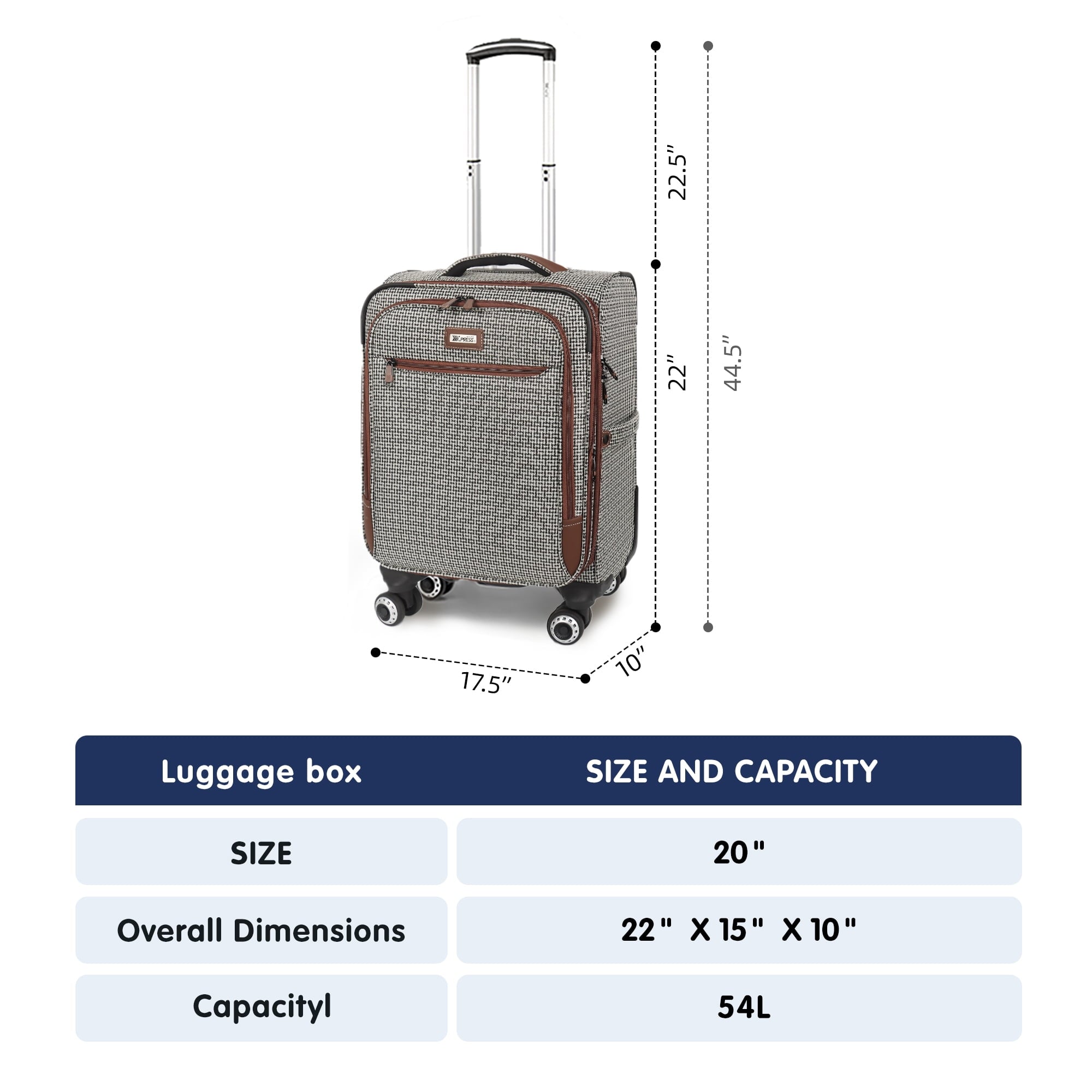 New York Xpress 20″ carry-on luggage is lightweight, ultra-durable, and softside – meeting airline-approved cabin size requirementsThis suitcase has two front pockets, a side pocket, and a spacious main compartment with adjustable straps. An expandable zipper adds extra space, while a telescoping handle, smooth spinner wheels, and multiple grab handles ensure easy mobility.The classic plaid design helps you spot your luggage at a glance, even in a sea of bags.Choose NY Xpress carry on luggage and start your journey in style!