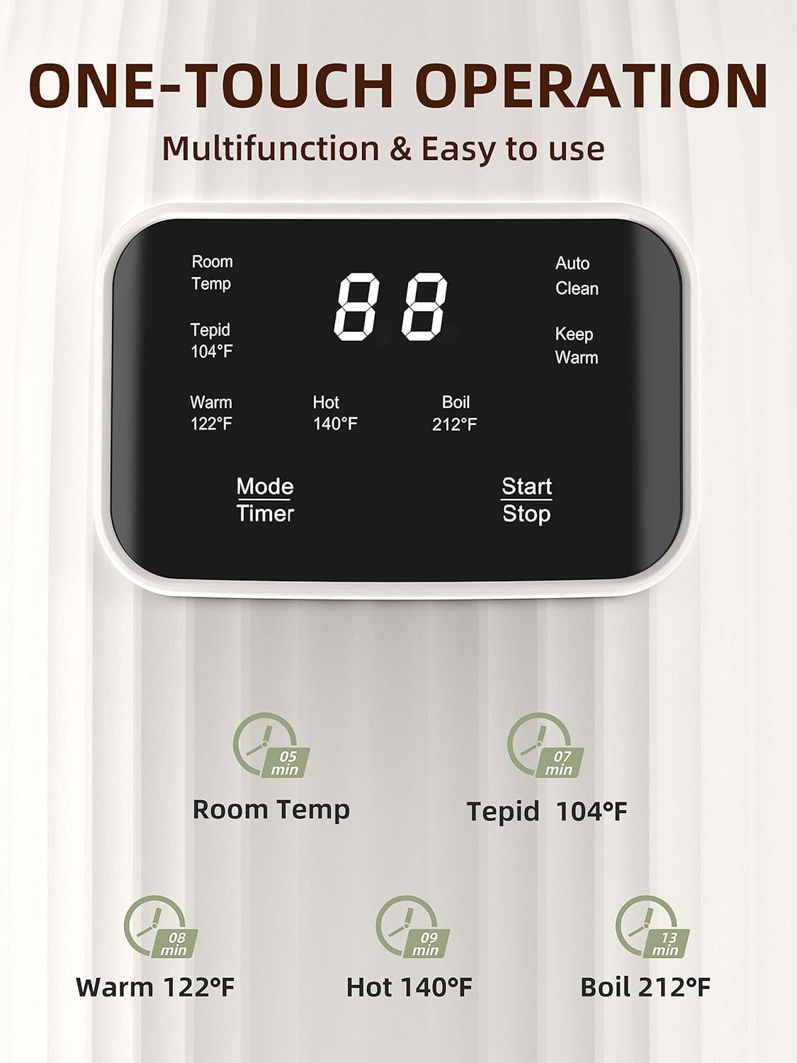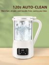 - 【Easy to Use & VERSATILE 】Automatic nut milk maker has 9 functions and can skip the soaking process, suitable for making various plant-based milk.The Room Temp is specially designed for almond and cold nut milk.Tepid(104℉), Warm (122℉), and Hot(140℉)are used for various hot drinks, and Boil(212℉)is used for making soy milk and rice milk.Moreover, it also features functions for 120s Auto clean, Sterilize, Keep warm, and Timer (up to 12 hours).