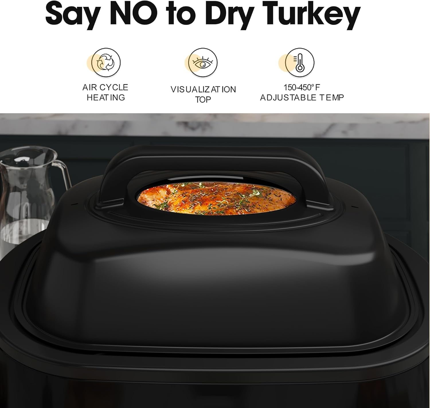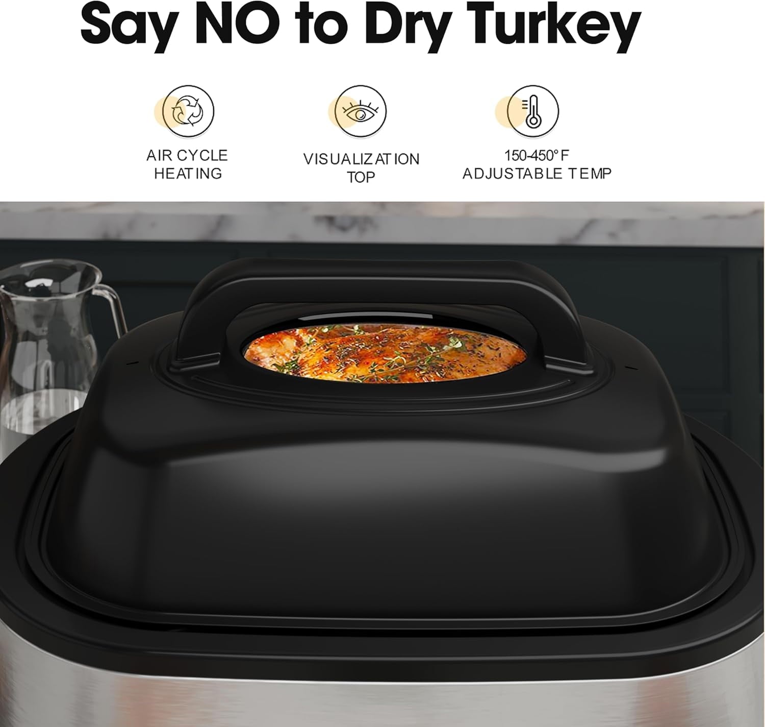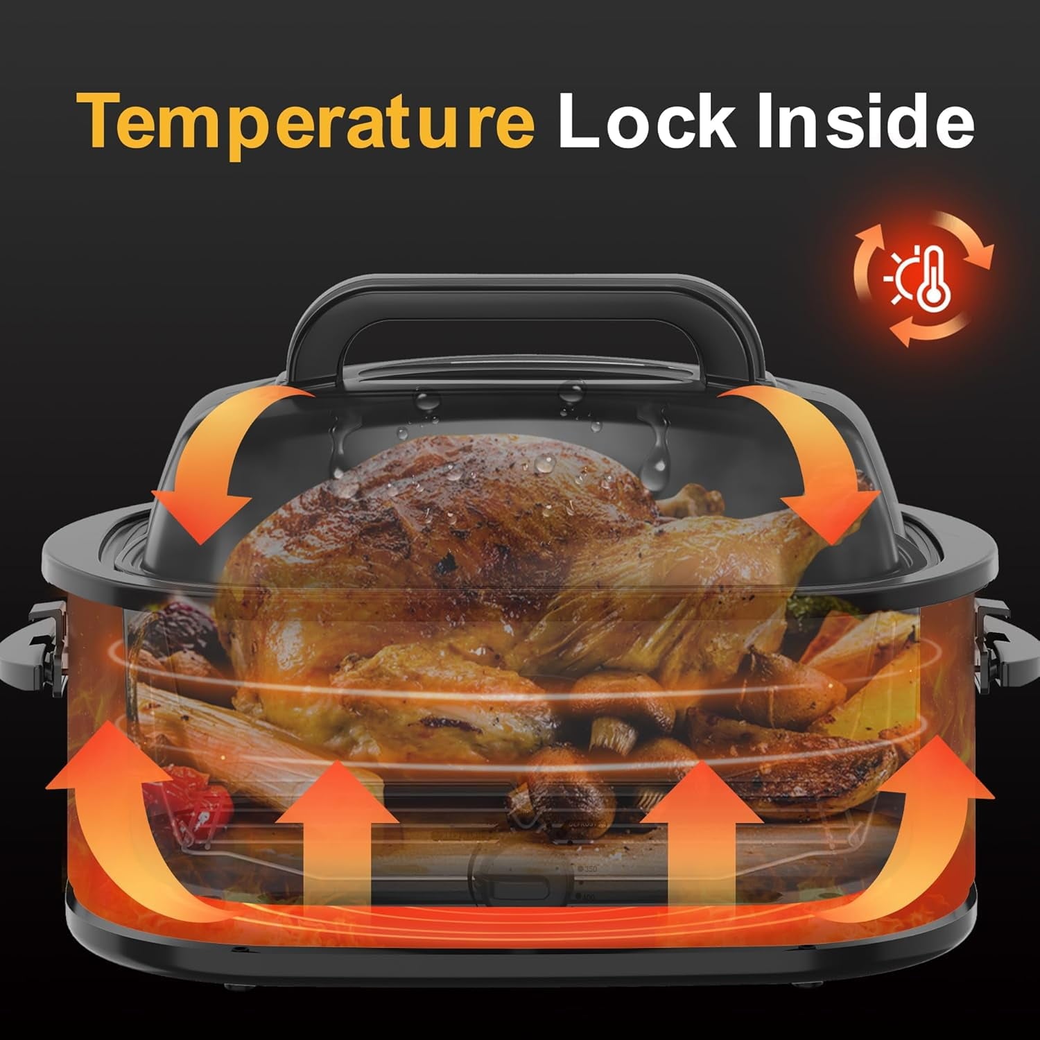 - 【Powerful 1450W Roaster Oven】1450W with red light, full-range temperature control, make your food taste better at different temperatures. Self-basting lid continually recirculates moisture, make the food more delicious. Non-skid rubber feet keep roaster oven in place safely and convenient cord storage