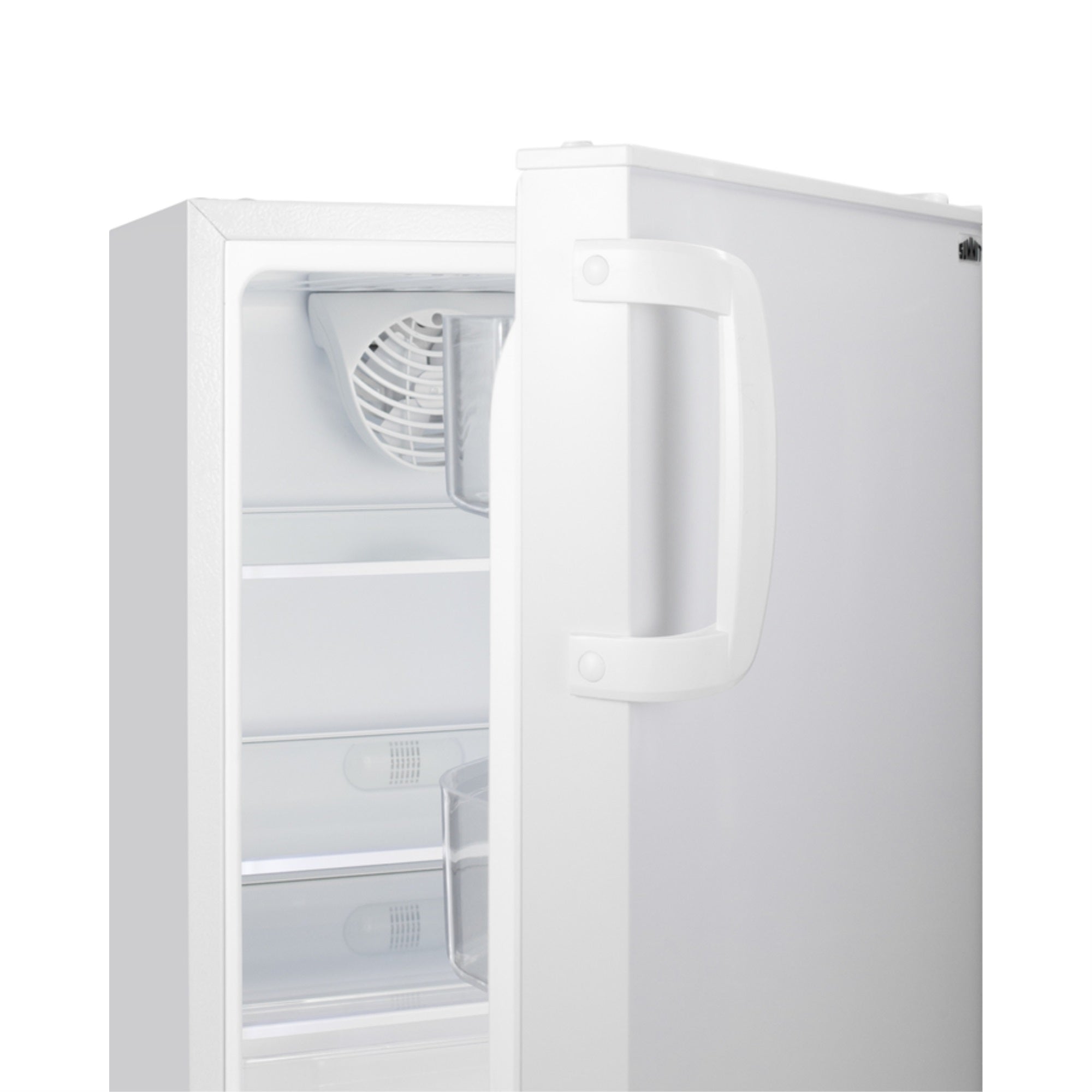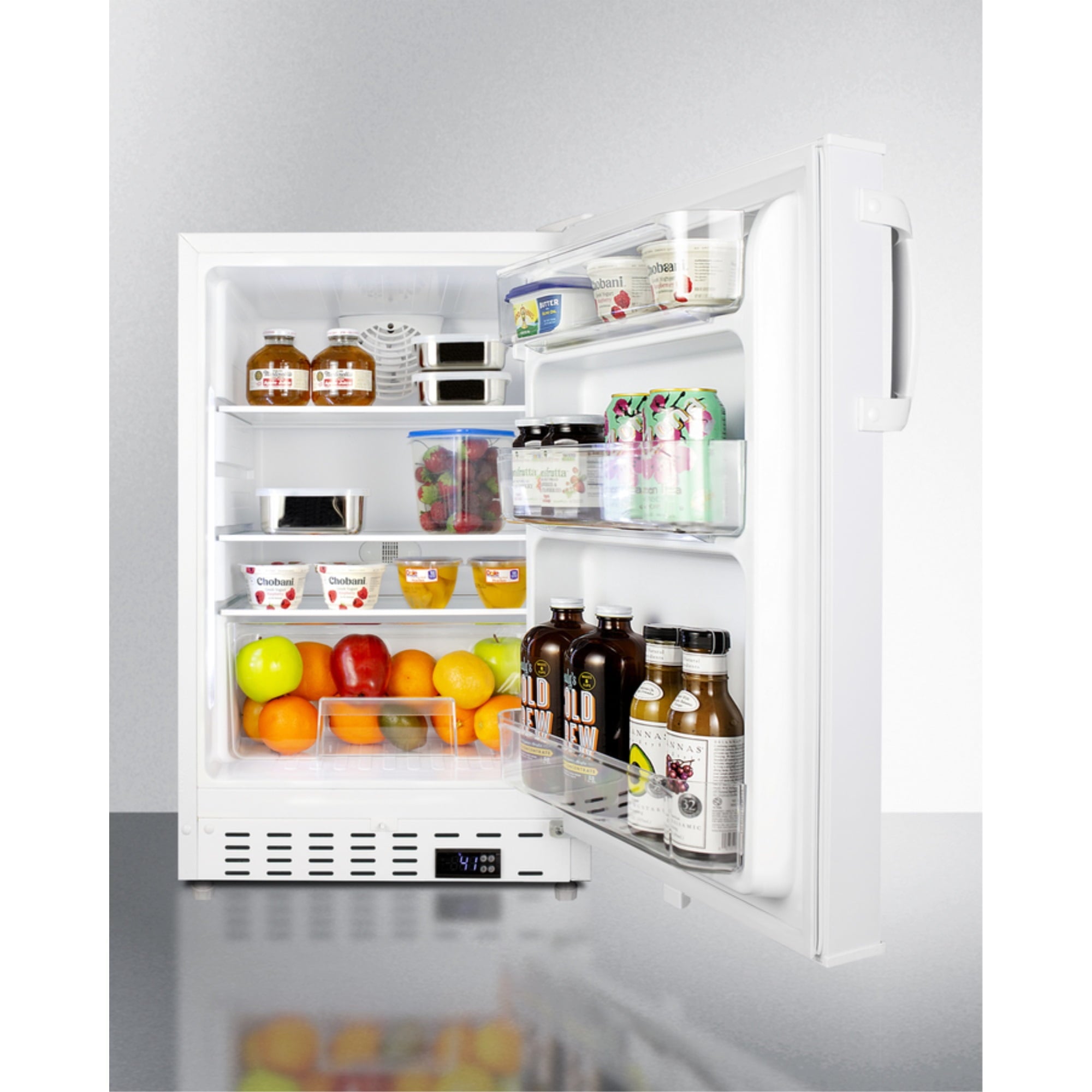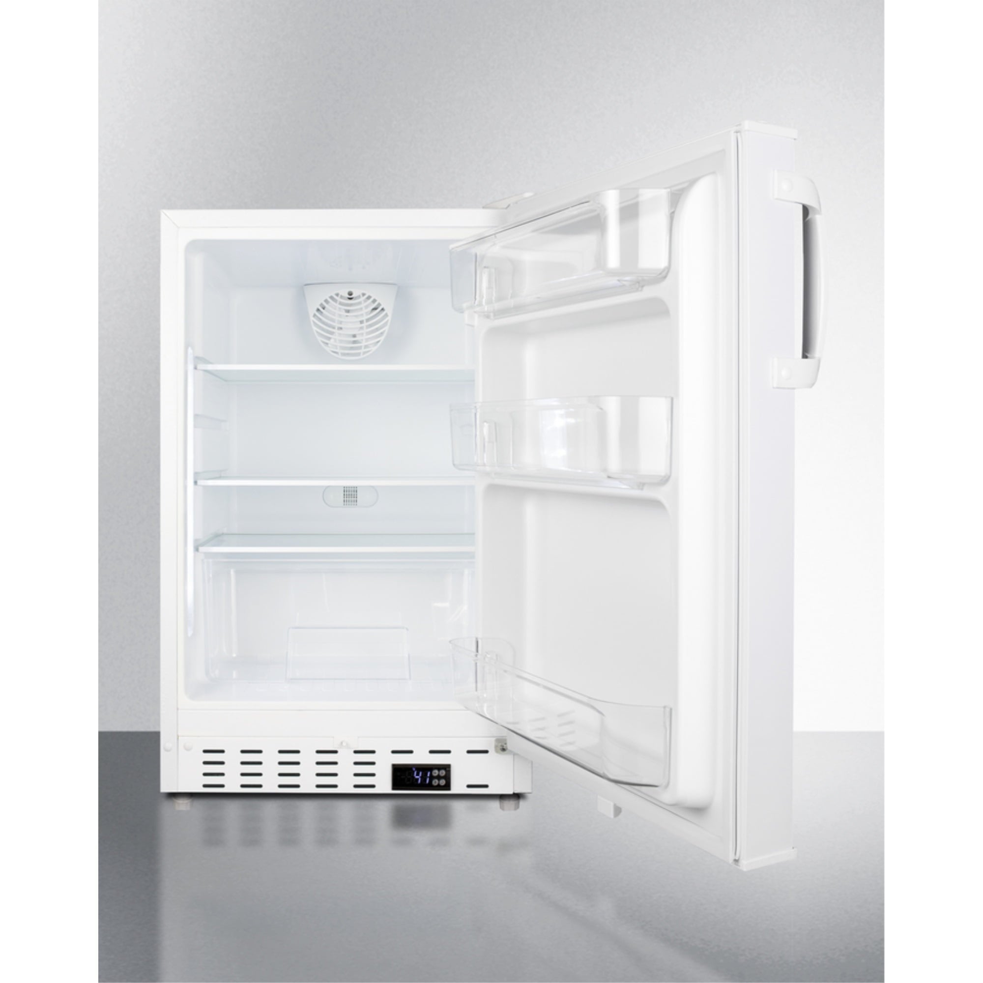 Summit Appliance offers a quality selection of 20″ wide built-in undercounter all-refrigerators designed for installation under lower ADA compliant counters, with advanced features for user convenience. The ALR46W is sized at 32″ high to fit under lower counters complying with ADA guidelines for accessibility. The fully finished textured white cabinet allows freestanding use, while the front-breathing system means this unit can be built-in with minimum clearance. The user-reversible door is 3″ thick for efficient insulation, with a handle included for added convenience. This unit comes with a right angle cord to allow for easier placement without added depth. A digital thermostat, located in the kickplate, makes for easy temperature management with a readout in Fahrenheit or Celsius. Inside, the ALR46W features an all-white interior for easy cleaning and viewing of contents. An LED light located toward the front of the unit attractively illuminates the interior when the door opens. Automatic defrost operation ensures minimal user maintenance, with an internal fan to help ensure even cooling throughout the 3.53 cu.ft. interior. Three adjustable glass shelves offer optimal storage options for large and small items, while a pull-out crisper drawer provides storage for fruits and vegetables. Three removable door racks accommodate additional storage as needed. The user-set high and low-temperature alarms provide added security should the temperature go beyond the setpoint, while the open door alarm sounds if the door is ajar over one minute for added peace-of-mind. These alarms can be disabled depending on your needs. Sized at just 20″ wide, the ALR46W is the perfect addition for space-challenged environments seeking dependable freezer options in a durable design. For a complete set, pair this unit with the matching ALFZ36 all-freezer.