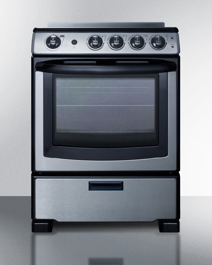 Summit’s White Pearl series of North American ranges offers full cooking convenience for apartments and other settings with smaller kitchen spaces. The REX2071SSRT is a 220V electric range sized at just under 20″ wide. The front manifold, oven door, and lower panel feature a stainless steel finish, with a black trimmed oven window and handle for a modern look. The versatile design includes a removable 2″ high stainless steel backguard, allowing you the choice of a standard range style or a slide-in look with a flat surface that allows you to better integrate the unit with your own backsplash design. The smooth ceramic glass surface includes four 1200W 6 1/2″ elements, with a hot surface indicator light for added safety. Inside, the REX2071SSRT features a large 2.3 cu.ft. oven made from durable porcelain enamel. The waist-high broiler function is easy to use, with slide-out oven racks that can be adjusted in four different glide positions for the best fit. We include a small two-piece porcelain broiler tray with a grill cover. The large oven window and interior light make it easy to monitor your cooking.Designed and constructed in North America, the REX2071SSRT is the perfect choice for smaller kitchens with full cooking needs. Additional choices are available in 24″ wide fits. Browse our website to view our complete collection.