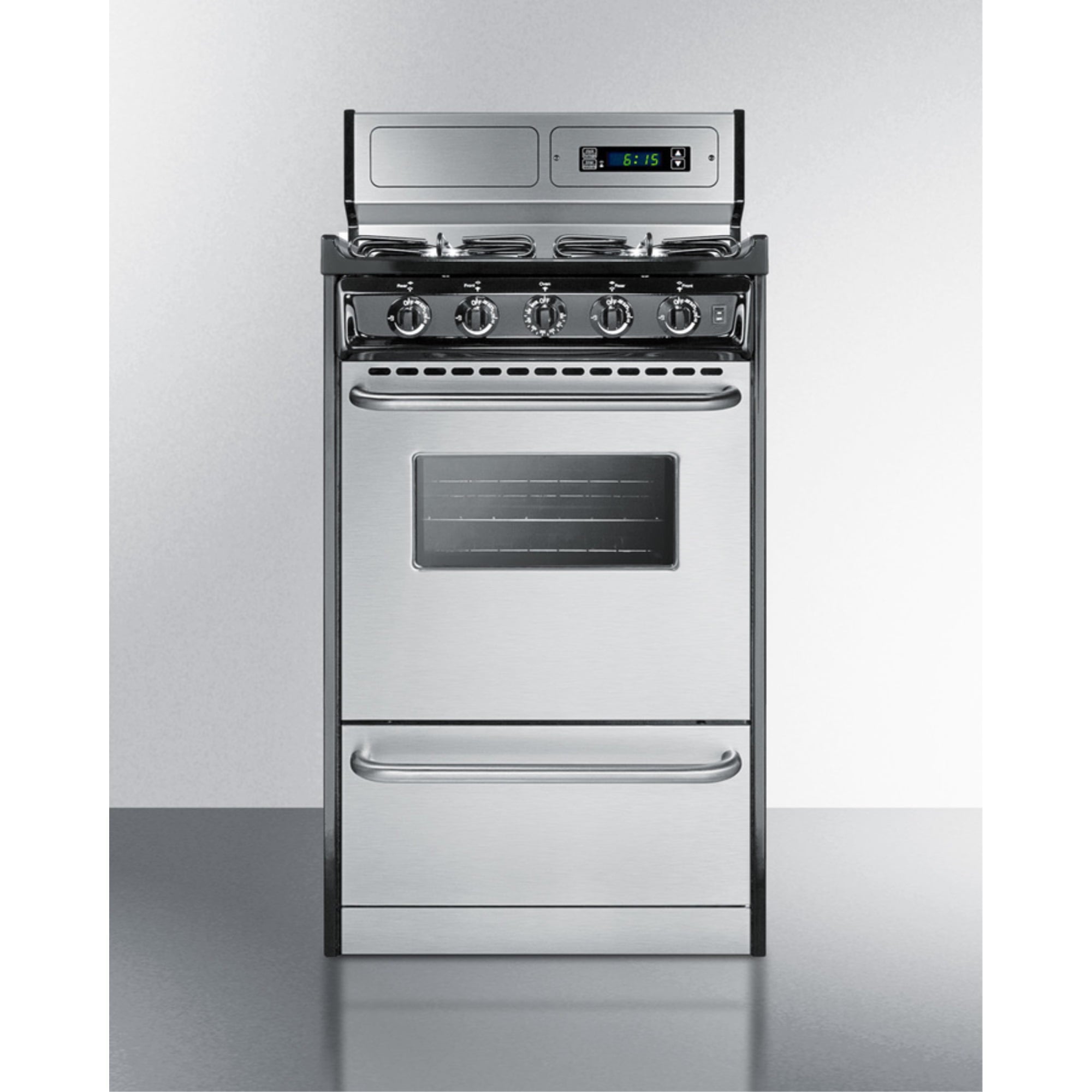 Summit Appliance offers a wide selection of American-made household ranges built for long-lasting durability in space-challenged kitchens. The TTM1307BKSW is 20″ wide apartment-sized gas range with a generous 2.46 cu.ft porcelain oven interior that can fit large trays. Two adjustable oven racks are included. An oven window and on/off interior light allow you to easily keep watch over your cooking. The broiler is located below the oven in a drop-down compartment. Four sealed 9100 BTU gas burners accommodate most of your stovetop heating needs, with upfront push-to-turn knobs that let you adjust your cooking without reaching over hot burners. This unit utilizes an electronic ignition system for added safety. Stainless steel doors feature professional style towel bar handles, bringing classic elegance to smaller kitchen spaces. The deluxe 8″ high backguard includes a digital clock and timer for added convenience when cooking. This unit has a recessed oven door and is conveniently sized at just 24″ deep for a better fit in galley in L-shaped kitchens, where every inch counts. With its classic style and quality construction, Summit’s made in the USA cooking line offers reliable cooking for smaller homes. This unit ships ready for natural gas connections. To use with propane, add the Kit LP S2.