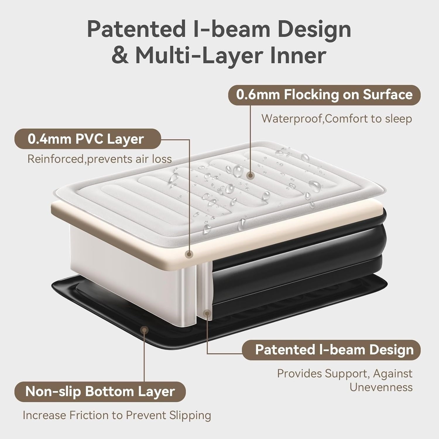 - Upgraded Material: Made from high-density flocked fabric, soft, breathable, and odor-free. 30% thicker PVC ensures long-lasting durability. Leak-resistant and resistant to bulging, it offers a worry-free sleeping experience. It also comes with repair patches for added peace of mind