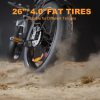 • Fat Tire Electric Bike: The 26” *4.0” fat tire with tread patterns has a wider contact area which enhances flexibility, excellent grip, wear resistance and anti-skid function to let you safer in rainy day.