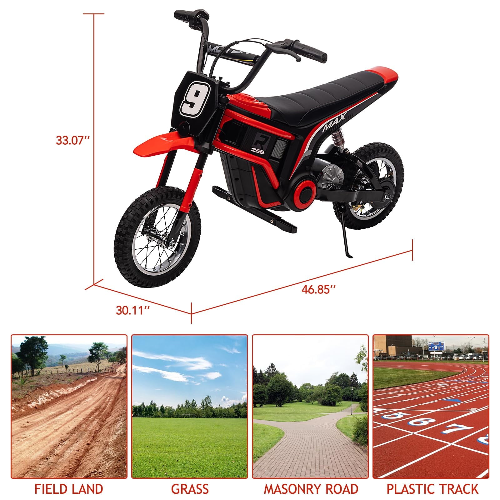 - 【24V Electric Dirt Bike for Kids 8-14】 adventure machine designed for young riders ages 8-12 years old. Features authentic dirt bike geometry with 135 lb weight capacity and oversized suspension for off-road excitement. Rugged steel frame withstands jumps & bumps while vibrant green color sparks outdoor enthusiasm.