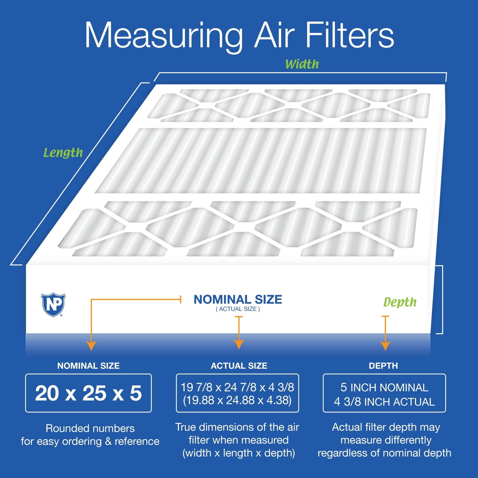- Nominal Size: 20 x 25 x 5 H, Actual Size: 19 7/8 x 24 7/8 x 4 3/8 (19.88 x 24.88 x 4.38)