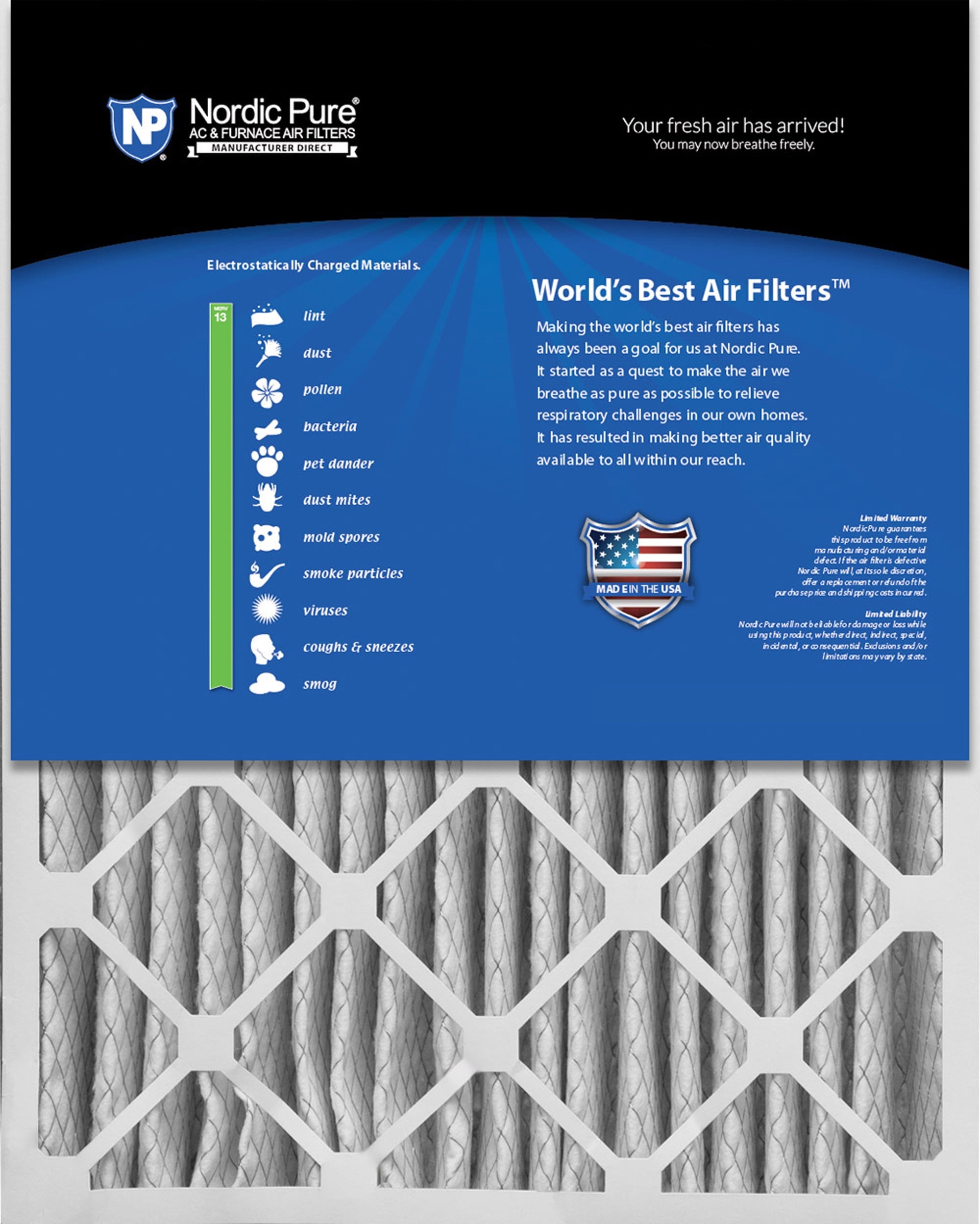 Important Note: Almost ALL furnace filters have a different “actual size” than the nominal size printed on the air filter. It’s best if you measure your air filter for the EXACT size and compare it to our “Actual Size”. With the 4″ and 5″ air filters there is a wider variance between the nominal and actual size depending on the manufacturer. We also carry 4 7/8 and 5 1/4 inch depth filters, this is why we ask you to compare the exact dimensions. Nordic Pure 20x25x5 Honeywell Replacement MERV 13 rated air filters are what is considered the traditional 5” filter at an actual 4 3/8”. You should always measure your current filter or the housing to make sure the actual size correlates with the filter you are ordering. All Nordic Pure pleated air filters are manufactured using a heavy duty, moisture resistant beverage board frame. There is a metal mesh support grid bonded to the pleats for extra support. MERV 13 furnace air filters are comparable to HVAC filters with the rating of MPR 2200-2400. This high-performance HVAC replacement filter will help keep your air conditioning and heating systems running efficiently, saving money on utilities and costly maintenance. It is important to regularly change your furnace air filters especially during any home improvements for fresh, clean air in your home or office. We recommend that you change your air filter every 3-6 months to maintain maximum efficiency and economy.
