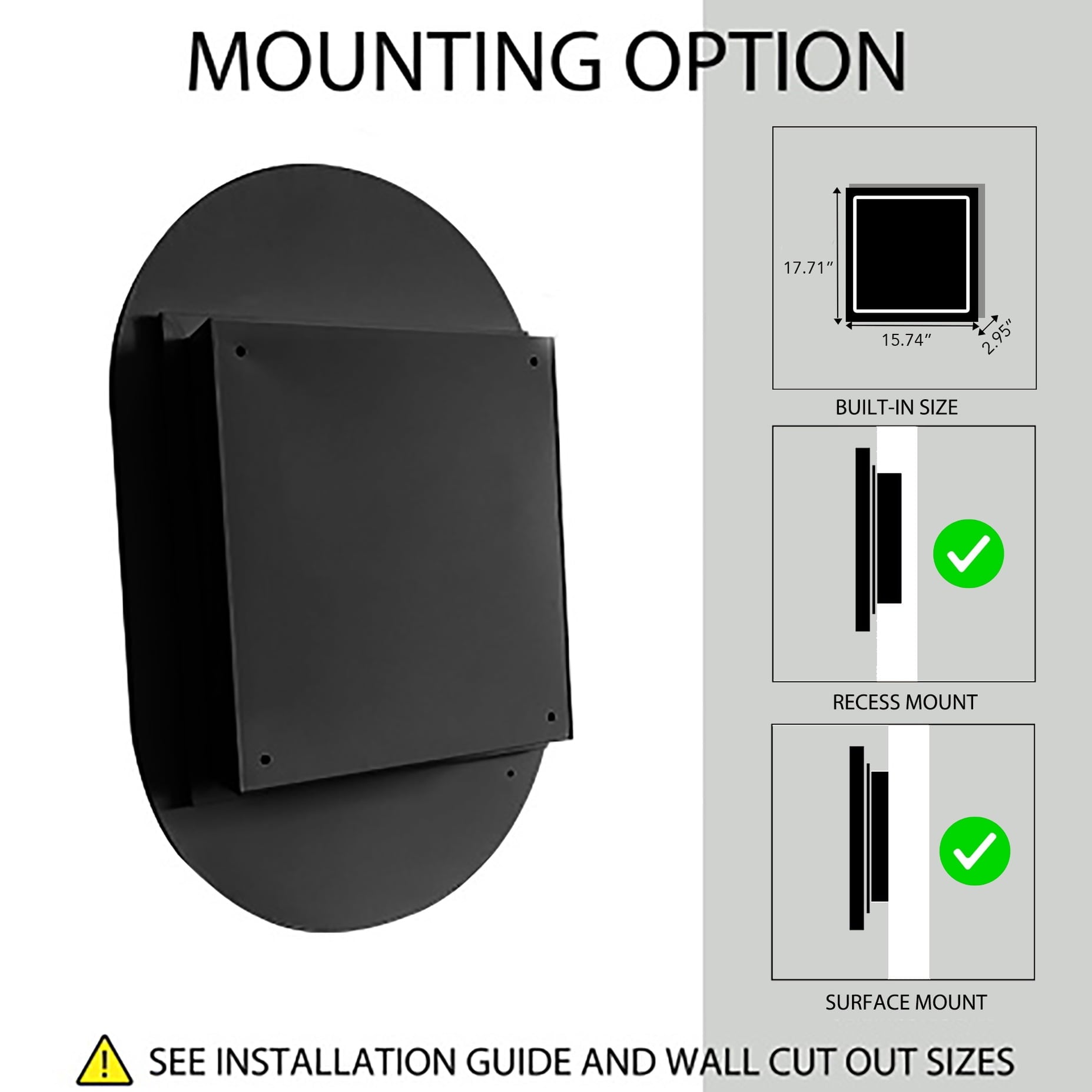 20×34 inch oval recessed medicine cabinet is a perfect blend of style and practicality for your bathroom. metal frame gives it a robust and stylish look, while matte black color adds a touch of class. mirror is of superior quality, providing a clear and image. adjustable shelves allow for efficient storage, keeping your bathroom essentials neatly organized. this cabinet is suitable for both small and large bathrooms, adding a touch of elegance to any space. it is easy to install, and design saves space. well packaging ensures that cabinet arrives in excellent condition. : perfect blend, robust style, superior quality mirror, efficient storage, space design, excellent condition arrival