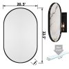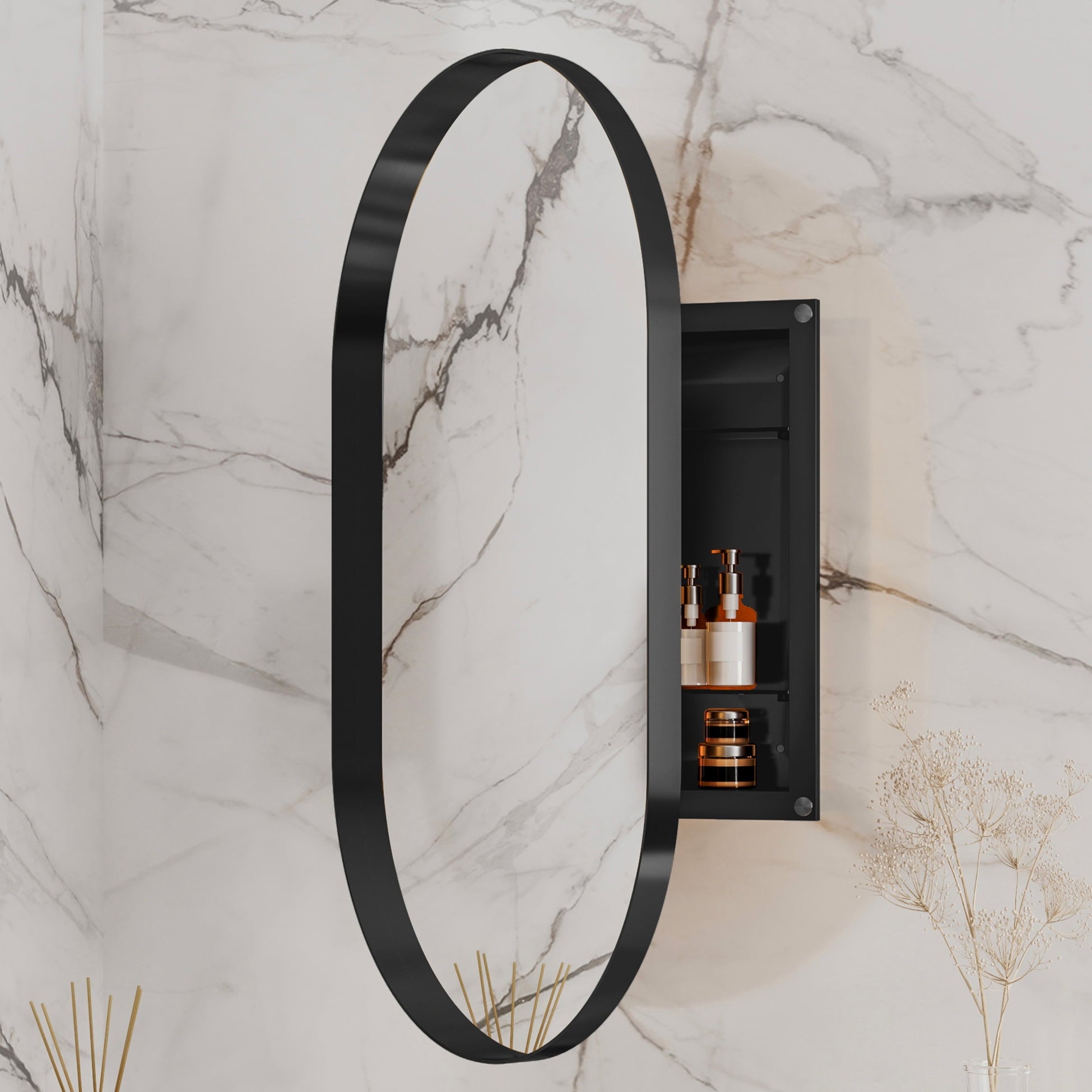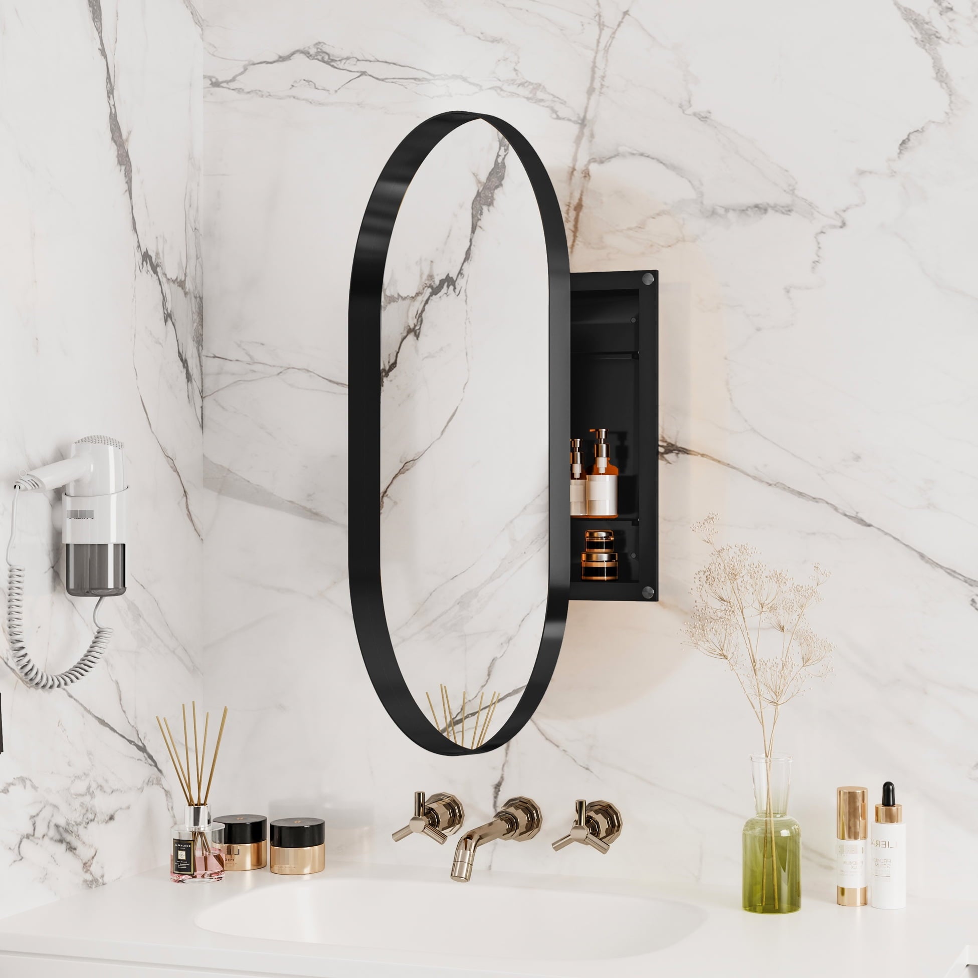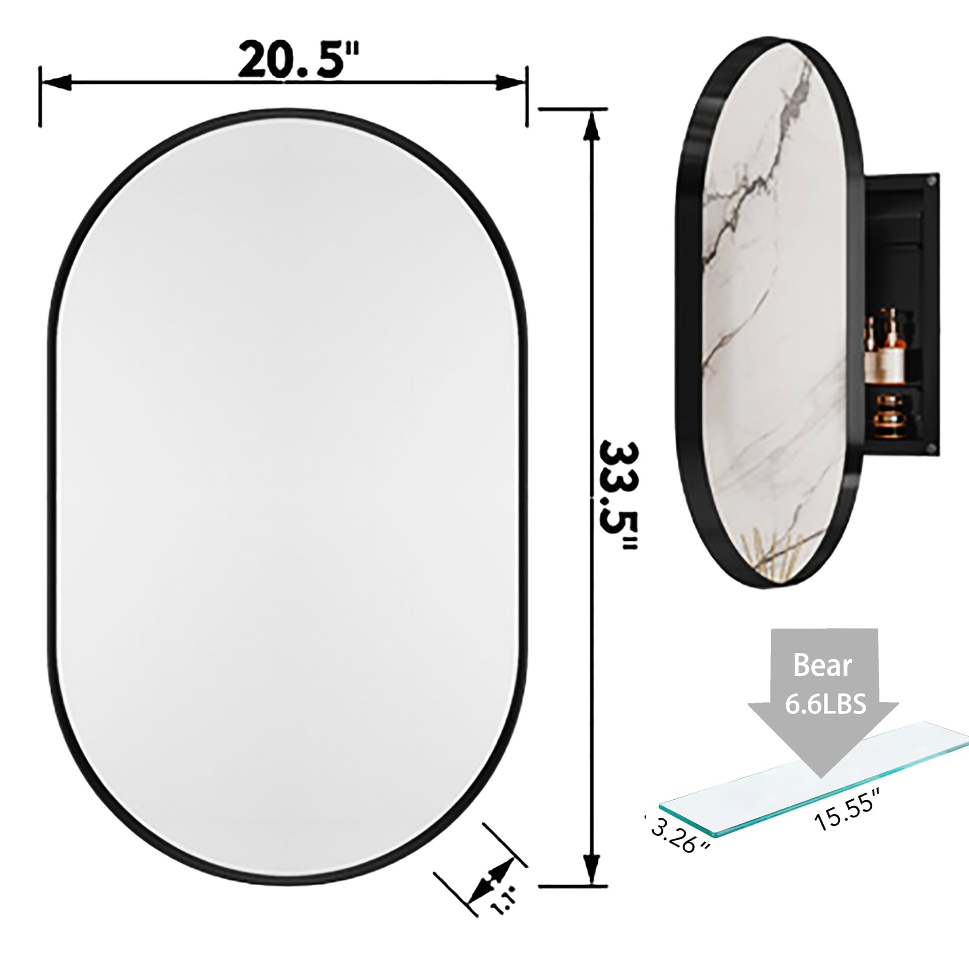 20×34 inch oval recessed medicine cabinet is a game for your bathroom decor. metal frame and matte black color give it a bold and stylish presence. mirror is clear and provides a sharp reflection, enhancing overall look of bathroom. adjustable shelves inside cabinet offer customizable storage, allowing you to arrange your bathroom items according to your preferences. this cabinet is suitable for various bathroom layouts, adding a touch of sophistication to any space. it is easy to install, and design saves space. carefully packaged cabinet ensures it arrives without any damage. : bathroom decor game, bold stylish presence, clear sharp reflection, customizable storage, versatile layout compatibility, space, damage- arrival