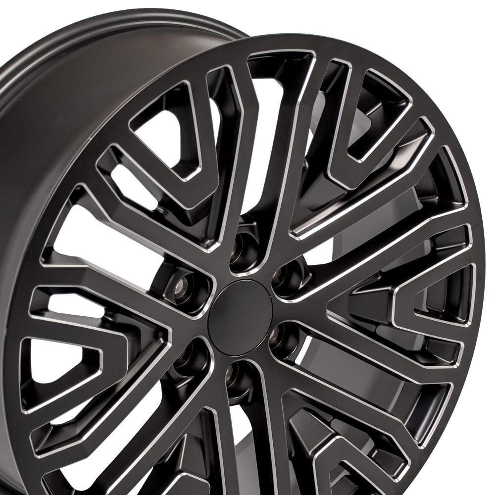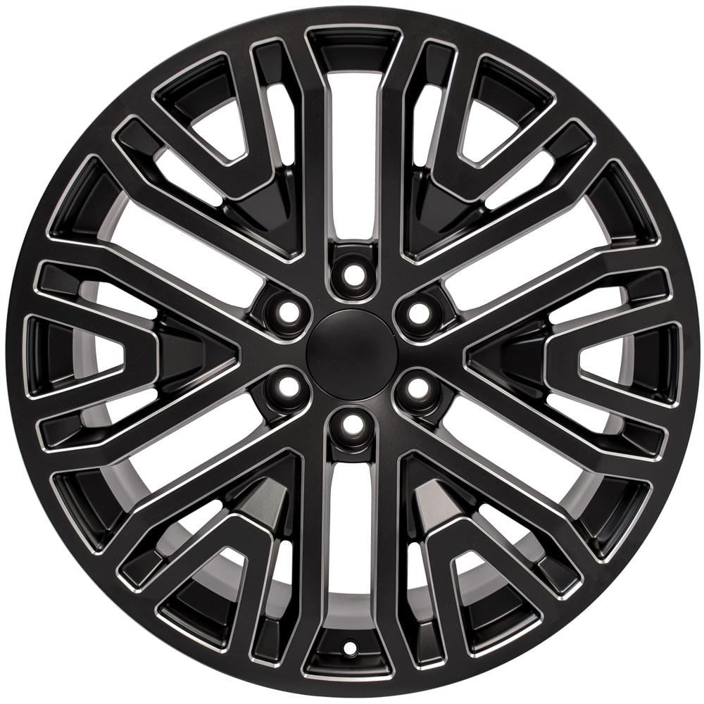 These CV39 Replica Wheels are 22×9 Black w/Chrome Insert rims designed to fit late model GMC Sierra, GMC Yukon, Chevy Silverado, Chevy Tahoe models. This wheel was originally featured on the 2019 Chevy Silverado High Country as an upgraded wheel option. Please check our fitment tab for specific year-make-model applications and will-not-fit exceptions before ordering.