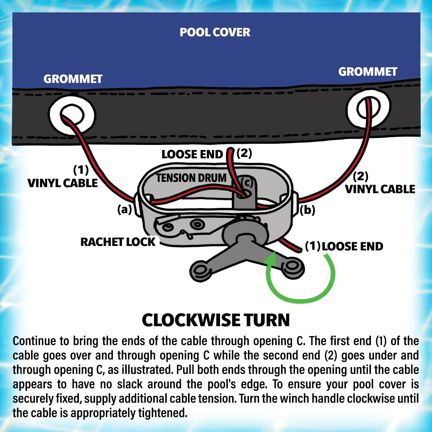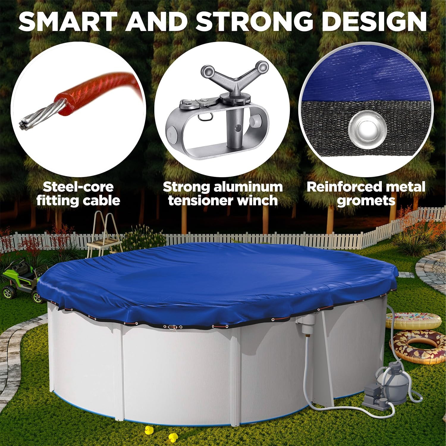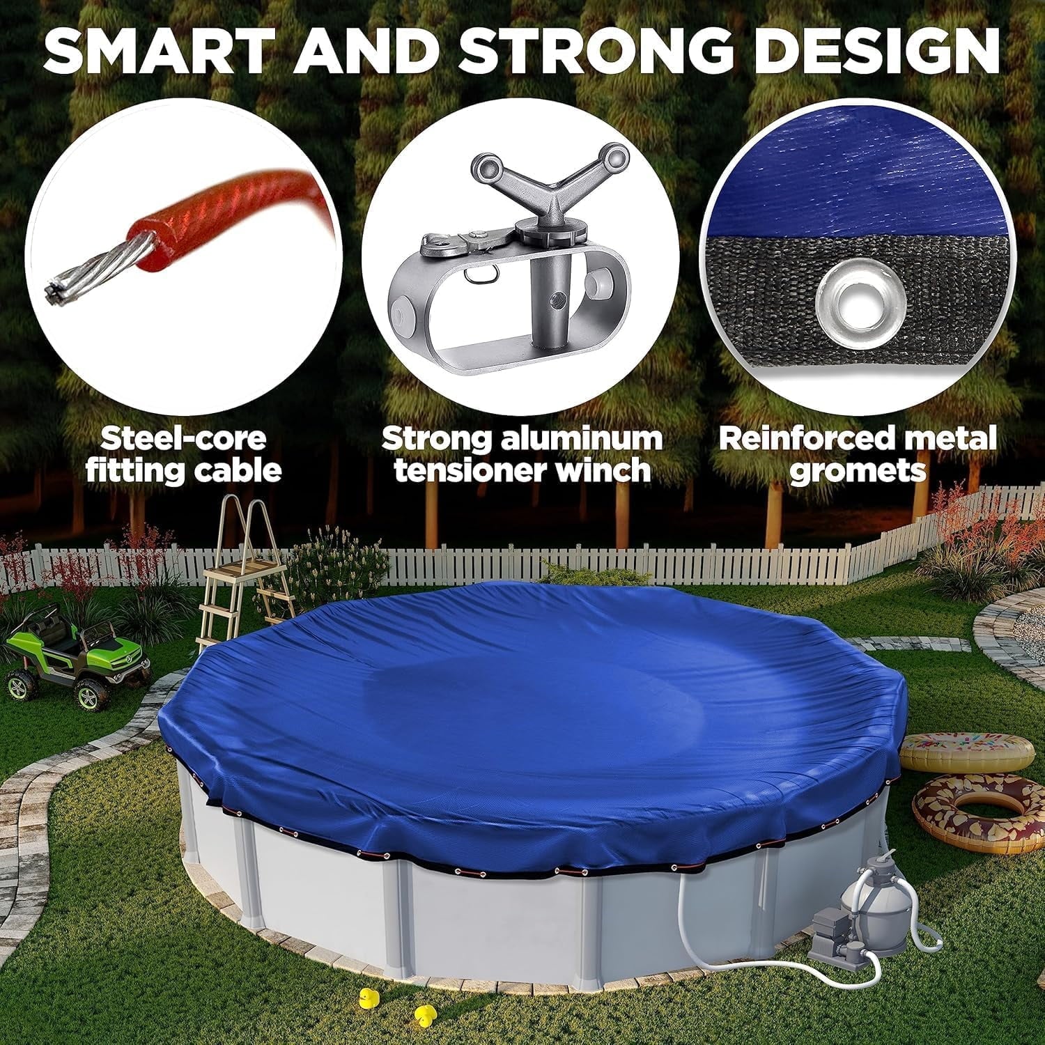 • Secure Fit: The steel-core cable and reinforced grommets provide a snug, debris-free cover, keeping your pool safe and secure.