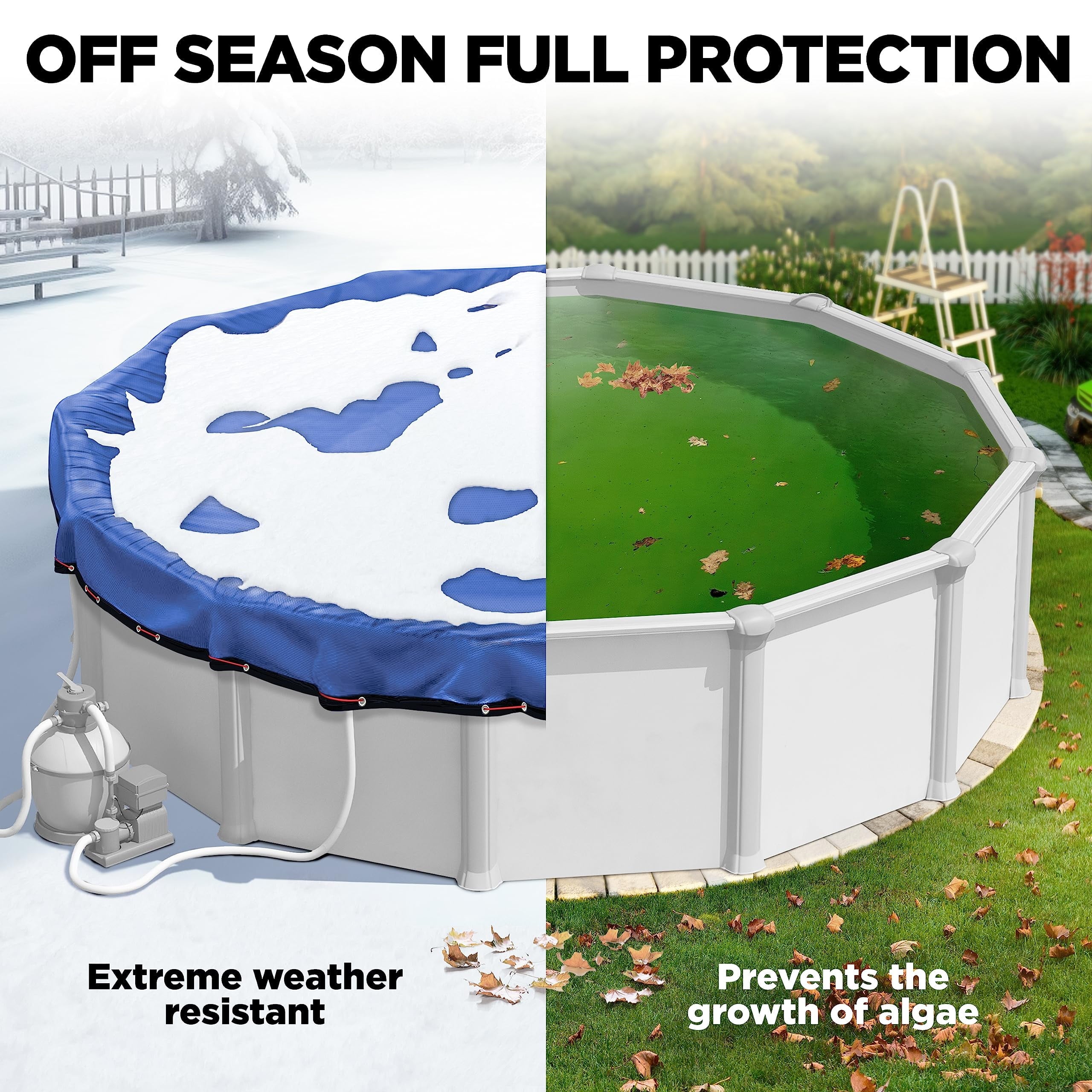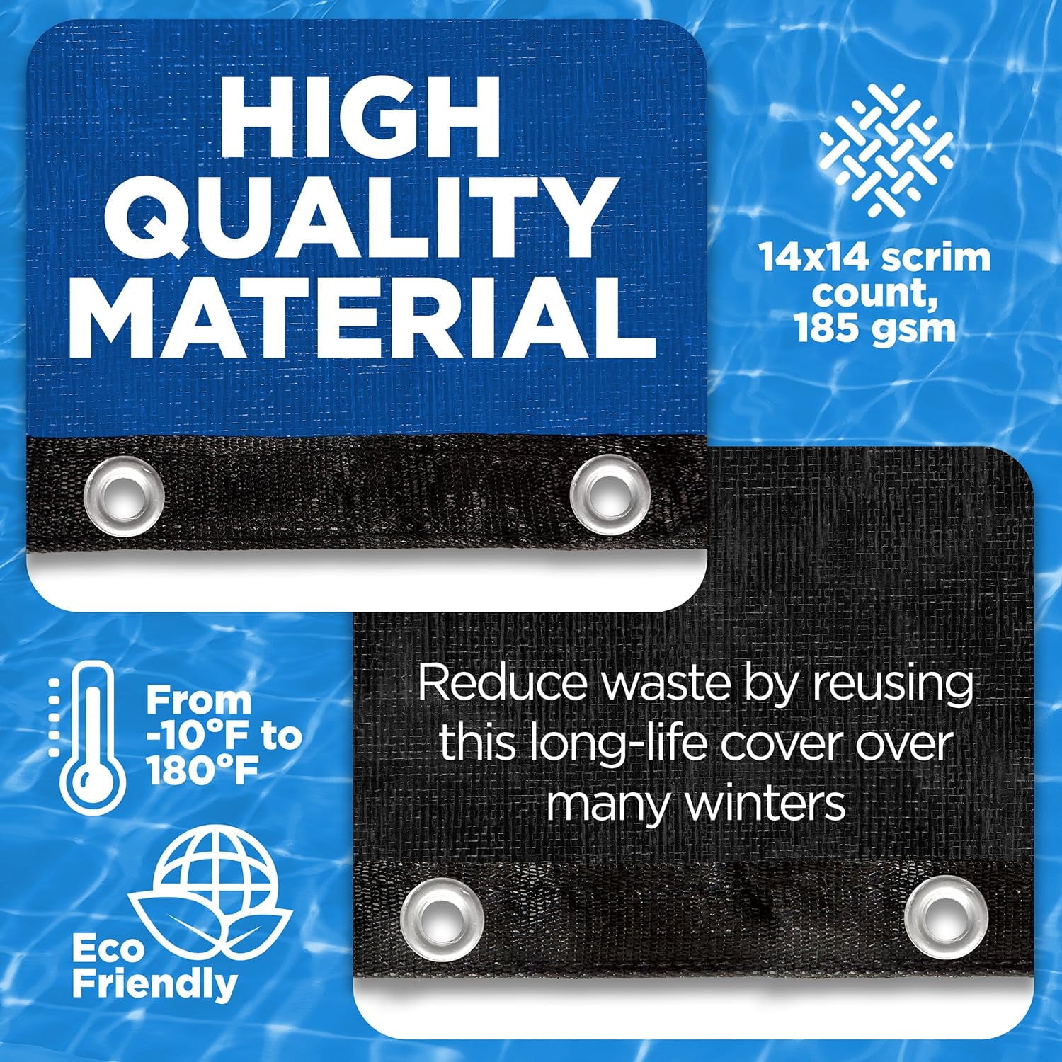 • Premium Durability: Crafted with a 14×14 scrim count and 185 gsm density, this pool cover ensures long-lasting protection against harsh winter conditions.