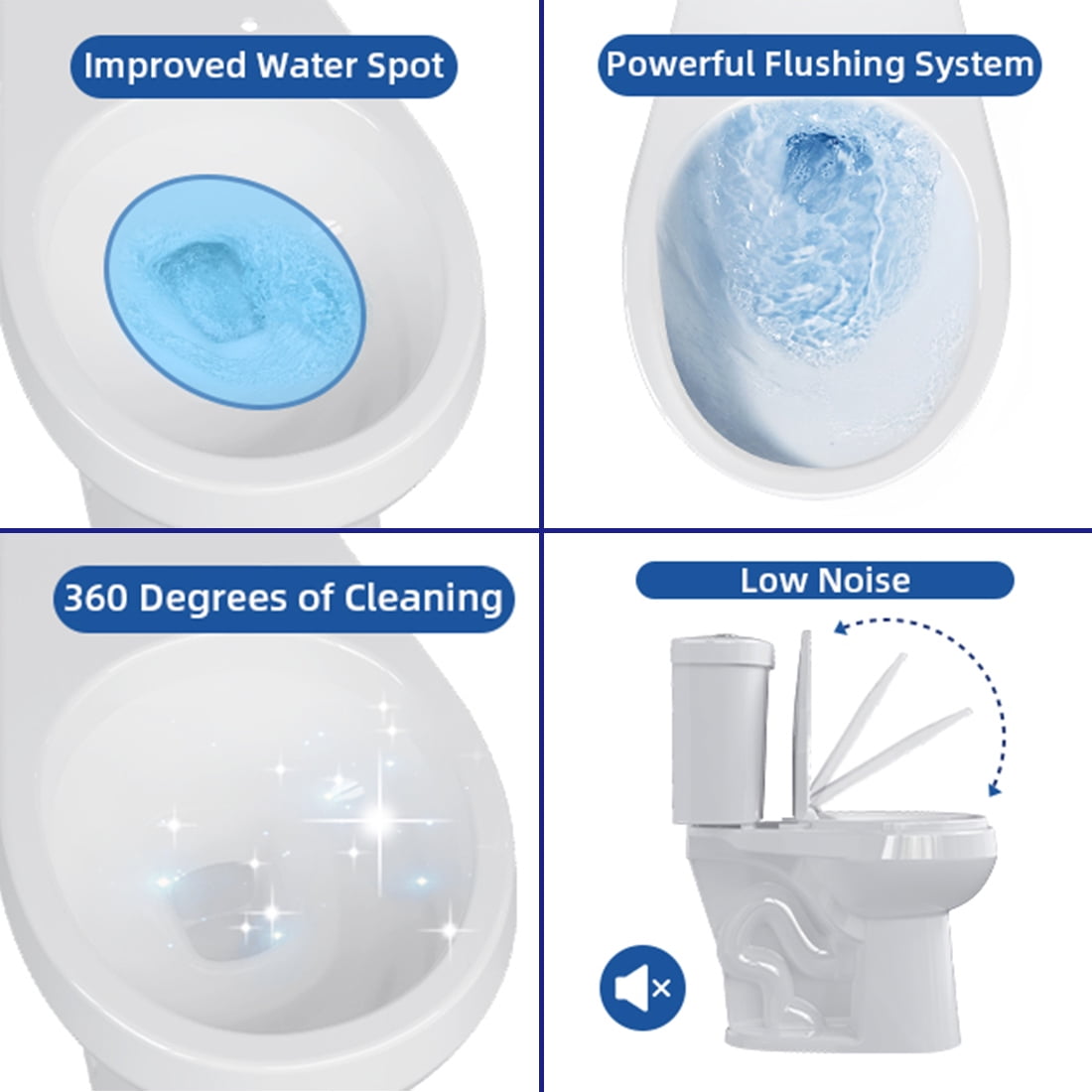 - Toilets Come with Soft Close Seat for Quiet: An elongated toilet seat allows you to close quietly. It will perfectly reduce the noise of nighttime toilet visits. Keep silent for your family