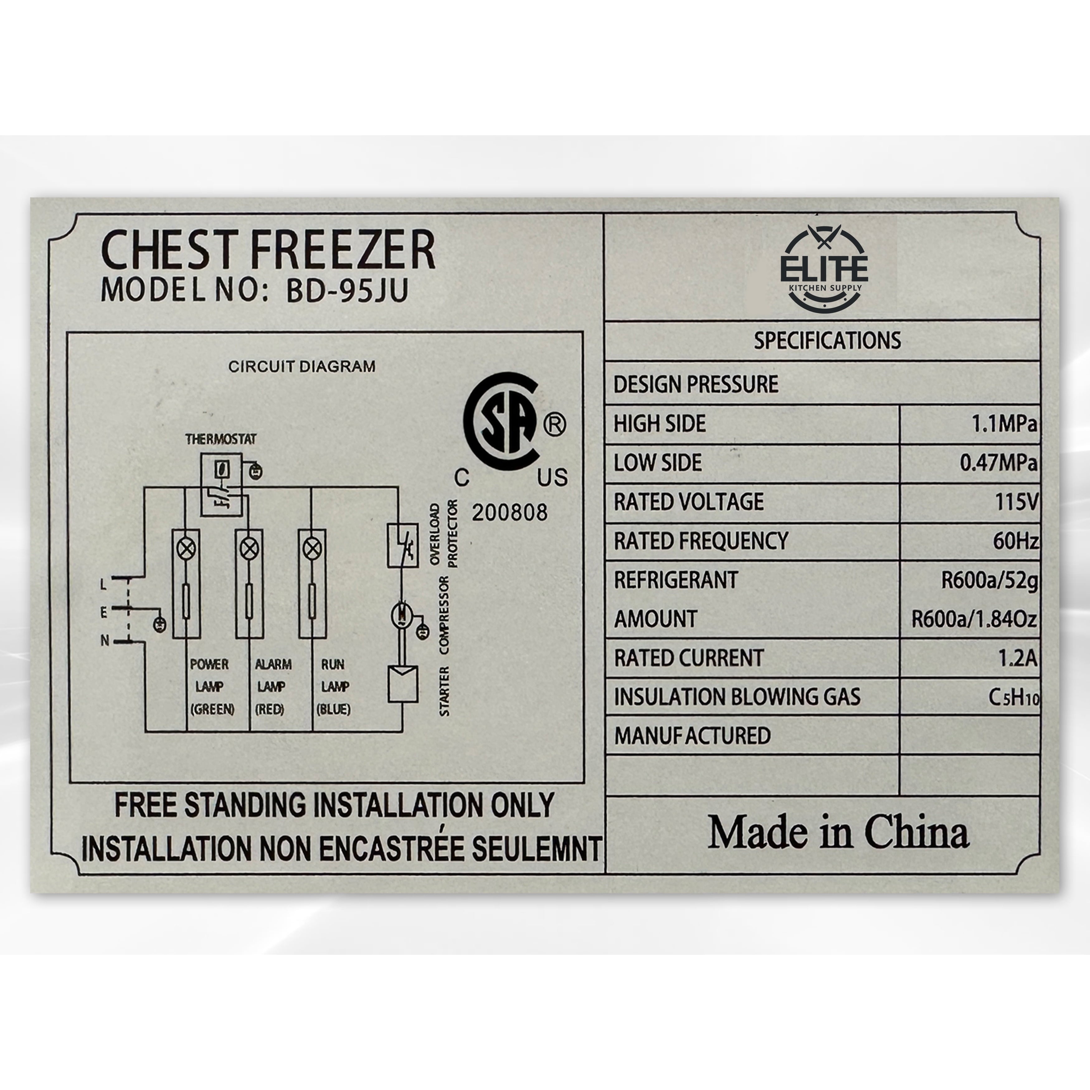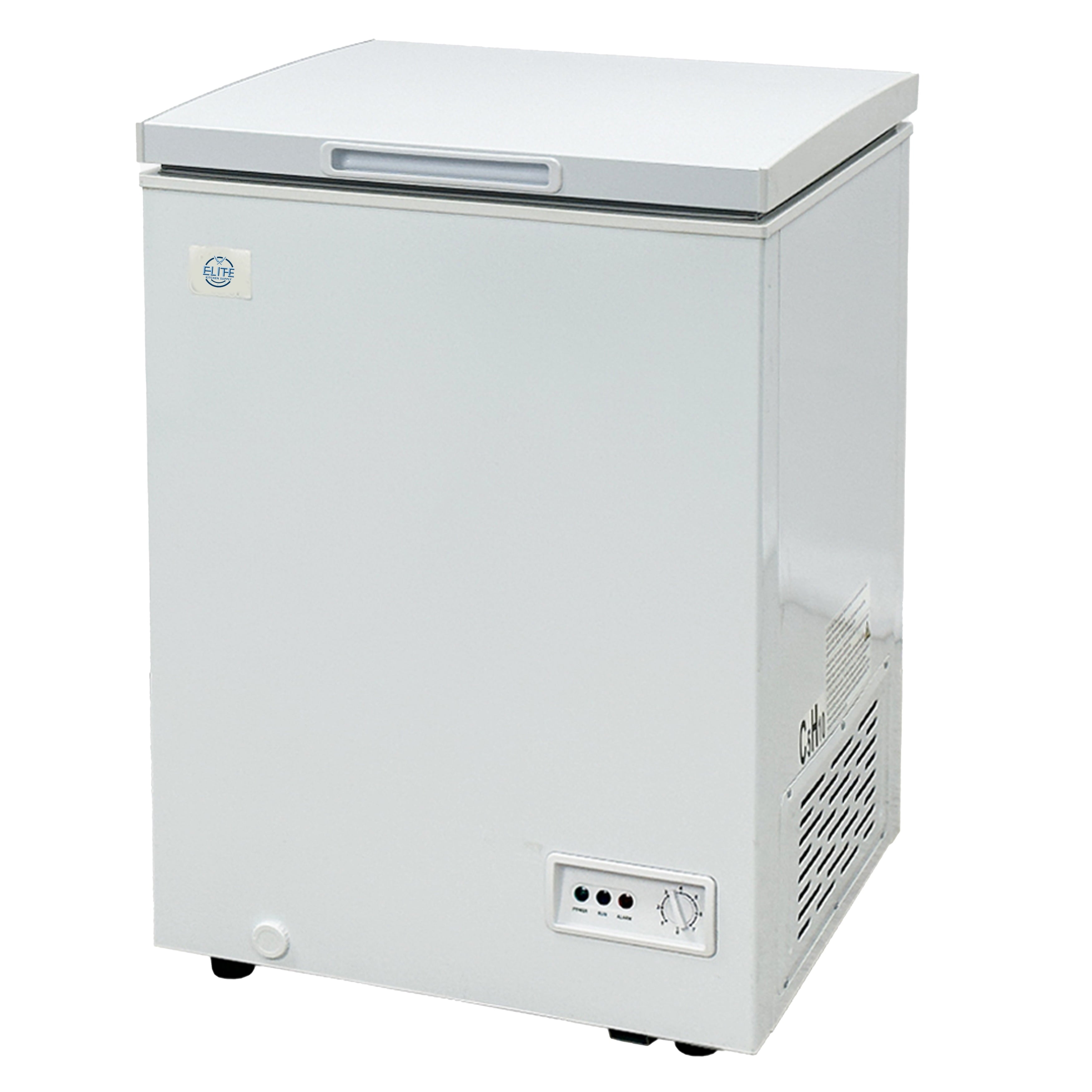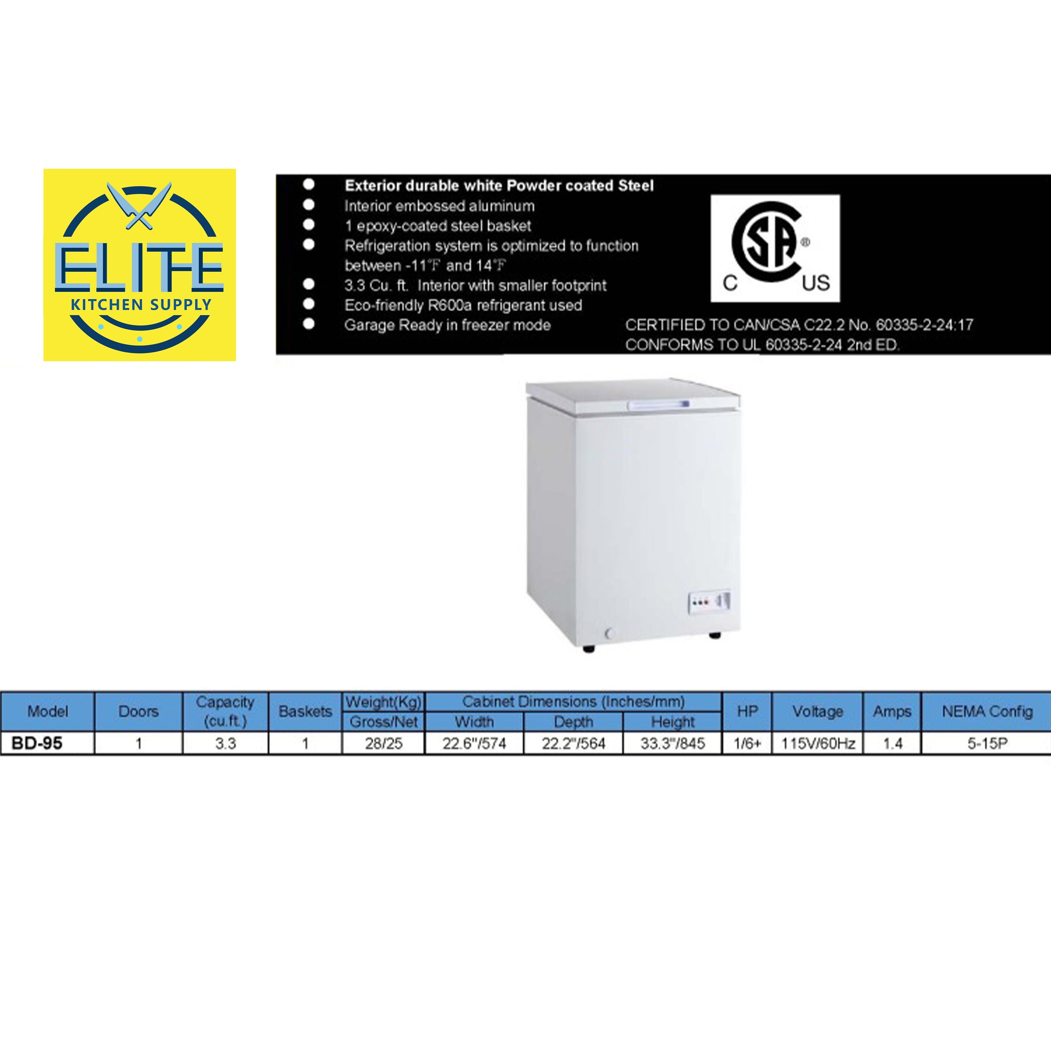 Introducing Elite Kitchen Supply’s NSF-certified Single Door Food Chest Freezer, model XF-95. With a compact 3.5 cubic feet capacity, this chest freezer is designed for commercial use, offering efficient frozen food storage in establishments with limited space. The single door design ensures easy access for quick inventory checks and retrieval of frozen items. Certified by NSF for sanitation and safety, the XF-95 is equipped with energy-efficient features, promoting sustainability while keeping operational costs in check. Elevate your frozen food storage with Elite’s Single Door Food Chest Freezer, where compact convenience meets reliability in professional kitchens.