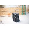 This 22 in. Connect System Rolling Cart features an interconnecting system allowing you to customize the way you transport your tools and accessories. The system features 3-Piece. A rolling cart, toolbox and small parts organizer. The rolling cart base is large for hauling power tools. The rolling cart features 7 in. rolling wheels and strong telescoping handle. The mid tool box is 22 in. W and features a flat lid surface to double as a work surface. The deep pro organizer features 12 removable bins.