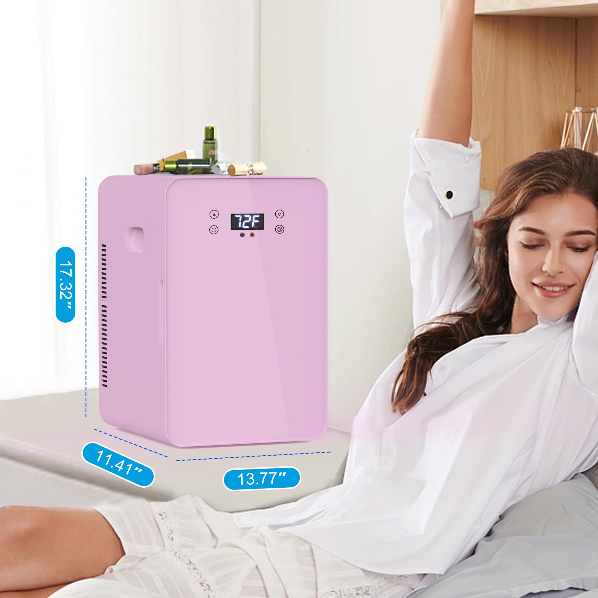 ADVWIN 22L Cooler/Warmer Mini Fridge boasts efficiency and durability in one stylish, compact unit. The all-purpose, thermoelectric goes from cooling to warming with precise temperature control. Multiple use cases: The table top mini fridge is not just for food and drinks. It’s a versatile storage solution for all your needs. From keeping fruits and medications at optimal temperature, to preserving the freshness of your beauty products and skincare items, this fridge is a home and travel necessity. Home and Car Use: Mini refrigerator includes 2 power cords, 1 AC and 1 DC. Connect the 11 0V AC power cord to any standard wall outlet for easy at-home use. For use on the go, connect the 12V DC power cord to a vehicle cigarette lighter. Specifications: Type: Bedroom Mini Fridge Color: White/Pink Material: ABS+PU foam Working Voltage: DC 12V/AC 110-120V Power: AC Cool 70 W/ Warm 65W DC Cool 62 W / Warm 52W Cooling System: Double Core Heating Temperature: up to 149℉ Minimum Cooling Temperature: 71-77℉ below ambient temperature Batteries Required: No Installation: Freestanding Size: 13.77*11.41*17.32 inch Package includes: 1 x Mini Fridge 1 x AC Cord 1 x DC Cord 1 x Manual