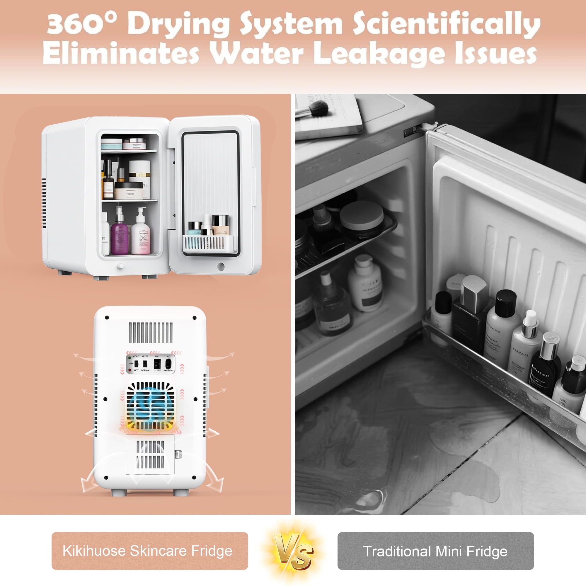 • No Condensation Mini Fridge: When a temperature differential exists between the interior and exterior of the mini bedroom fridge, condensation typically forms inside. Our skincare fridge is equipped with advanced 360°drying technology. It evaporates condensate into water vapor through the fan. This keeps the inside of the refrigerator dry, ensuring the stability and efficacy of your cosmetics.