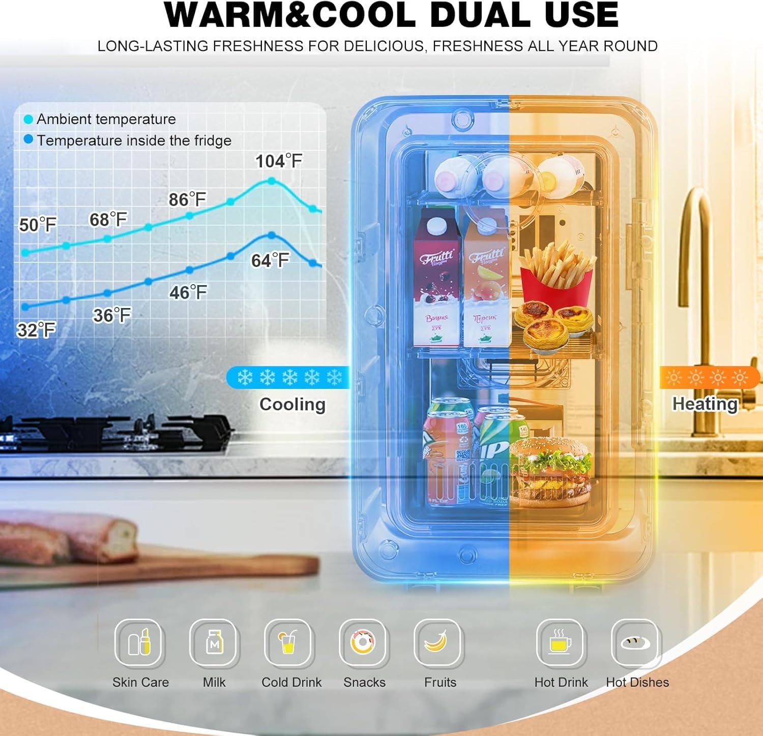 • Efficient Cooling: Utilizing a thermoelectric cooling system, Our mini beverage fridge is engineered to chill beverages 68°F below the ambient temperature. However, the extent of cooling achieved may vary based on the surrounding environment.