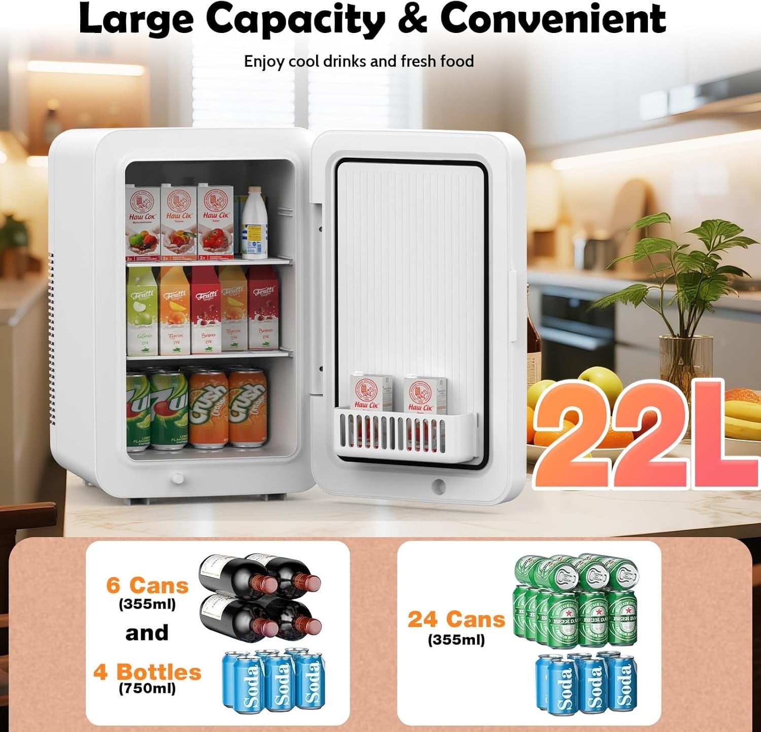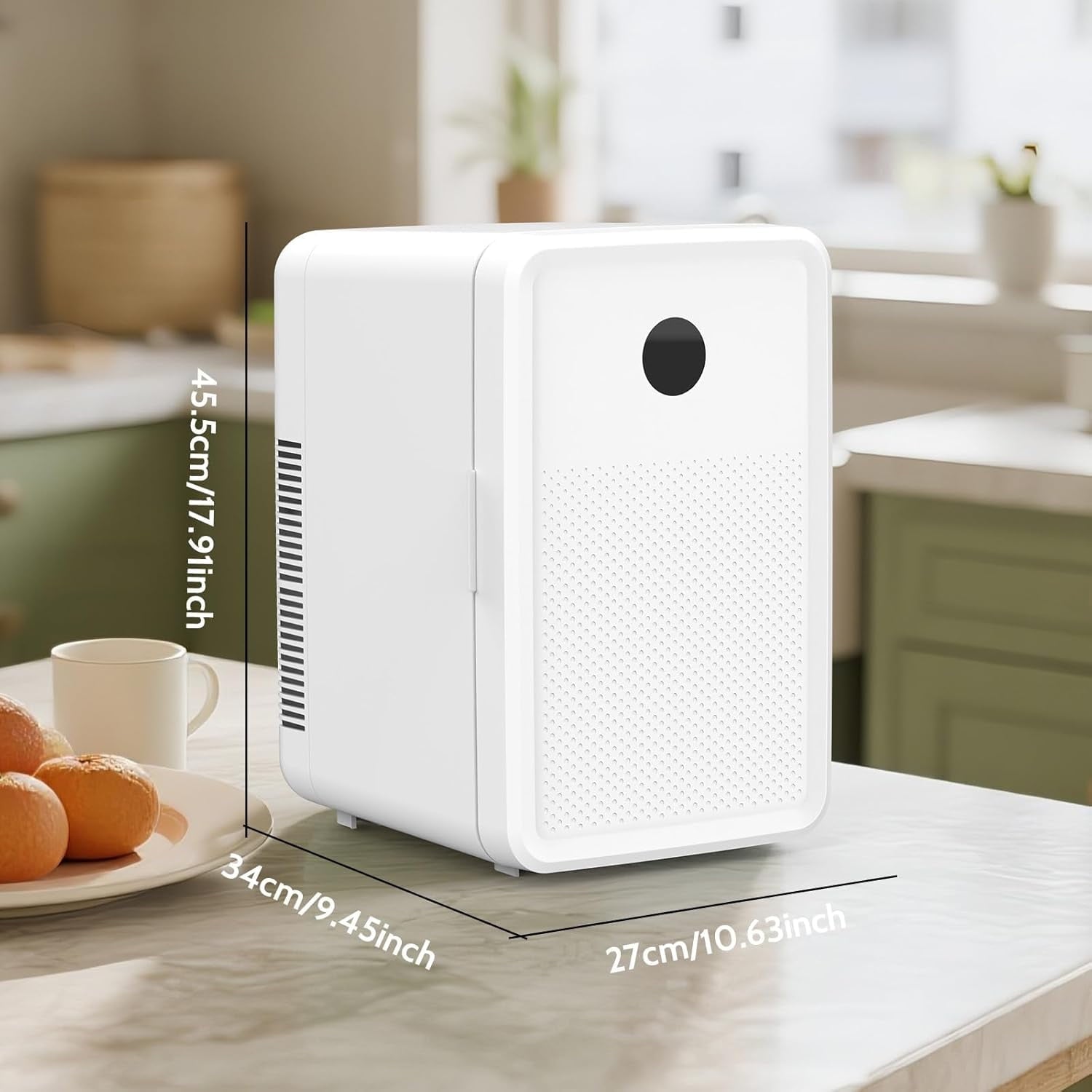 Key Features: Non-condensing Design – 360°drying technology, No condensation is produced, perfectly solving the leakage problem of traditional small refrigerators. Dual Power Options – Includes AC (110V) and DC (12V) power cords for use at home or in your car. Temperature Control – Cools up to 62°F below ambient temperature or warms up to 149°F. Ultra-Quiet & Energy-Efficient – Operates at just 25dB with 60W power consumption. Spacious & Organized – Holds 28 cans with 2 removable shelves for flexible storage. Durable & Stylish – High density EPS.
