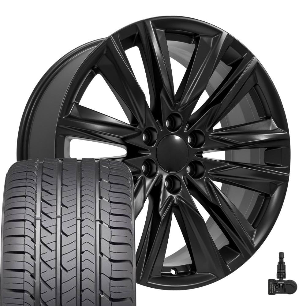 This listing is for a set of four CA91 satin black 22 inch replica 4869 wheels, 285/45R22 Goodyear Eagle Sport tires and TPMS sensors. Designed to fit GM trucks and SUV’s. Set will ship mounted and balanced with the TPMS installed. Please check our fitment tab for specific year-make-model applications and will-not-fit exceptions before ordering.