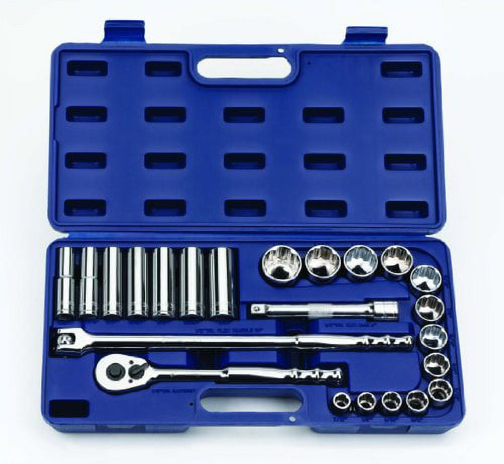23pc 1/2″ Drive 12-Point 1/2″ to 7/8″ Deep & 7/16″ to 1-1/4″ Shallow SUPERTORQUE™ Chrome Sockets & Drive Tools Set In A Packed In A Compact HDPE Carrying Case. Williams® # JHW50668