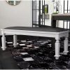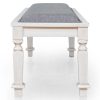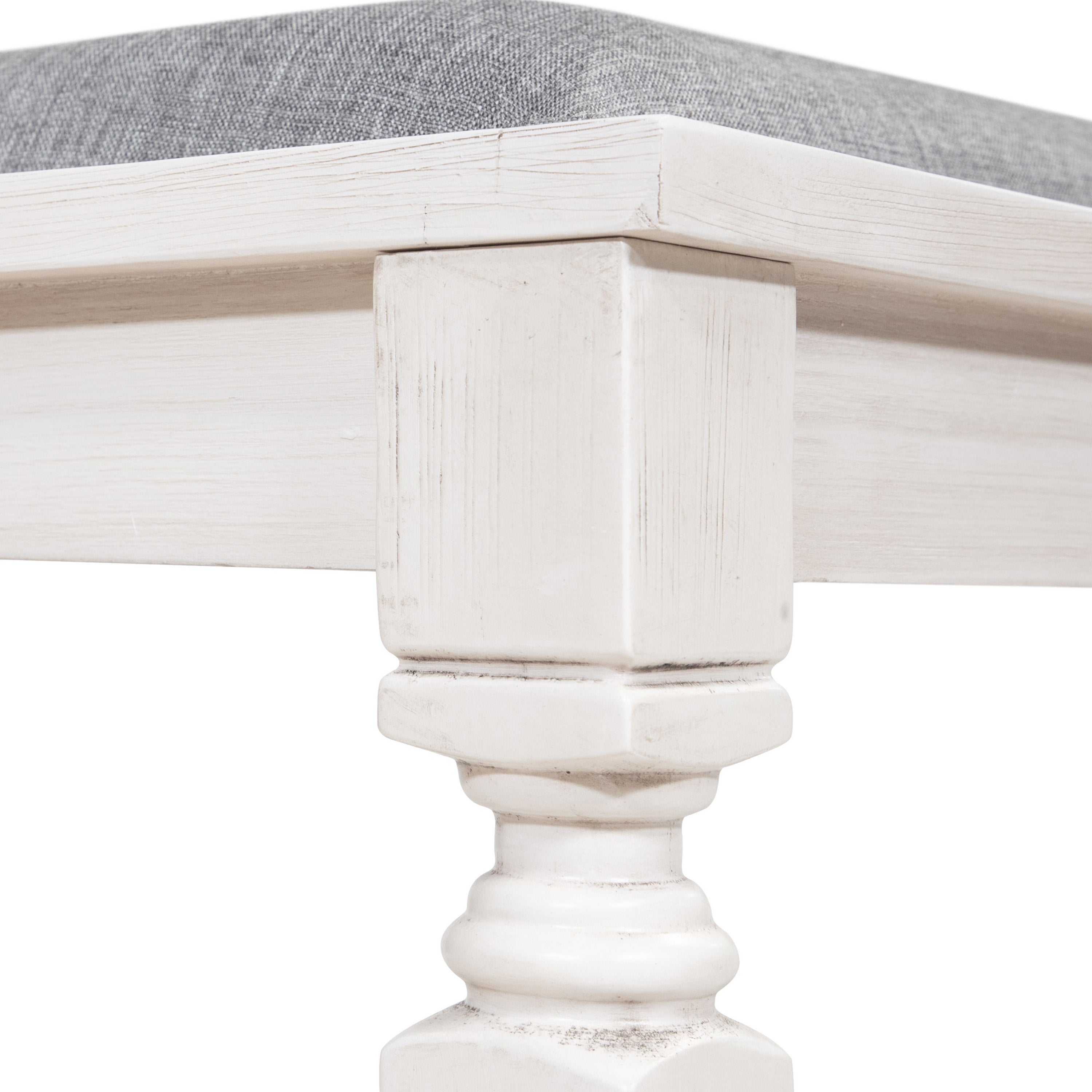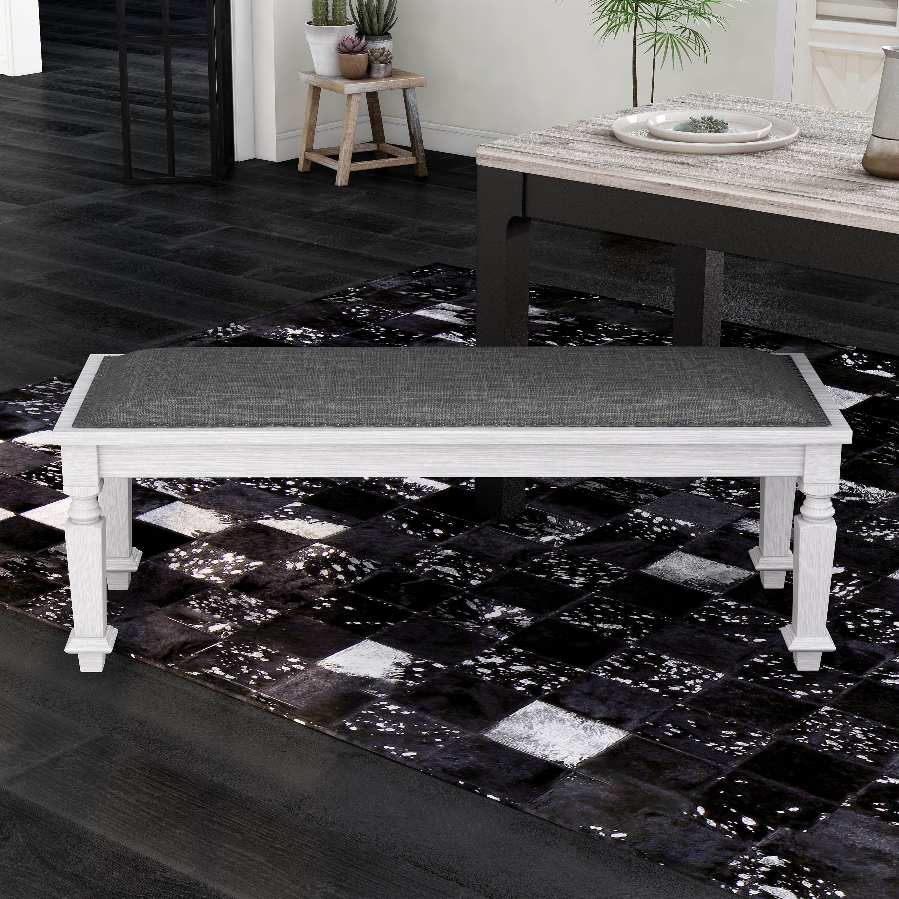 With its spacious seating capacity, this bench offers an inviting and comfortable space for you and your loved ones to gather around the dinner table. Meticulously crafted with exquisitely turned legs, the wood bench exudes a sense of timeless beauty. Its attention to detail and superior craftsmanship is evident in every aspect of its design. The antique white finish adds a touch of sophistication and charm, creating a visually stunning contrast against the wide gray fabric seat. Designed to accommodate two individuals, this bench not only provides ample seating but also enhances the overall aesthetic of your dining space.
