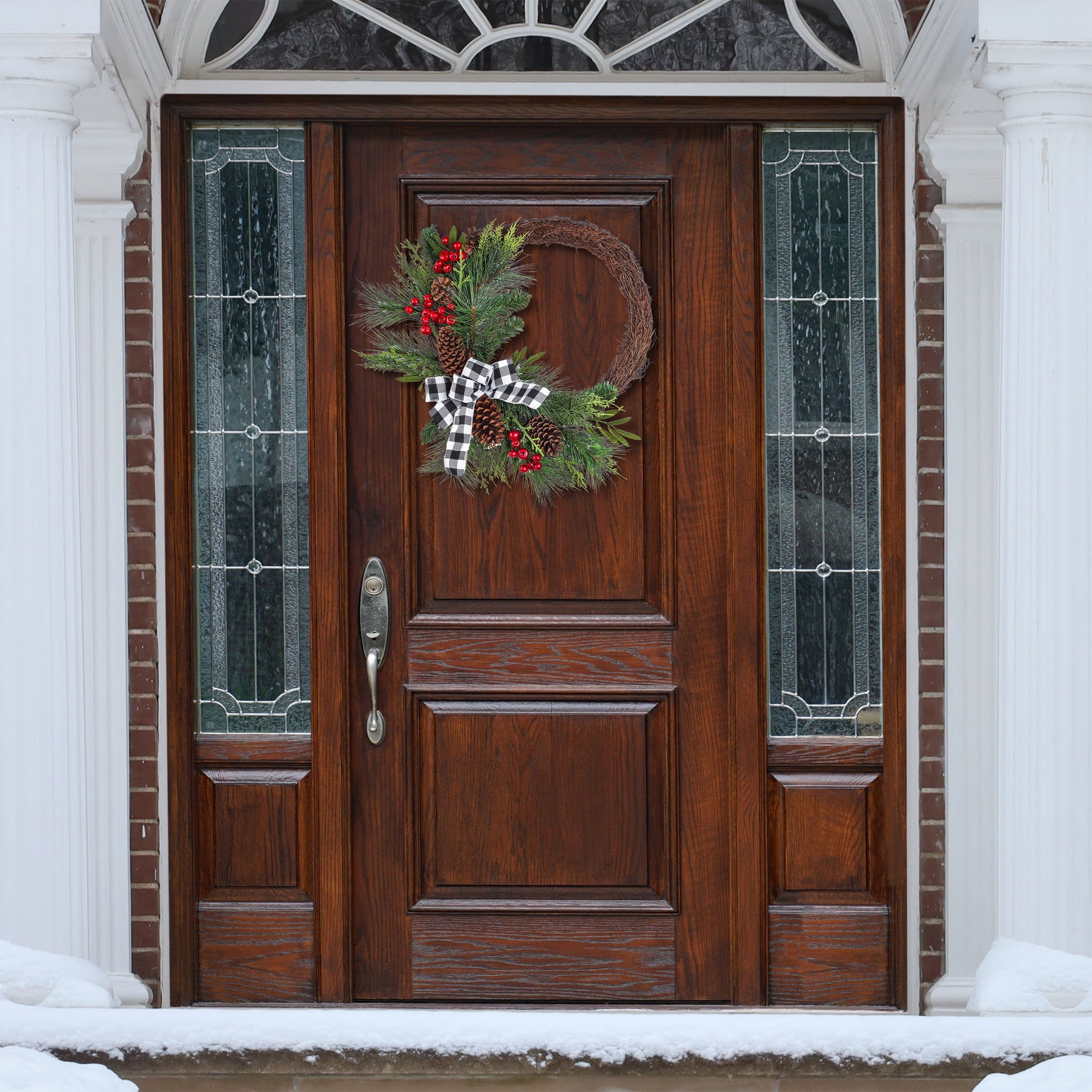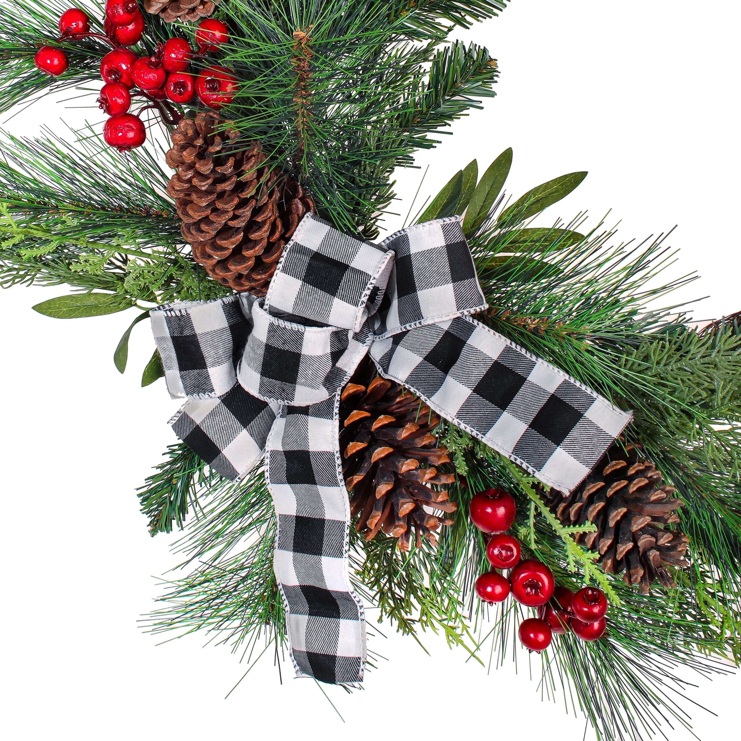24 in. Artificial Christmas Wreath, Mixed Pine Berries, Buffalo Plaid Bow, Pine Cones, Red Berries