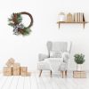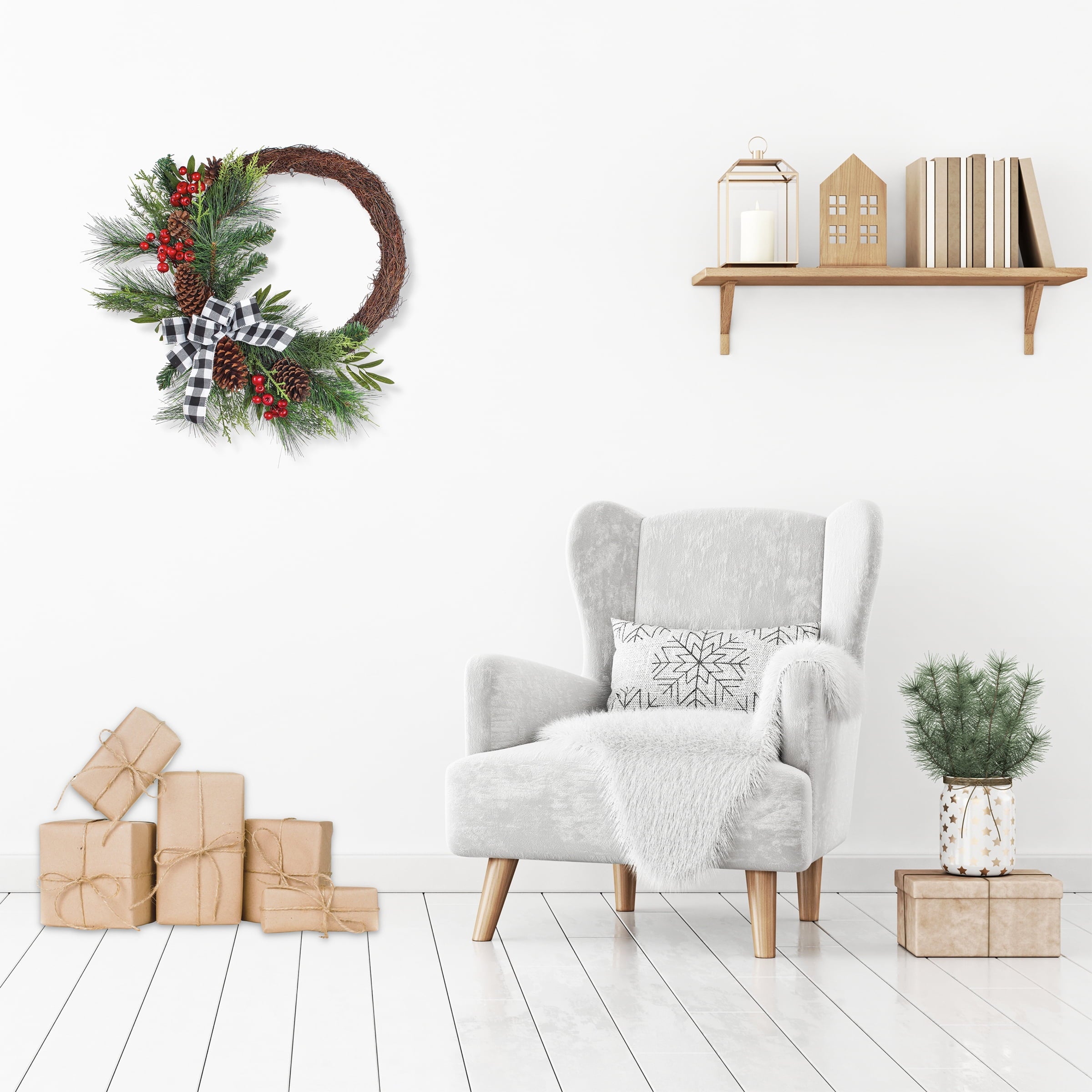This Mixed Pine Berries wreath features a mix of evergreen and bristle branch tips bursting from a thick woven branch ring base. Decorative trimmings include red berries, pinecones, and a black and white buffalo plaid bow. This unique and rustic holiday decoration can be displayed on door, wall, or window in indoor or covered outdoor locations.