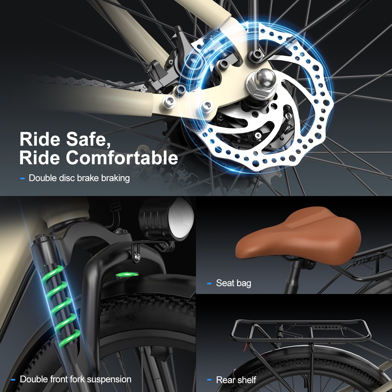 Tackle hills with confidence using the professional 7-speed gear system, while the front suspension fork absorbs bumps for all-day comfort. Stay safe with dual mechanical disc brakes (front & rear) and a bright LED headlight, plus a reflective rear taillight for visibility. The smart NFC-enabled LCD display lets you unlock your bike instantly and monitor speed, battery, and distance with a tap. Perfect for daily commutes or weekend adventures!
