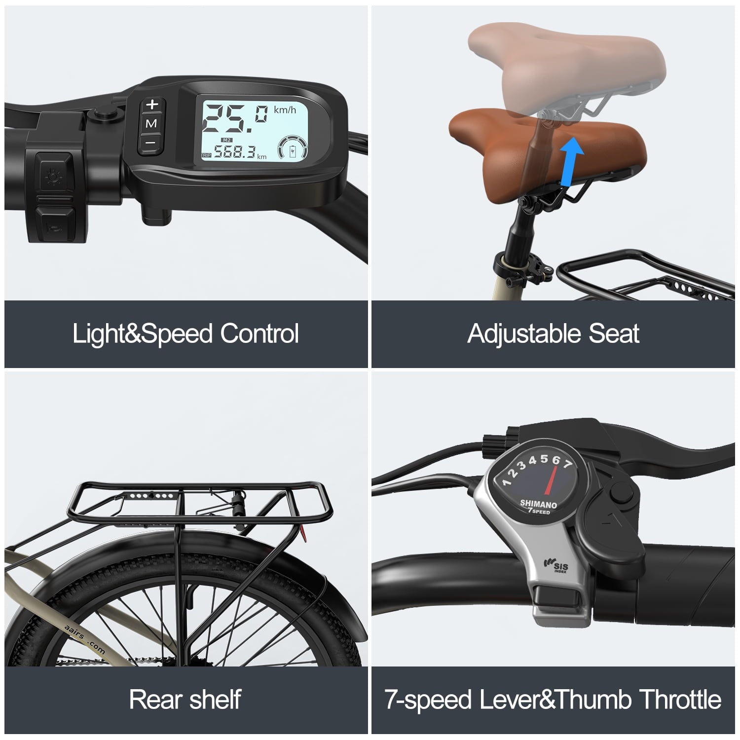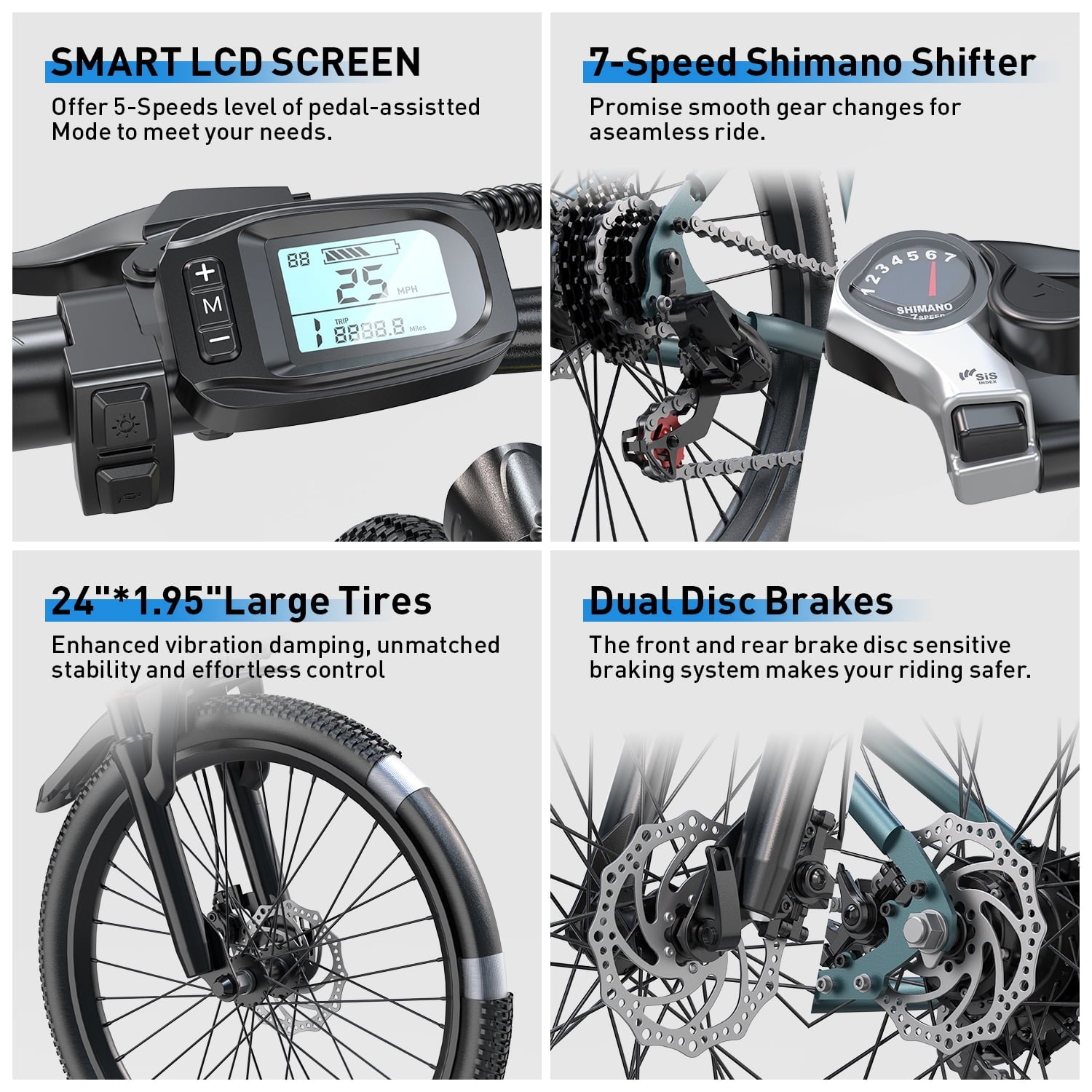- Shimano 7-Speed Gears for effortless hill climbs