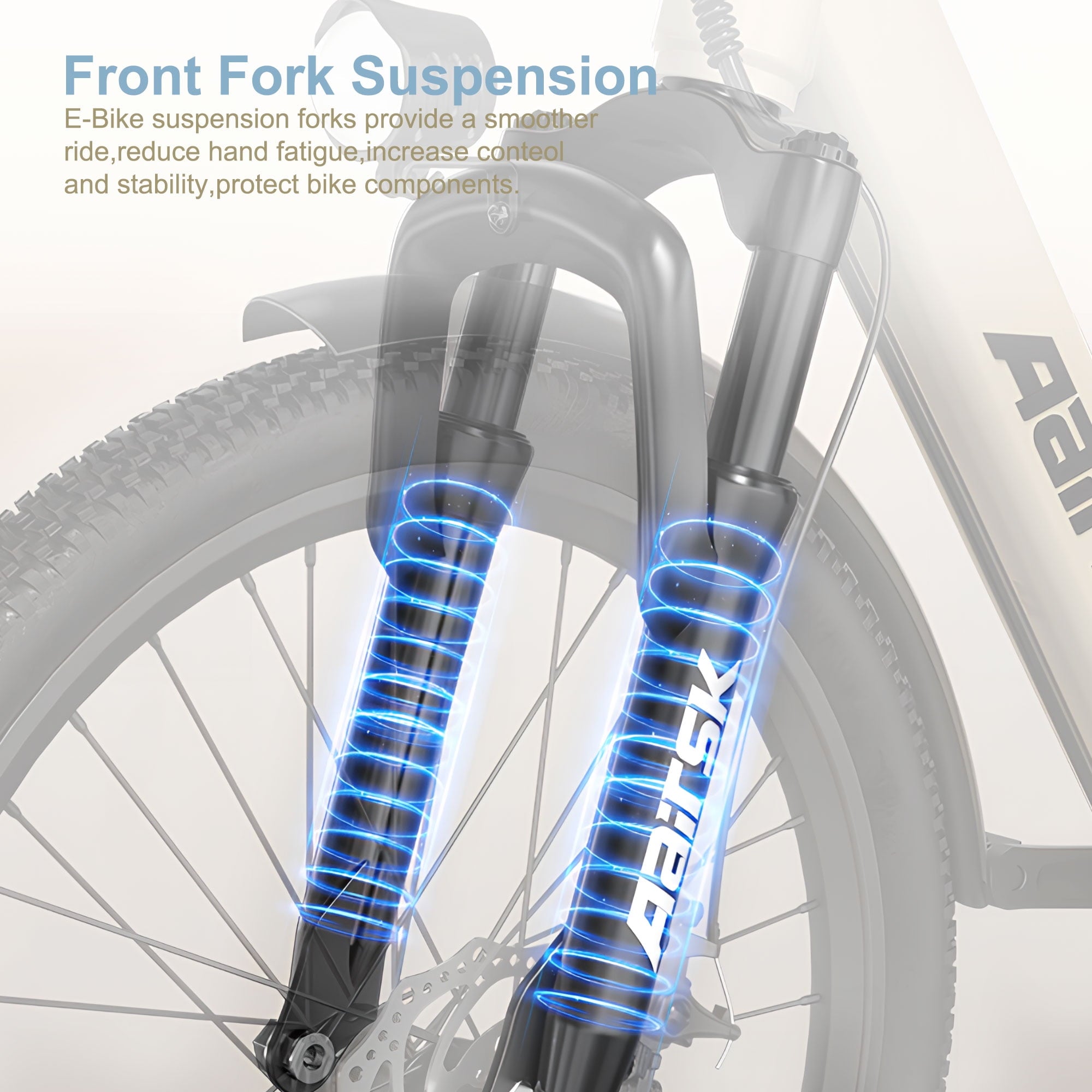 • Front suspension fork absorbs road shocks and bumps for increased comfort.