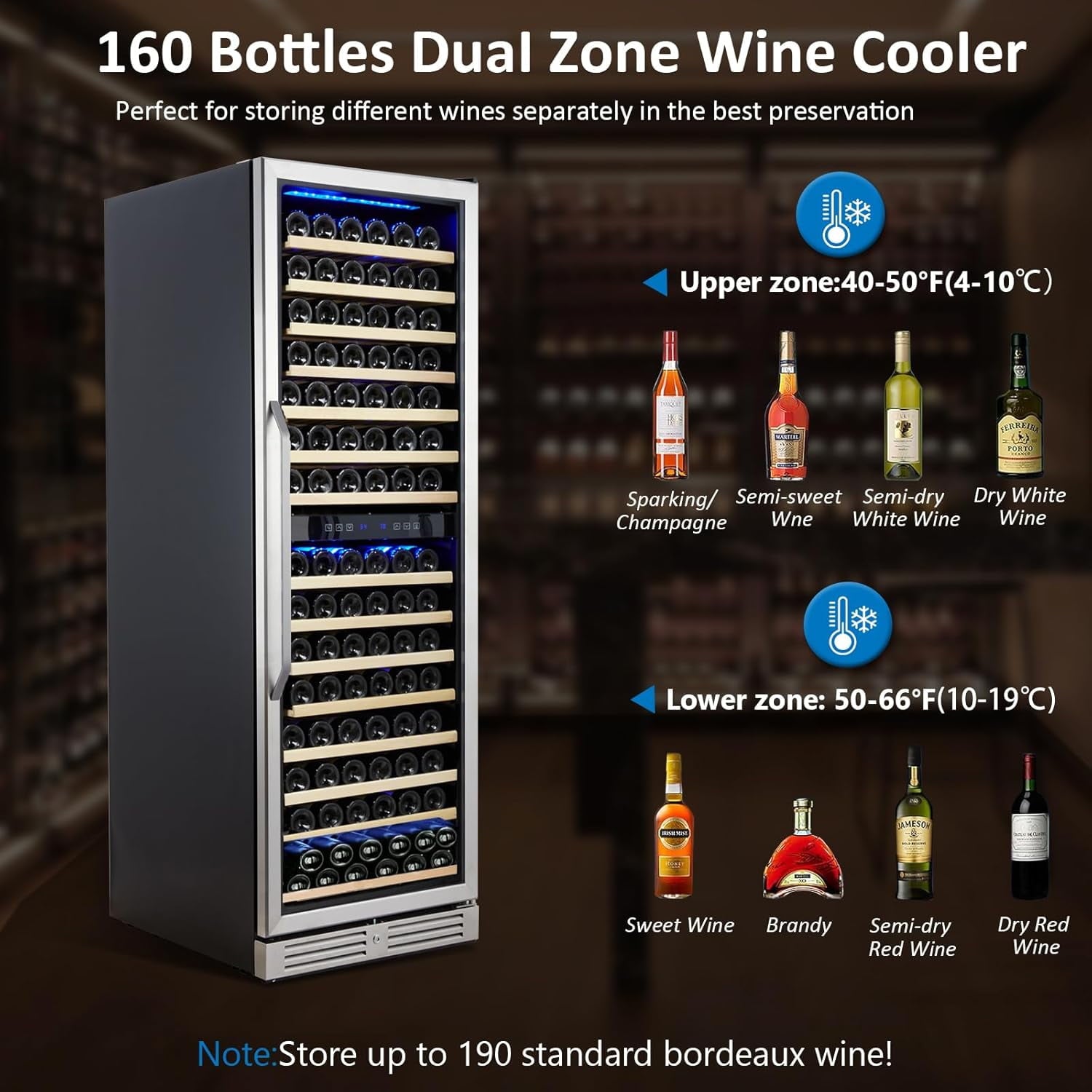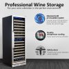 - 160 Bottle Capacity:Dual zone wine cooler can store up to 160 (standard Bordeaux wine bottles). It is equipped with 15 beech removable wooden, adjust the height of each layer, which can easily store bottles of different shapes and sizes