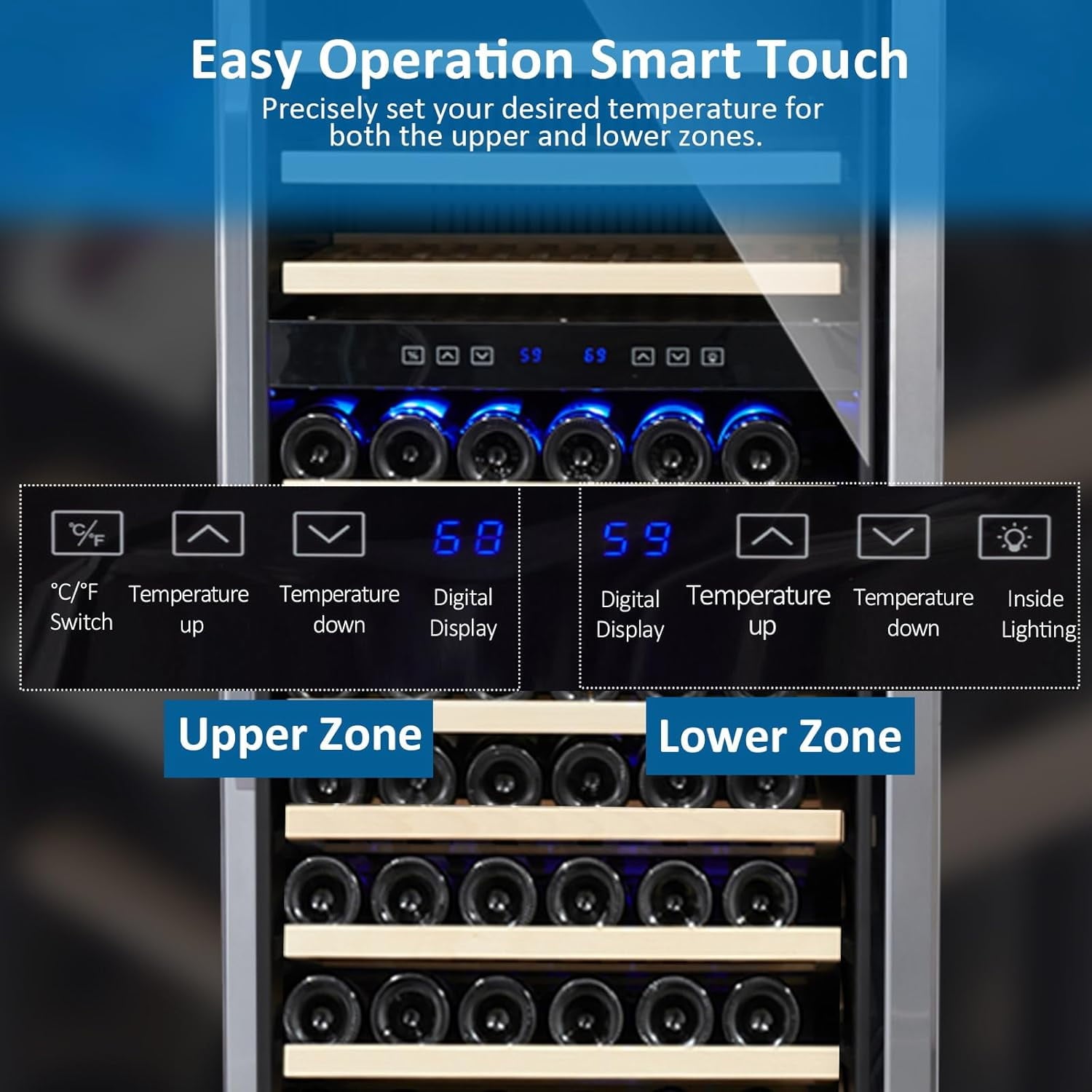 - Dual Zone Temperature Control:Customize the temperature of your wine by touching the control panel. Upper zone 40-50°F, lower Zone 50-66°F to make it suitable for storing different wines. The internal air circulation system ensures even distribution, preventing significant temperature differences between top and bottom shelves, and creating a frost-free environment160 Bottle Capacity:Dual zone wine cooler can store up to 160 (standard Bordeaux wine bottles). It is equipped with 15 beech removable wooden, adjust the height of each layer, which can easily store bottles of different shapes and sizesQuiet and Efficient Cooling:The powerful compressor and internal air-cooled system ensure that air circulates evenly throughout the fridge delivering powerful, fast, and stable cooling while operating noise levels kept under 40 dB, you’ll enjoy a peaceful home environment. Meanwhile, the front door is made of double-layer tempered glass, which protects your drinks from harmful UV raysBuilt-in or Freestanding Installation:The 24-inch wide refrigerator has a front vent design, so there is no need to worry about air circulation and heat dissipation which makes it can be installed both under a counter built-in or freestanding, making it suitable for various spaces such as kitchens, bars, and wine cellars. The dimension is: 23.4*26.8*69.6 in(W*D*H)Upgraded Design:(1) Reversible swing door for 2-way door opening and closing; (2) Smart Temperature Memory Function enables the refrigerator to restore to the temperature history you set last time; (3) Adjustable Legs to keep the wine bottles perfectly level; (4) Safety Lock that can effectively protect your collection when needed; (5) Blue LED Lighting helps you retrieve your wine even in dimly lit environments