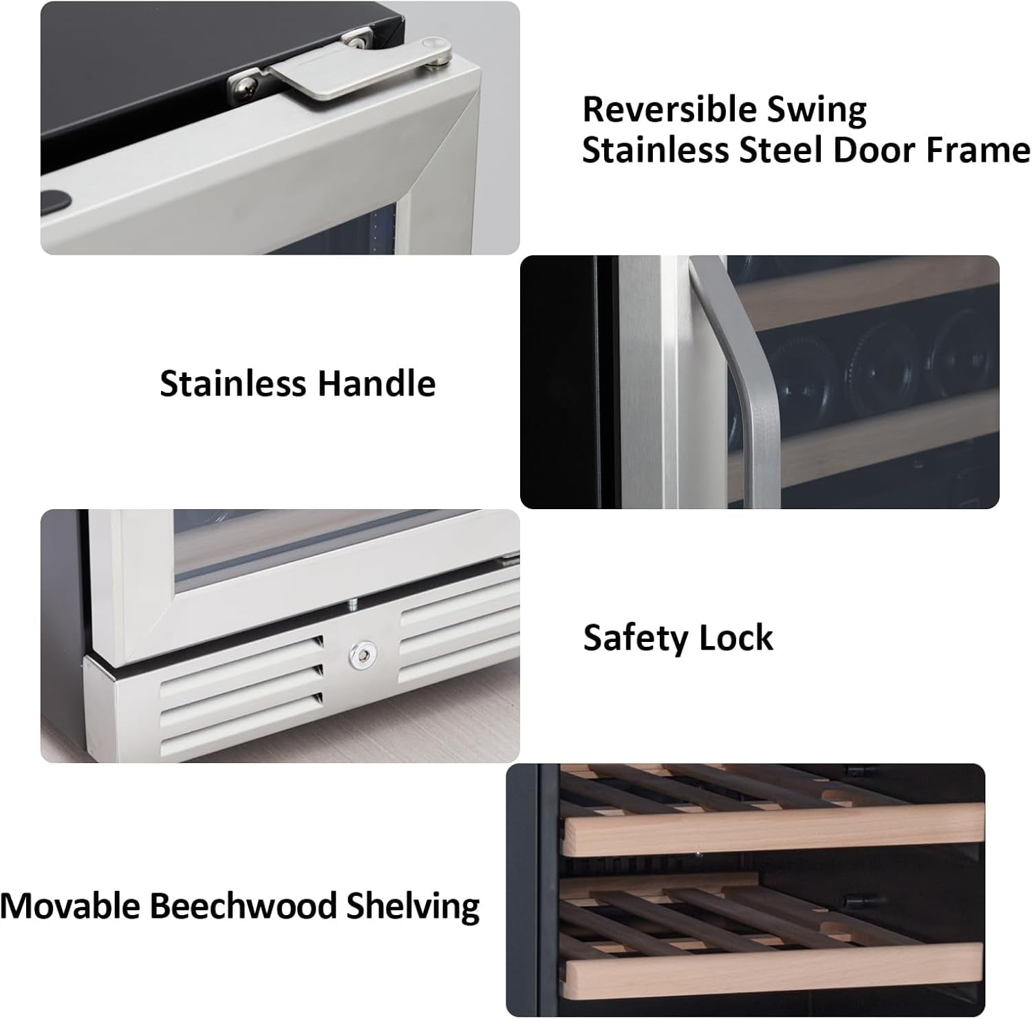 - Upgraded Design:(1) Reversible swing door for 2-way door opening and closing; (2) Smart Temperature Memory Function enables the refrigerator to restore to the temperature history you set last time; (3) Adjustable Legs to keep the wine bottles perfectly level; (4) Safety Lock that can effectively protect your collection when needed; (5) Blue LED Lighting helps you retrieve your wine even in dimly lit environments