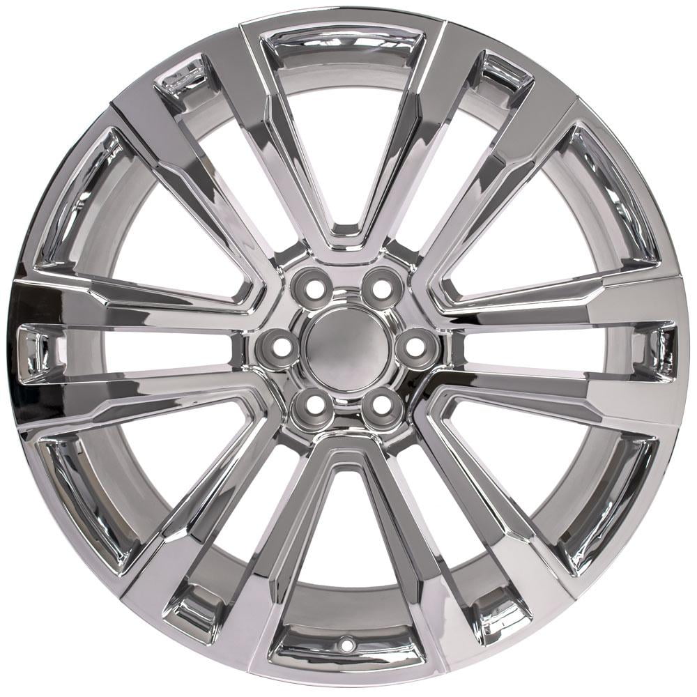 These CV44 replica wheels are 24×10 chrome rims designed to fit the GMC Sierra 1500 Denali and other compatible vehicles. Please check our fitment tab for specific year-make-model applications and will-not-fit exceptions before ordering.