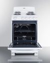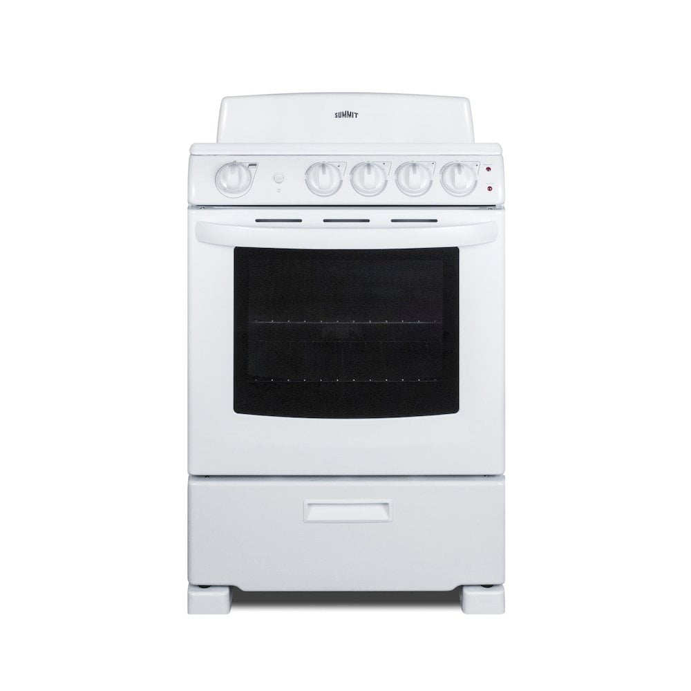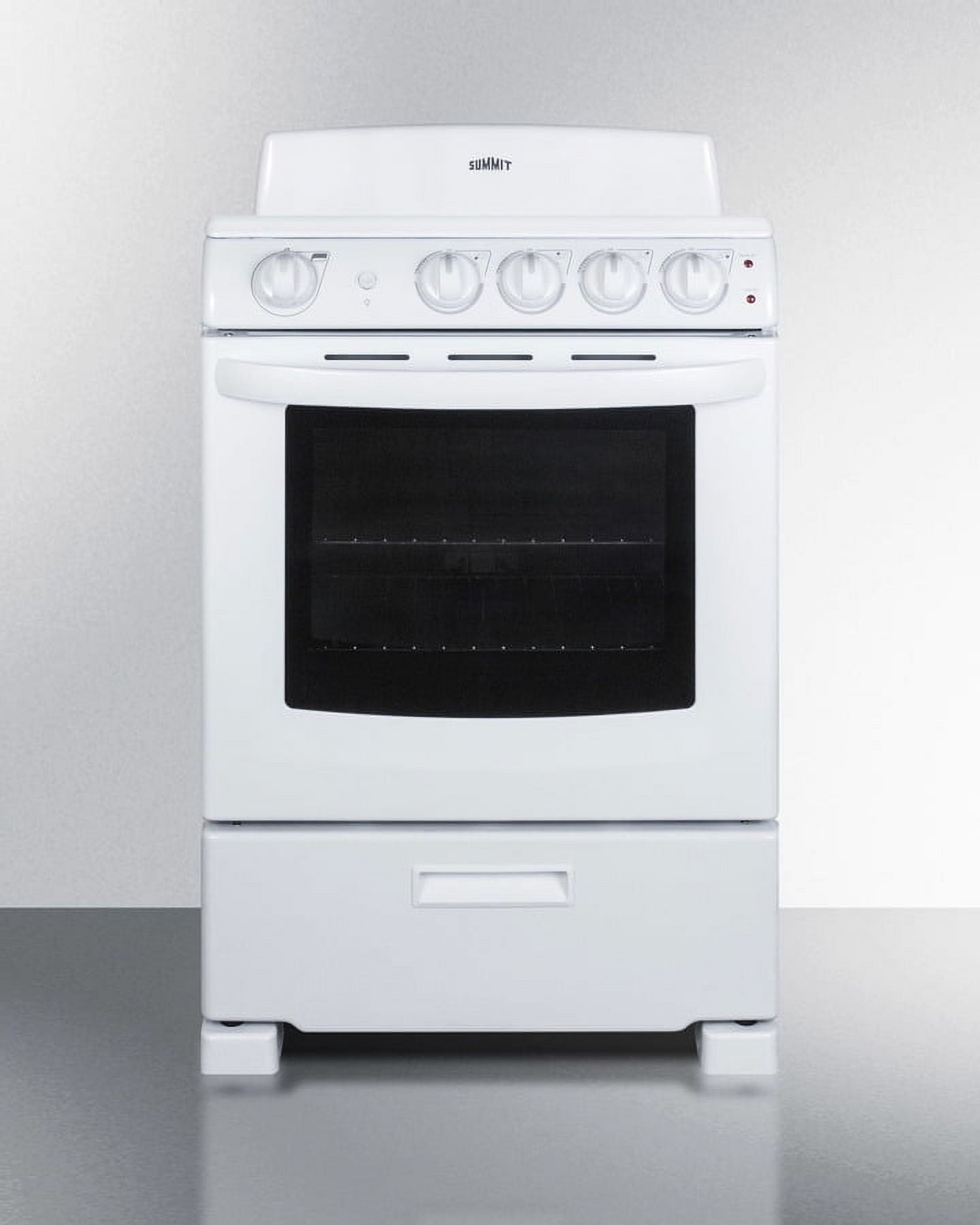 SUMMIT brings outstanding value to small kitchens with fully featured electric ranges in 24″ wide fits. Made in North America, the RE2411W is a 220V electric range designed for 24″ wide spaces. One 8″ and three 6″ coil burners include removable chrome drip pans for easy cleaning. For added safety, each coil is equipped with a sensor that will automatically cycle the element off if it reaches dangerous flashpoint temperatures. Heating will resume automatically. All cooking controls are located upfront on push-to-turn knobs for safe and easy use. Indicator lights illuminate when the burners and oven are on. The RE2411W features a large oven window with an interior light to make it easy for users to monitor their cooking. Inside, the 2.9 cu.ft. interior is made from durable porcelain and includes two adjustable racks. The waist-high broiler is conveniently located inside, letting you finish your cooking without transferring contents to an inconvenient drop-down compartment on the floor. The lower compartment is a slide-out storage drawer for added convenience. The RE2411W comes in a white exterior finish with color-matched knobs and handle. With its slim fit and user-friendly features, this unit is the ideal choice for space-challenged kitchens on a budget.